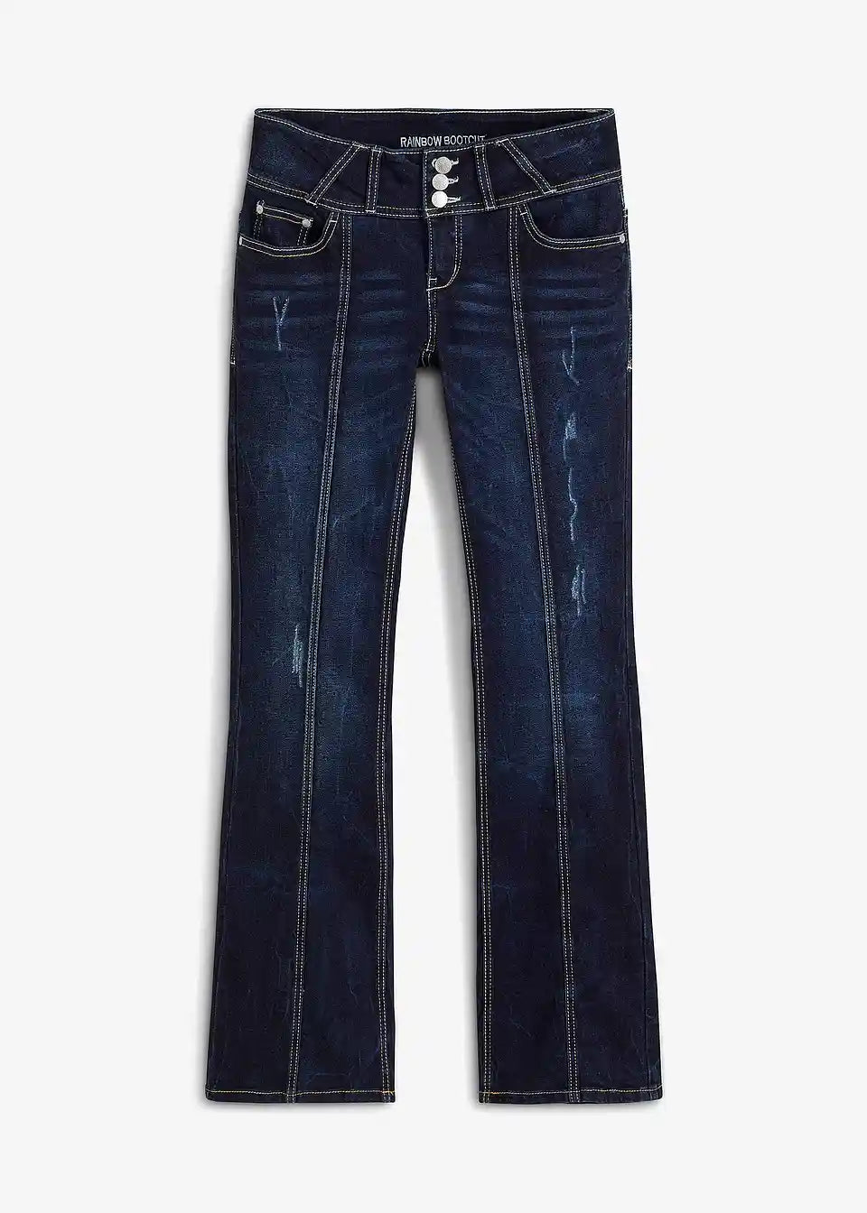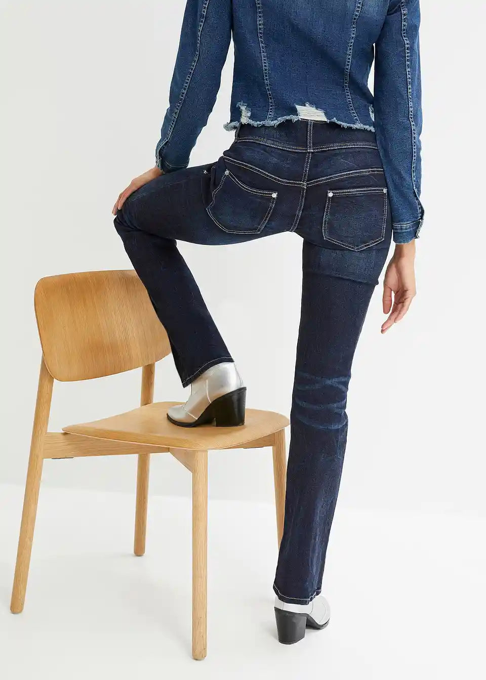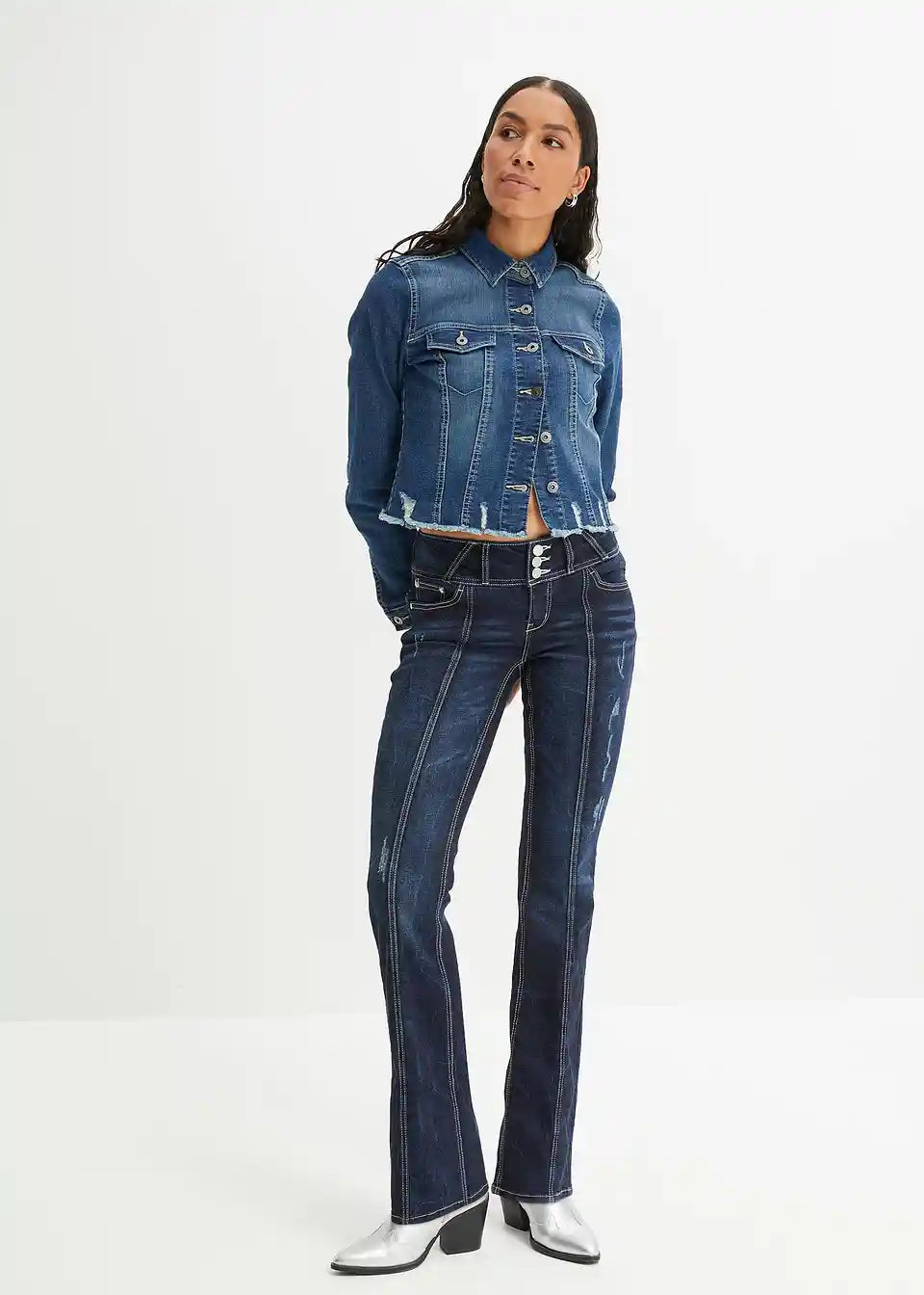 S svojim modnim videzom te Bootcut-Jeans pritegnejo pozornost in popestrijo garderobo. Izrazit šiv ob strani daje hlačam kul izgled. Širok pas in bleščeči gumbi spredaj poudarjajo trendovski dizajn. Zaradi razširjenih hlačnic so jeans hlače idealne za nošenje čez gležnjarje. Odlično se dopolnjujejo z zgornjim delom in čevlji s peto.