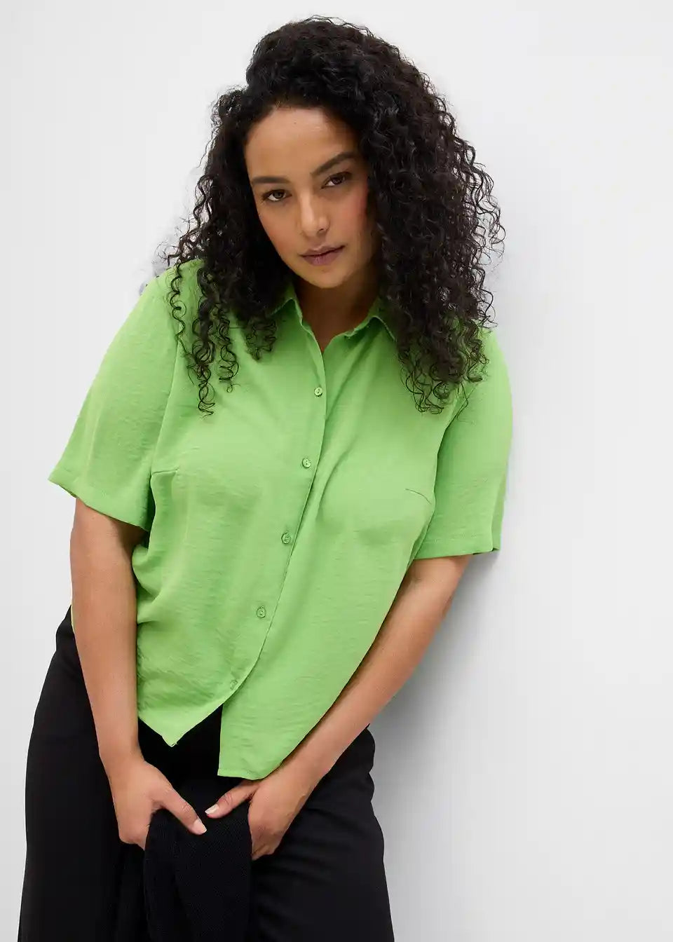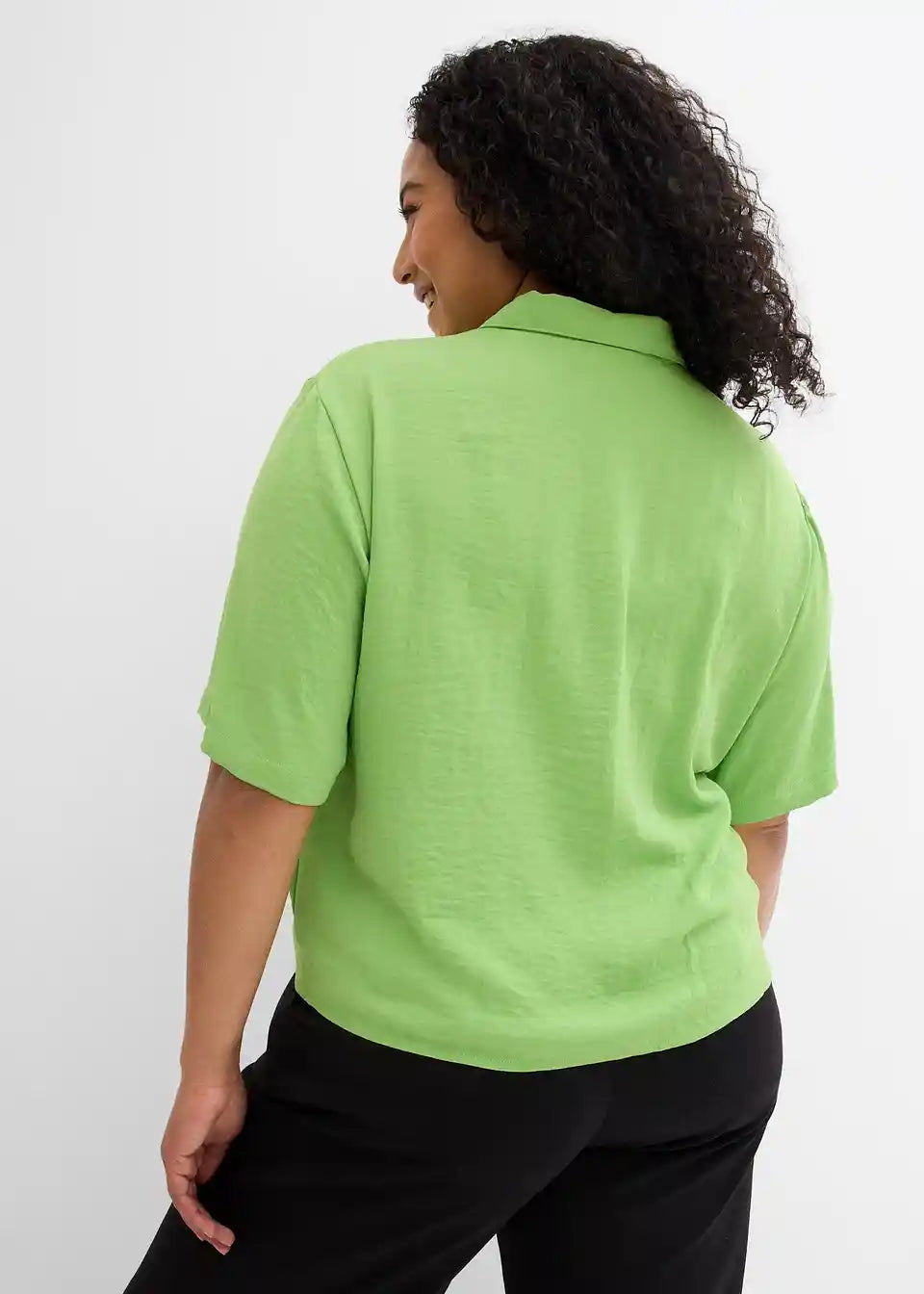 Rahlo skrajšana, kvadratna srajčna bluza s polovičnim rokavom, zavihanim ovratnikom in zapenjanjem na gumbe.