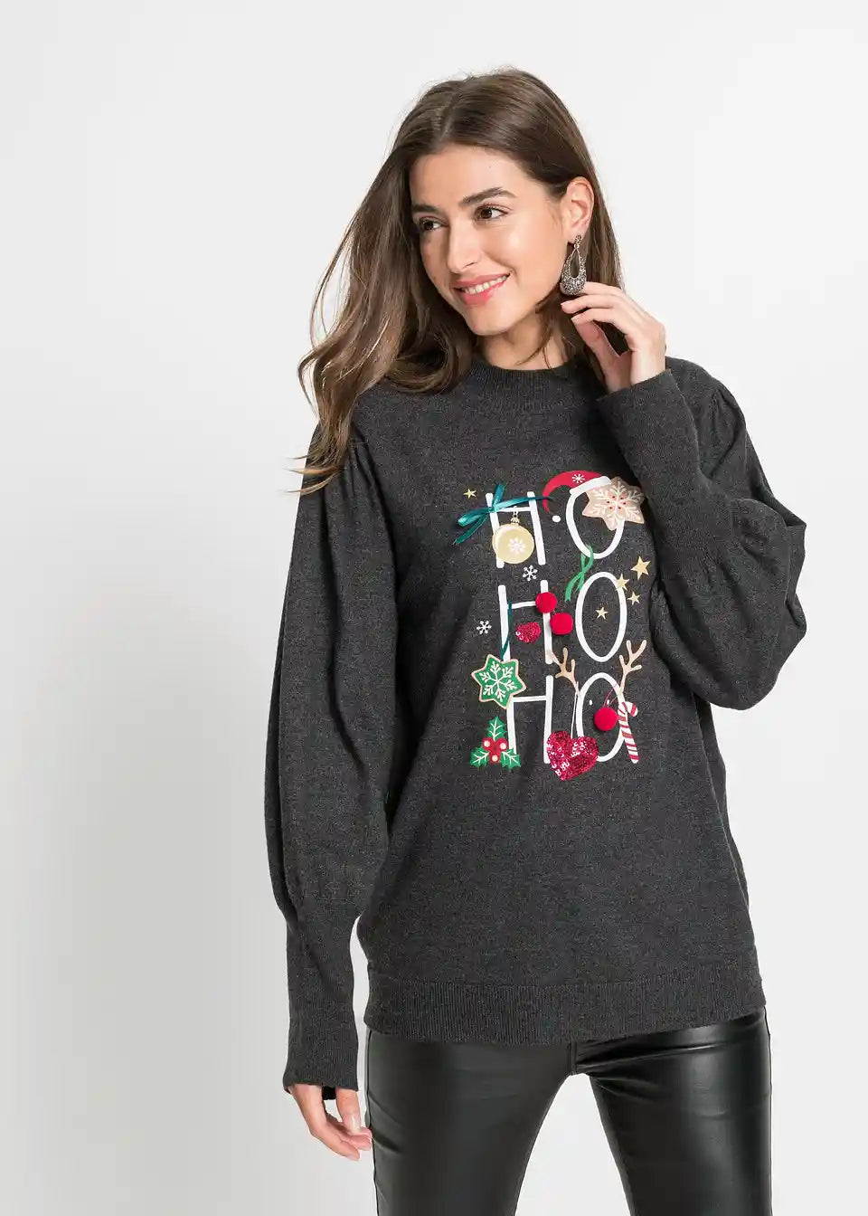 Mehak pulover z božičnim motivom in balonastimi rokavi