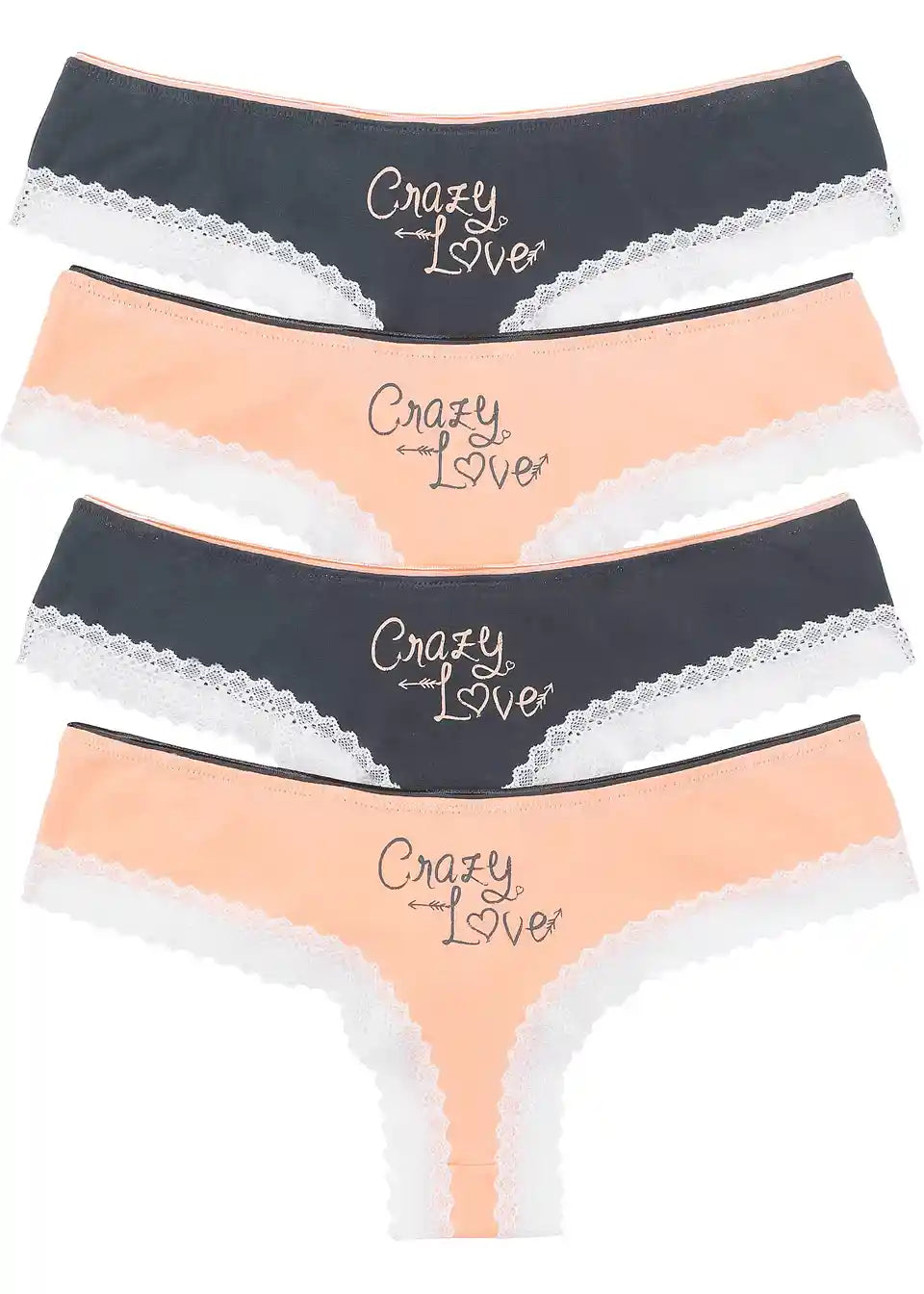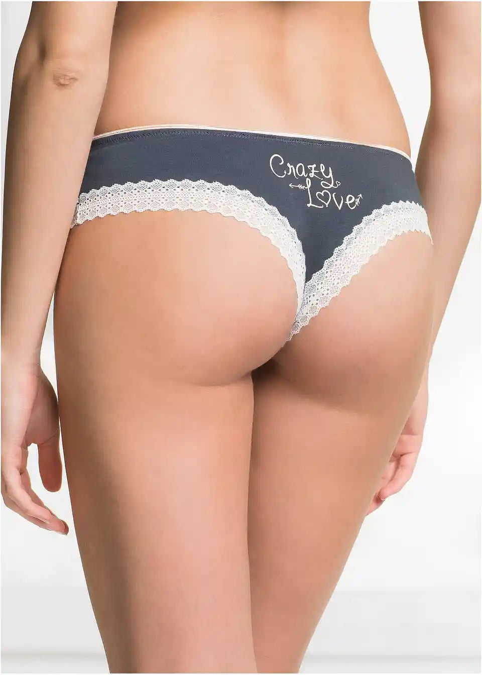 »So crazy in love« z udobnim Brazil Slip v praktičnem multipack paketu. Njegov svež in enostaven videz se popolnoma ujema z živahnim napisom na sprednji strani. Stilna dekorativna mašnica na elastičnem pasu ter kontrastna kvačkasta čipka vzdolž izrezov za noge poudarjata simpatično sporočilo. Posebnost tega slip-a je Brazil cut, ki seksi poudari obline zadnjice. Must-have za vse dekleta, ki obožujejo vznemirljivo perilo s faktorjem udobja.