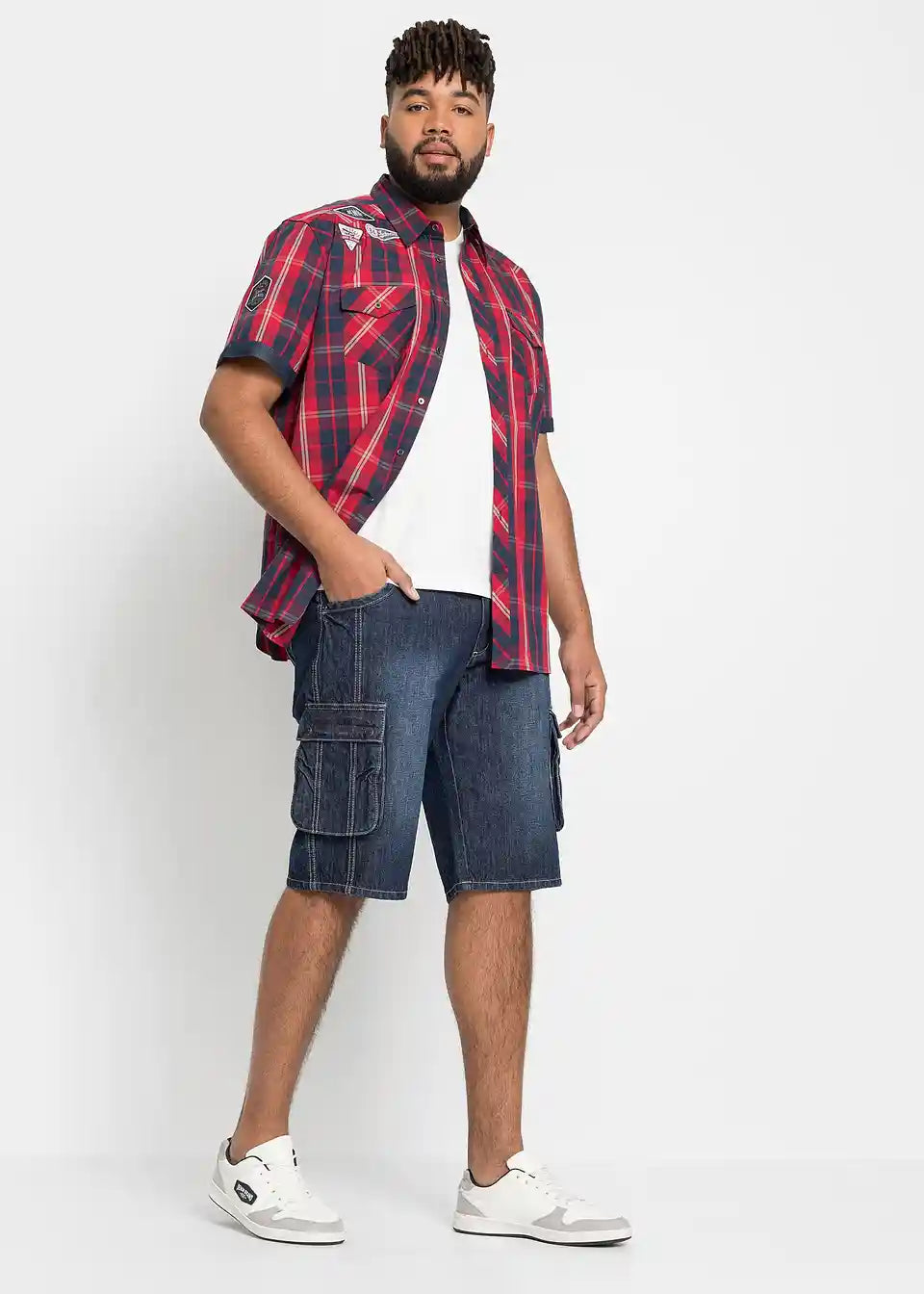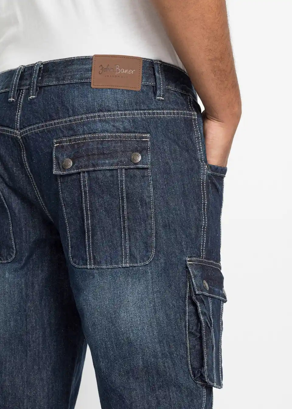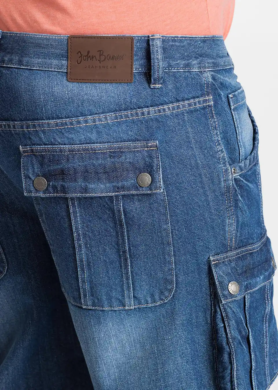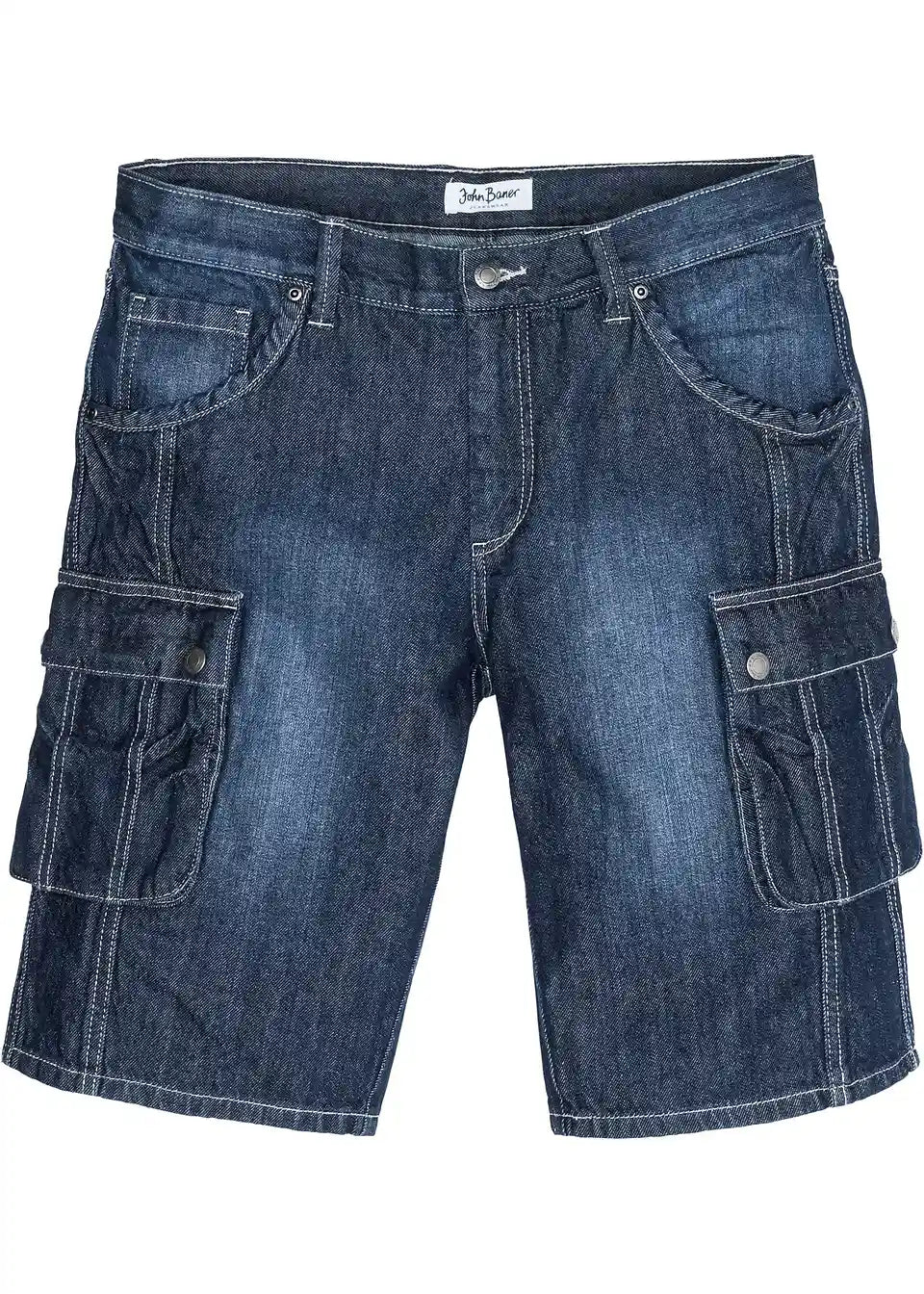 Moške Cargo-Bermuda znamke John Baner se s svojim rahlo spranim videzom denima in kontrastnimi šivi predstavijo v stilski luči. Našiti stranski žepi na hlačnicah in zadnji žepi s poklopcem ter gumbnimi detajli poskrbijo za sproščen videz. Klasičen kroj z ravnimi hlačnicami zagotavlja udobno nošenje v vsakdanjem življenju. V kombinaciji z majico z napisom je casual outfit za prosti čas popoln.