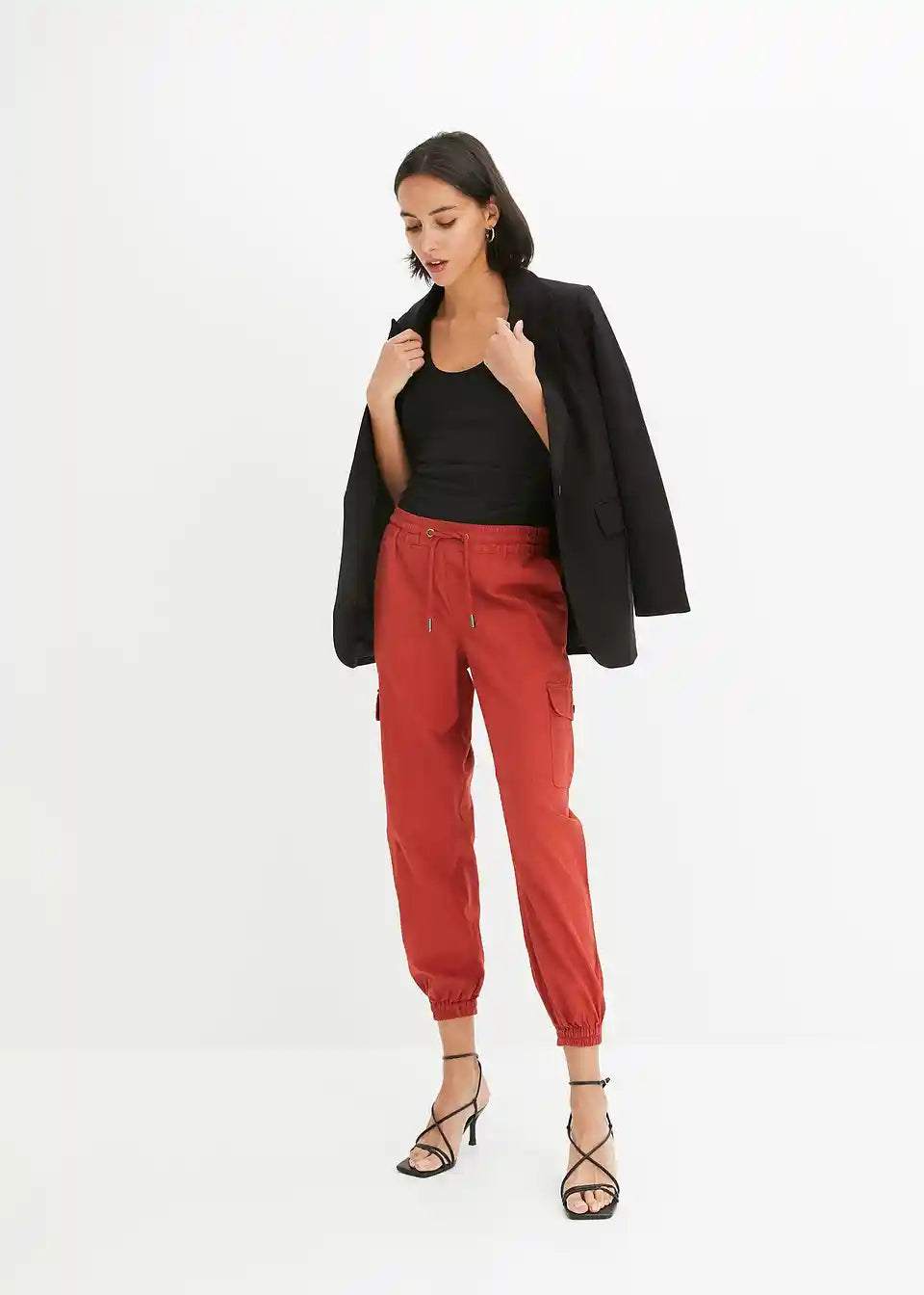 Sproščene hlače za oblačenje z elastiko po obsegu, stranskimi žepi in našitimi stranskimi žepi, elastika na robu hlačnic