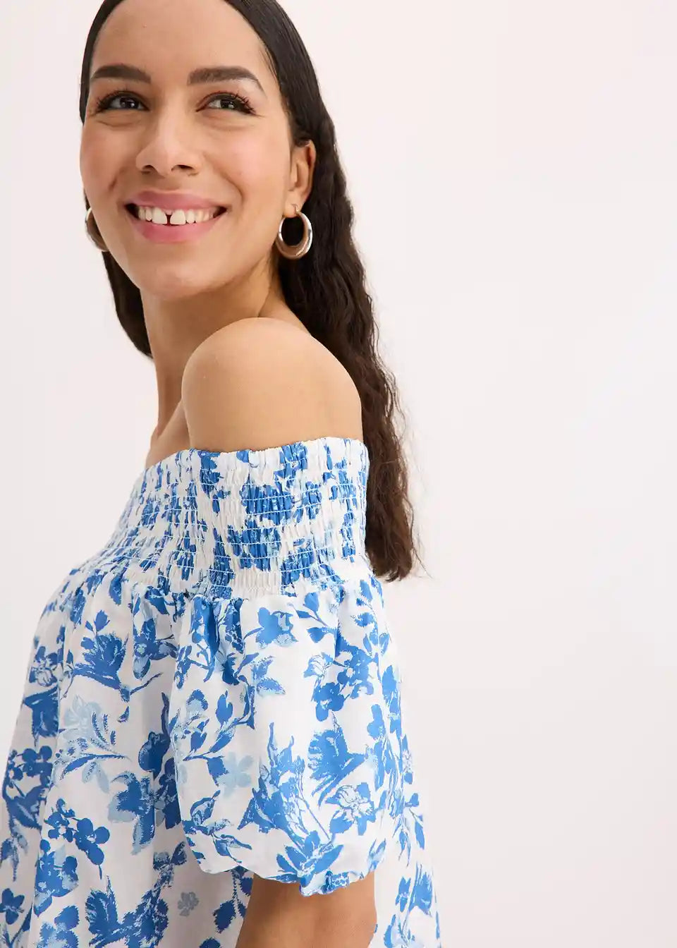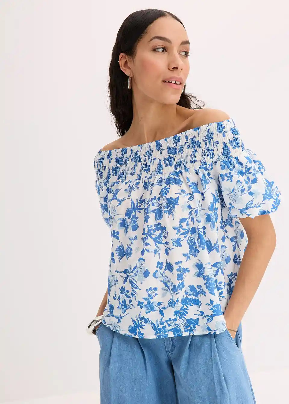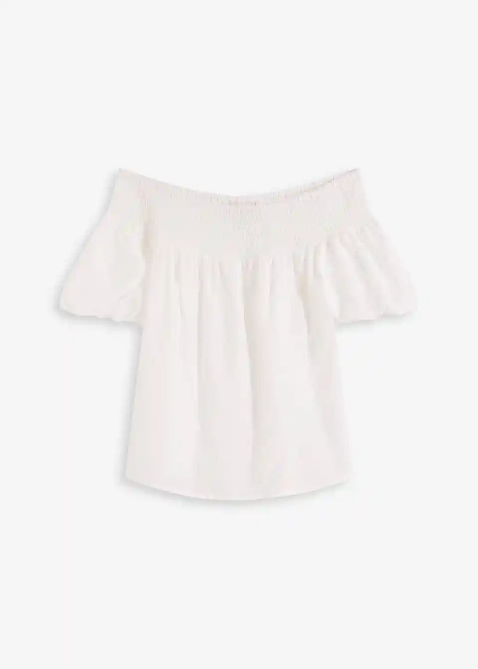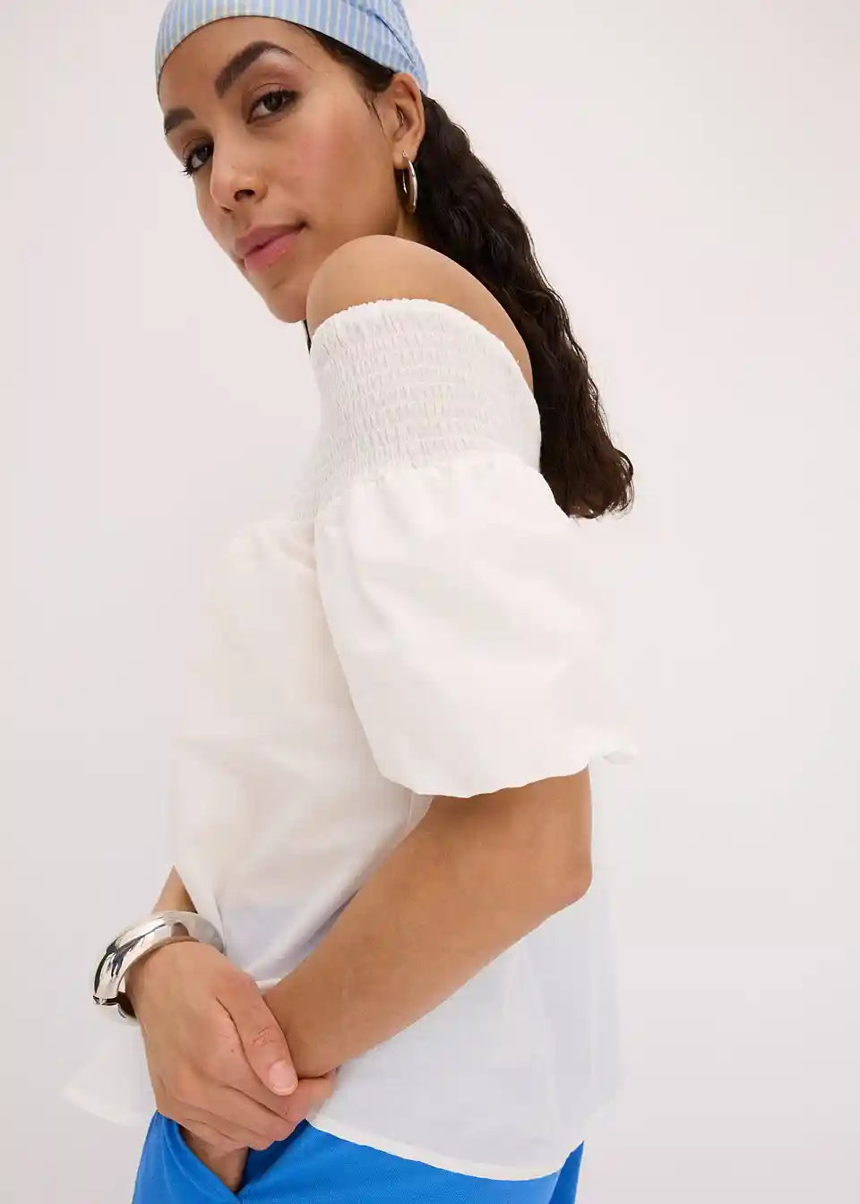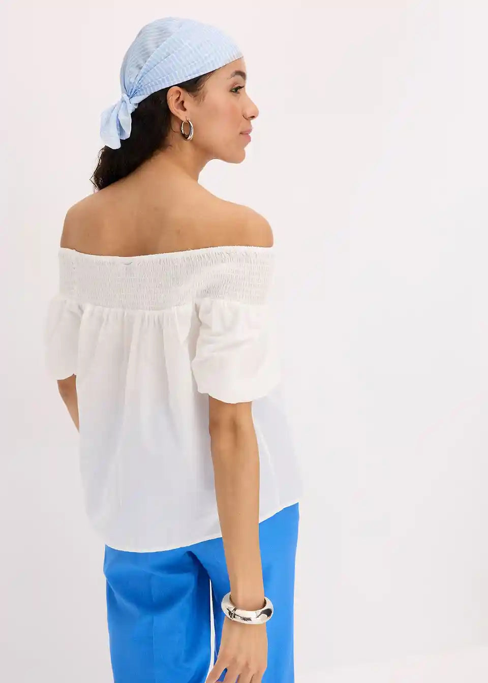 Bluza s širokim nabranim izrezom Carmen in napihnjenimi rokavi