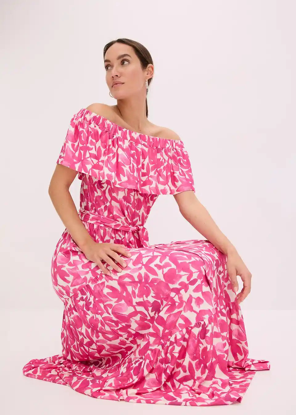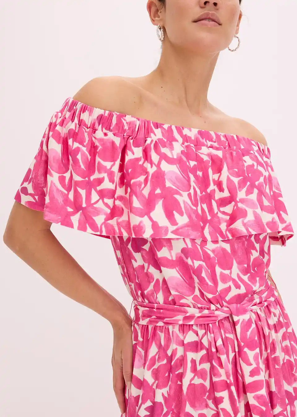 cvetlično potiskana midi obleka s Carmen izrezom in volančki
