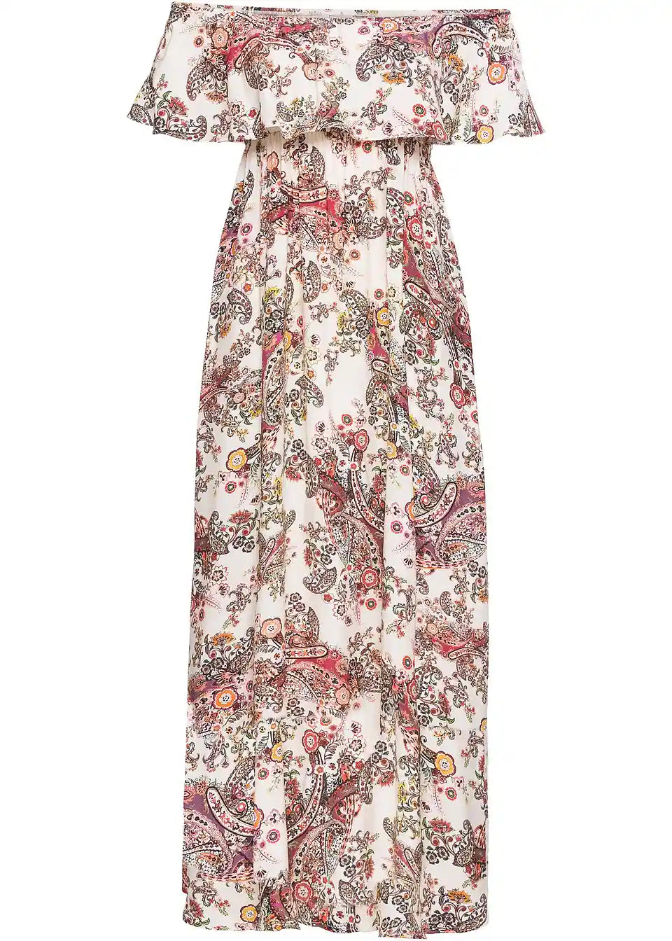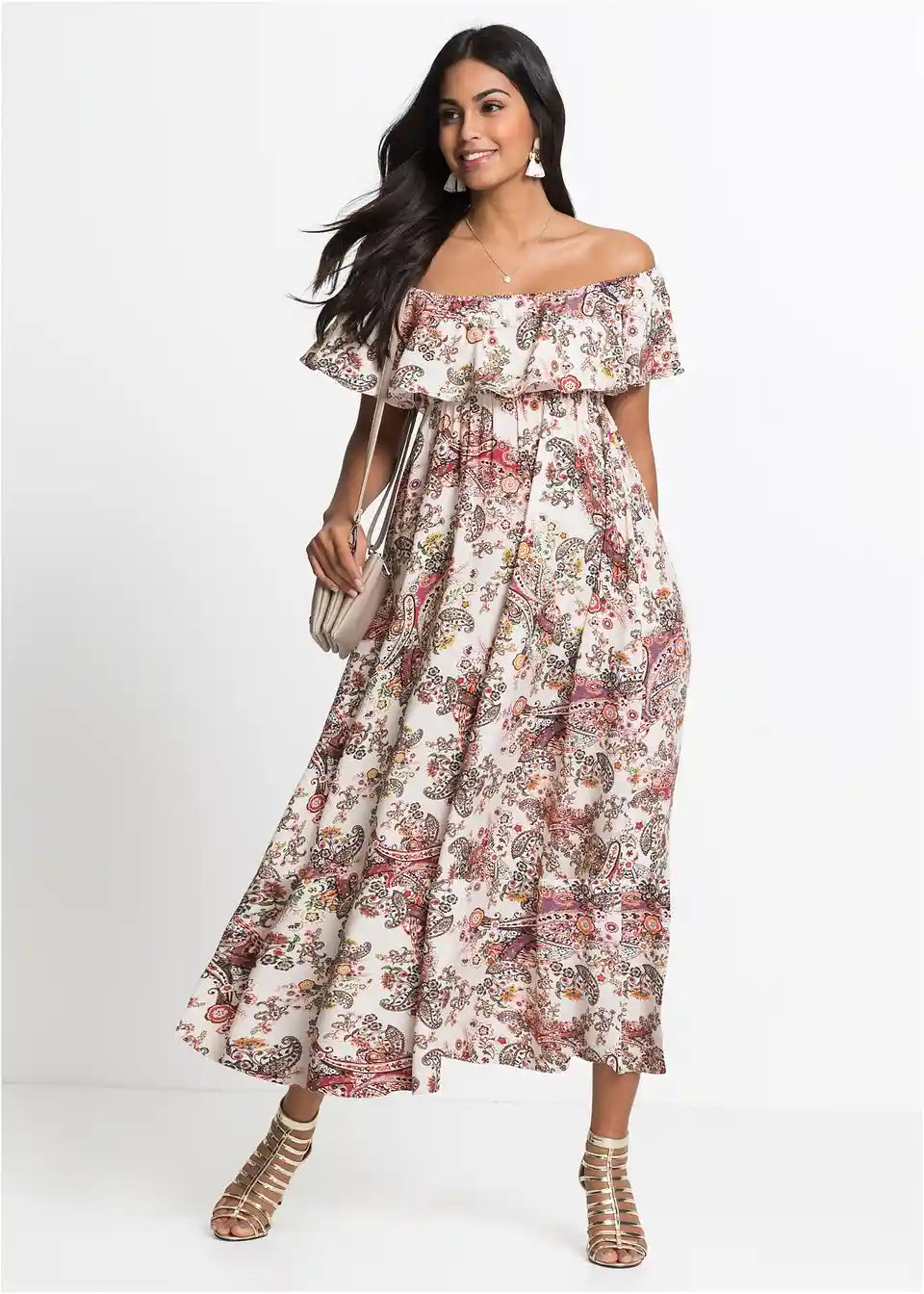 Ta lepa Carmen obleka znamke BODYFLIRT izžareva lahkotnost in očara s svojim romantičnim slogom. Dolga obleka z ljubkim izrezom Carmen poudari ramenski predel in jo je mogoče nositi tudi na ramenih. Rokave in izrez krasi velik volan, ki čudovito poudari igriv dizajn obleke. V pasu ima obleka ožji kroj, ki lepo poudari sredinski del telesa, medtem ko lahkotno pada okoli nog.