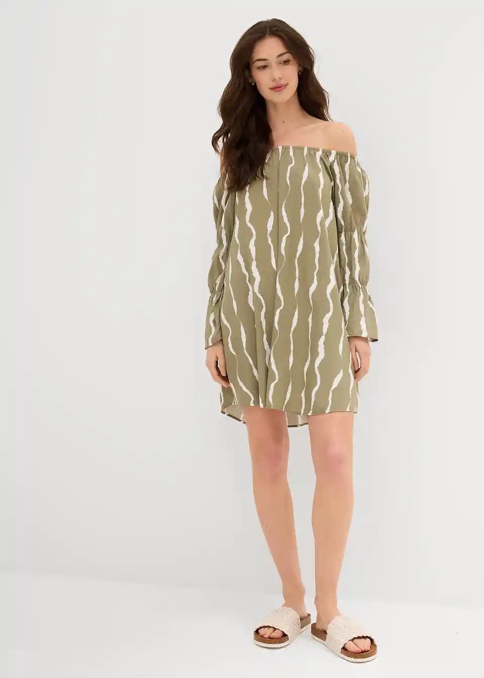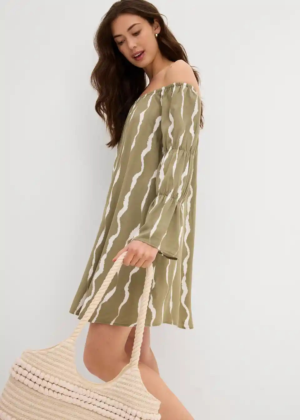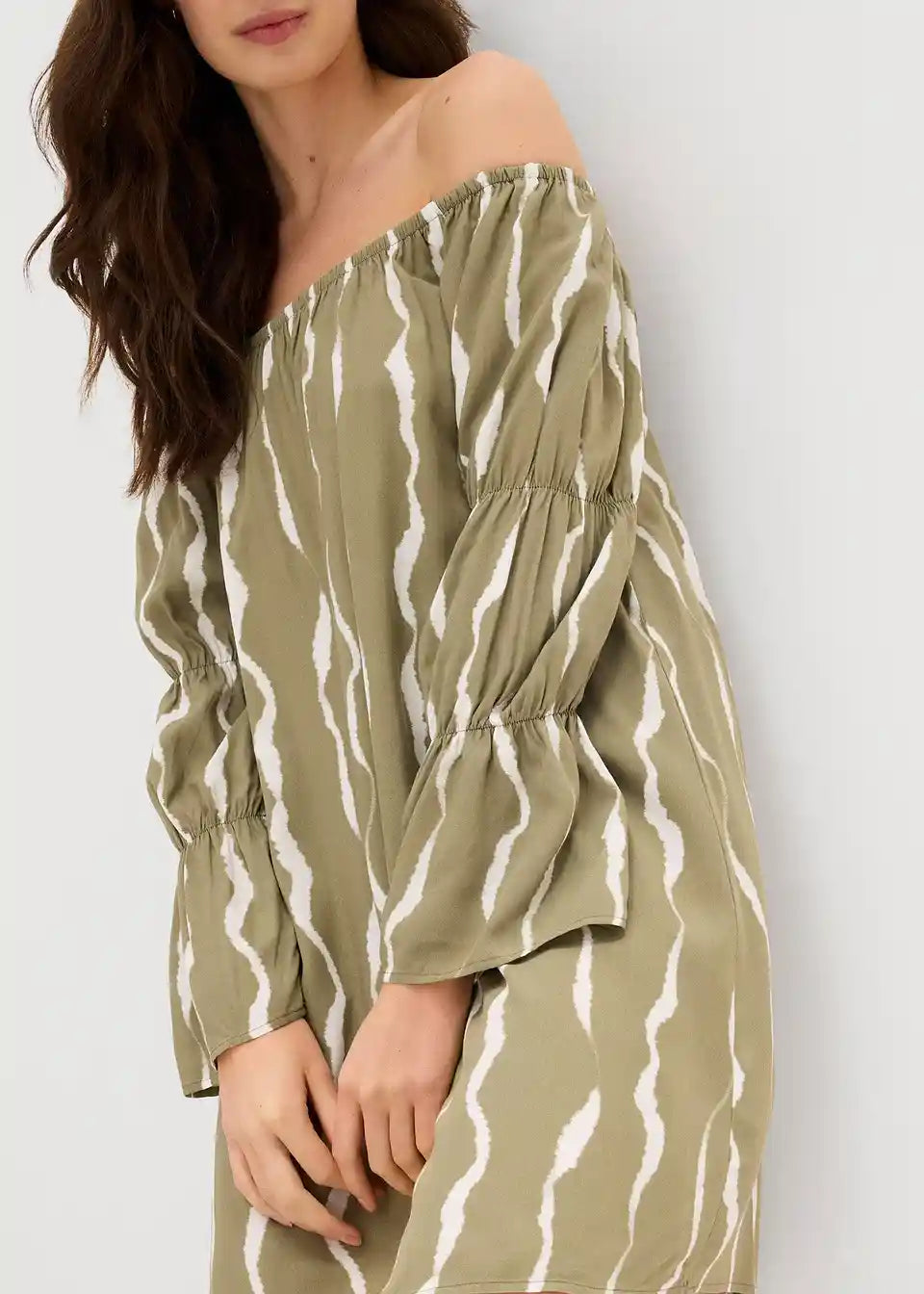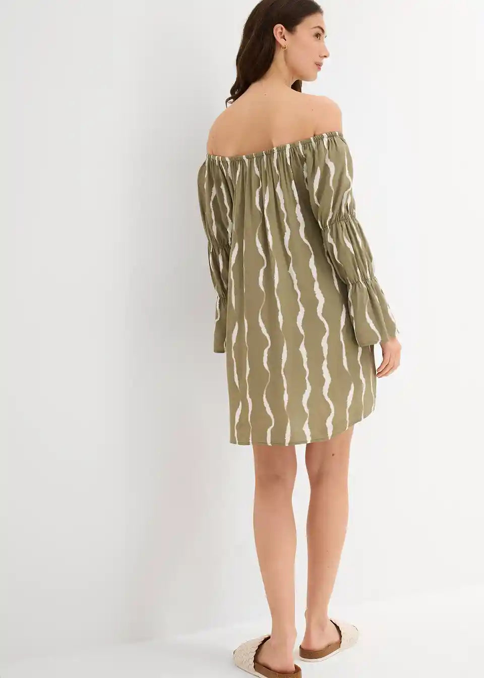 Obleka s carmen izrezom iz padajoče viskoze