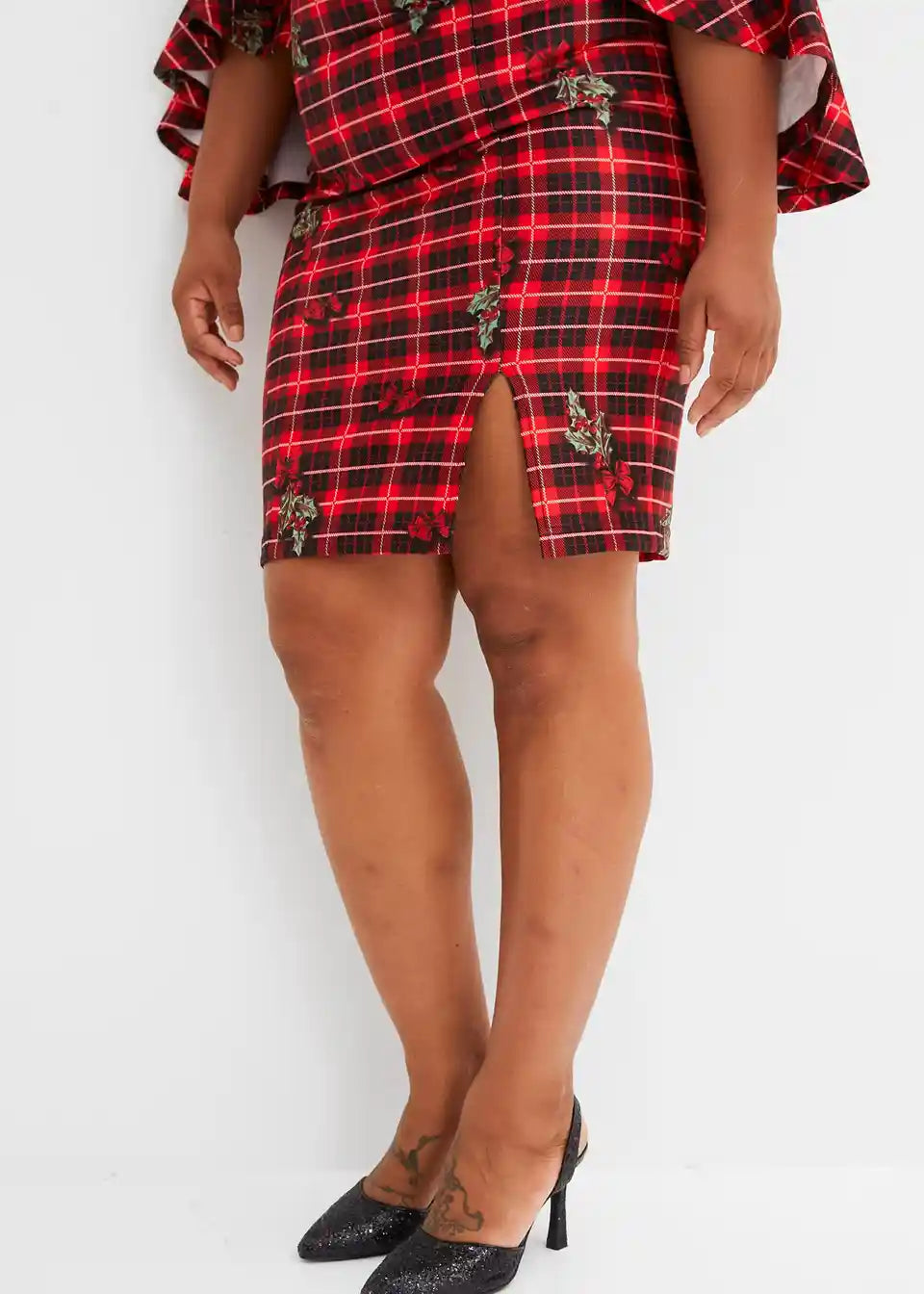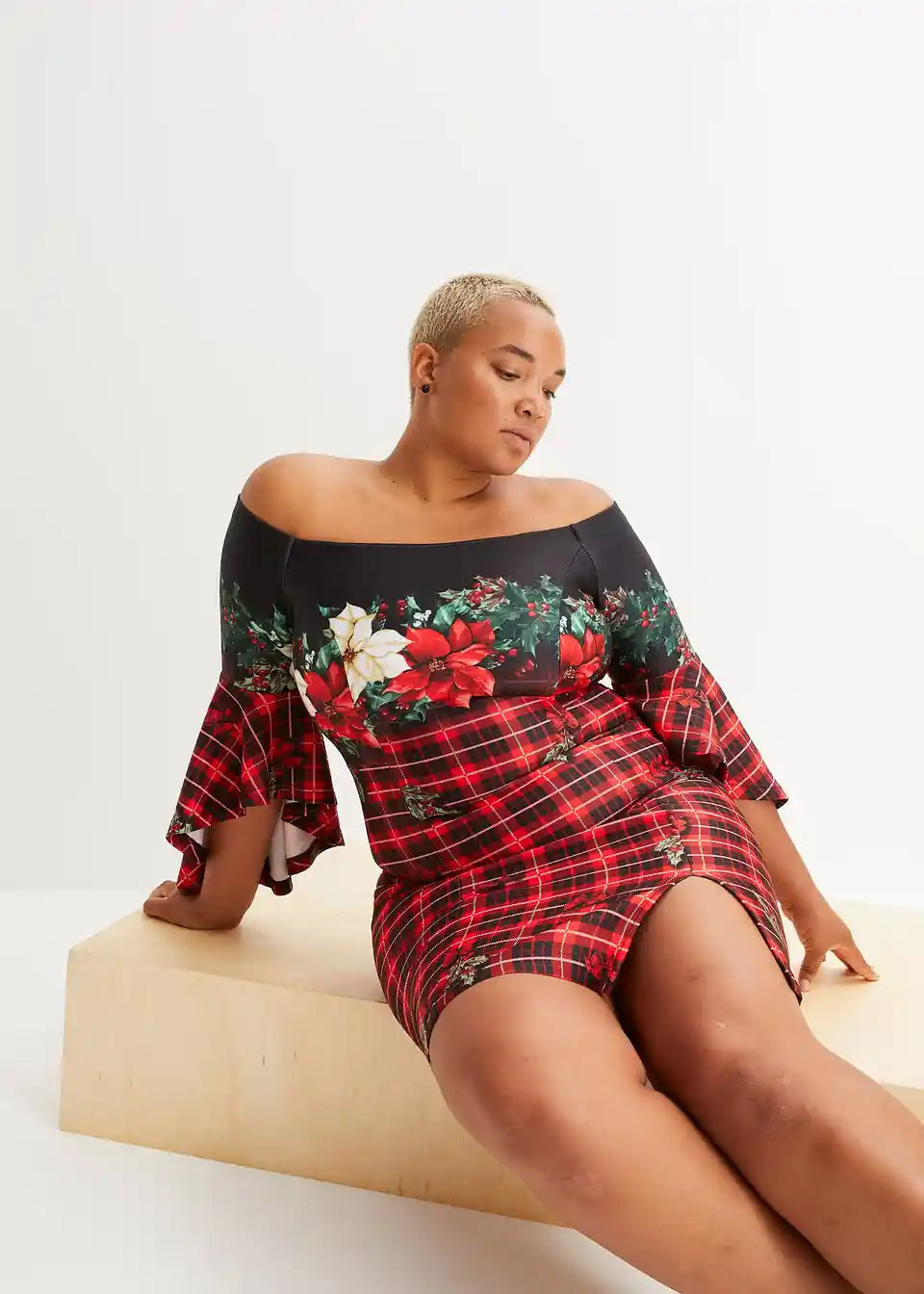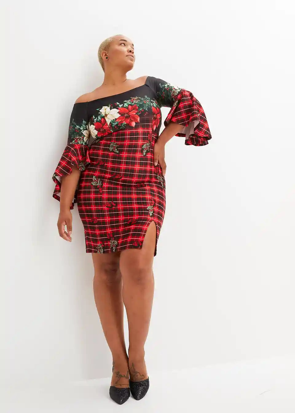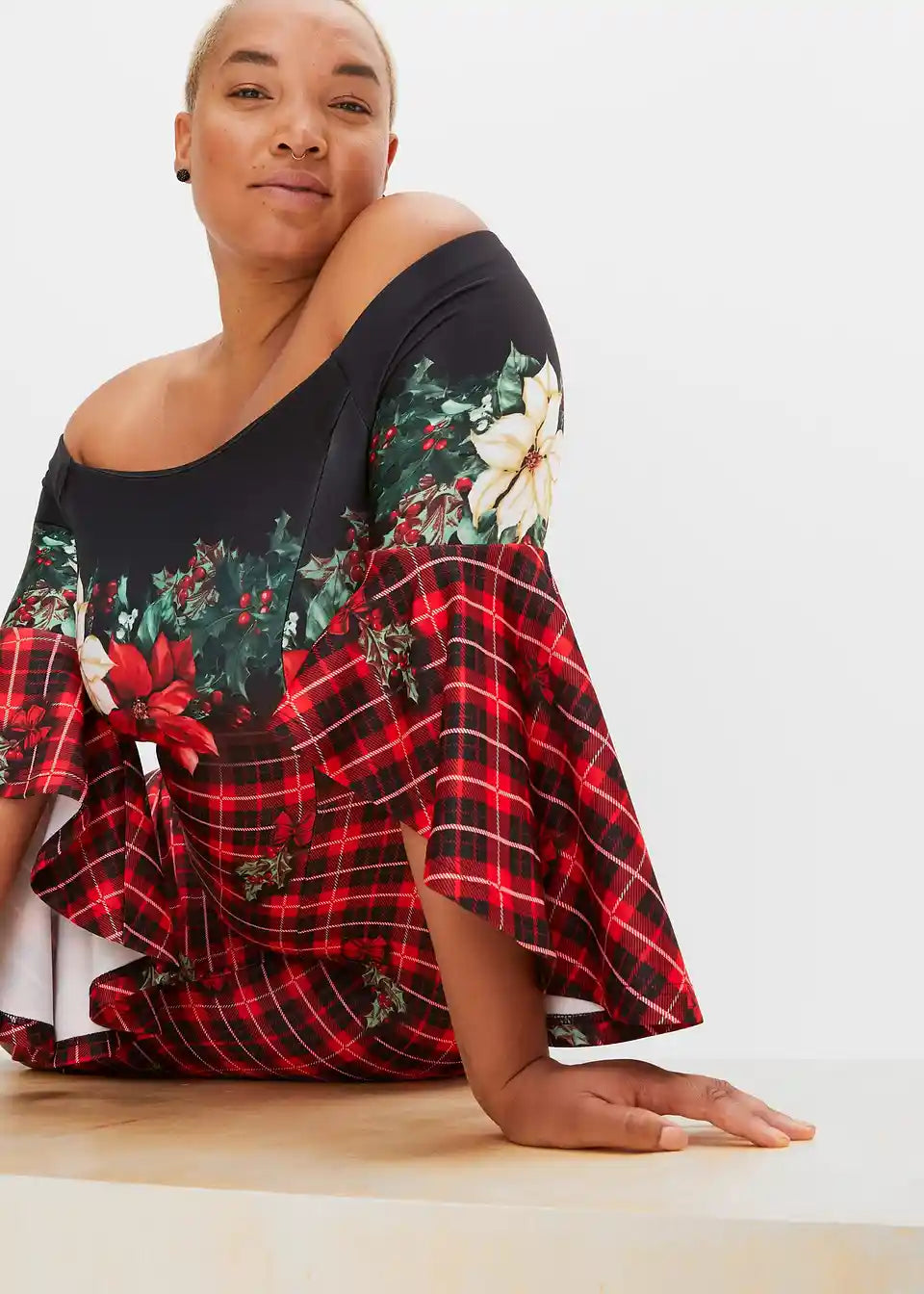 Očarljiva jersey obleka s Carmen izrezom in širokimi volan rokavi. Z božičnim motivom je ta obleka prava paša za oči med prazničnimi dnevi.