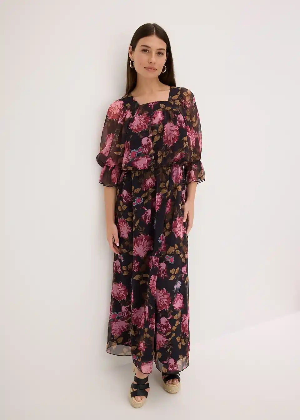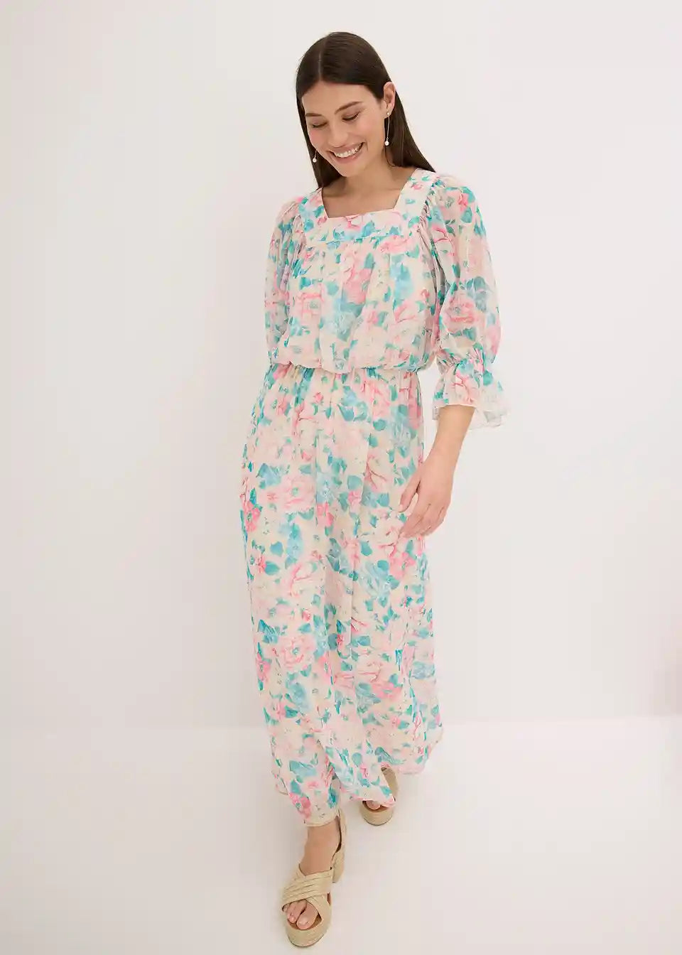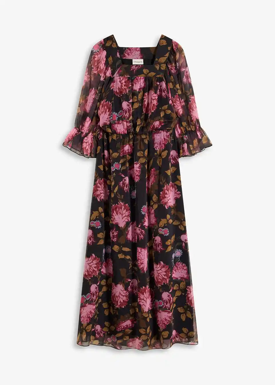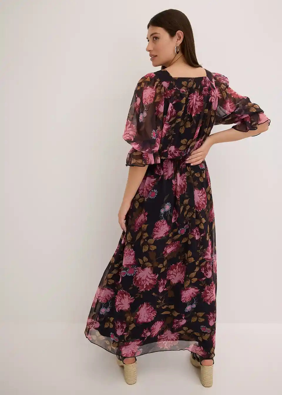 cvetlično potiskana Chiffon-Maksimalna obleka z balon rokavi
