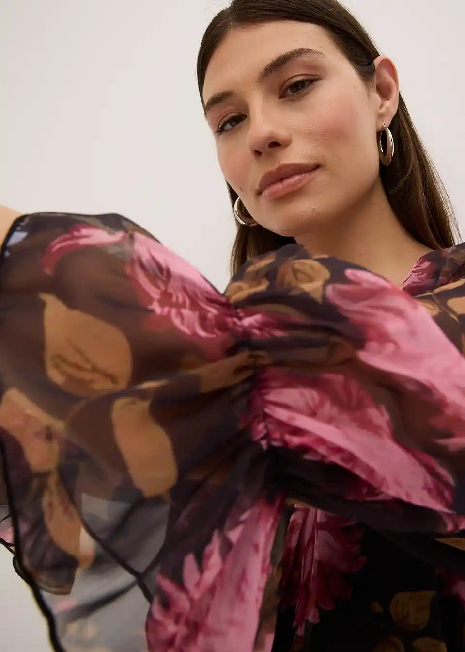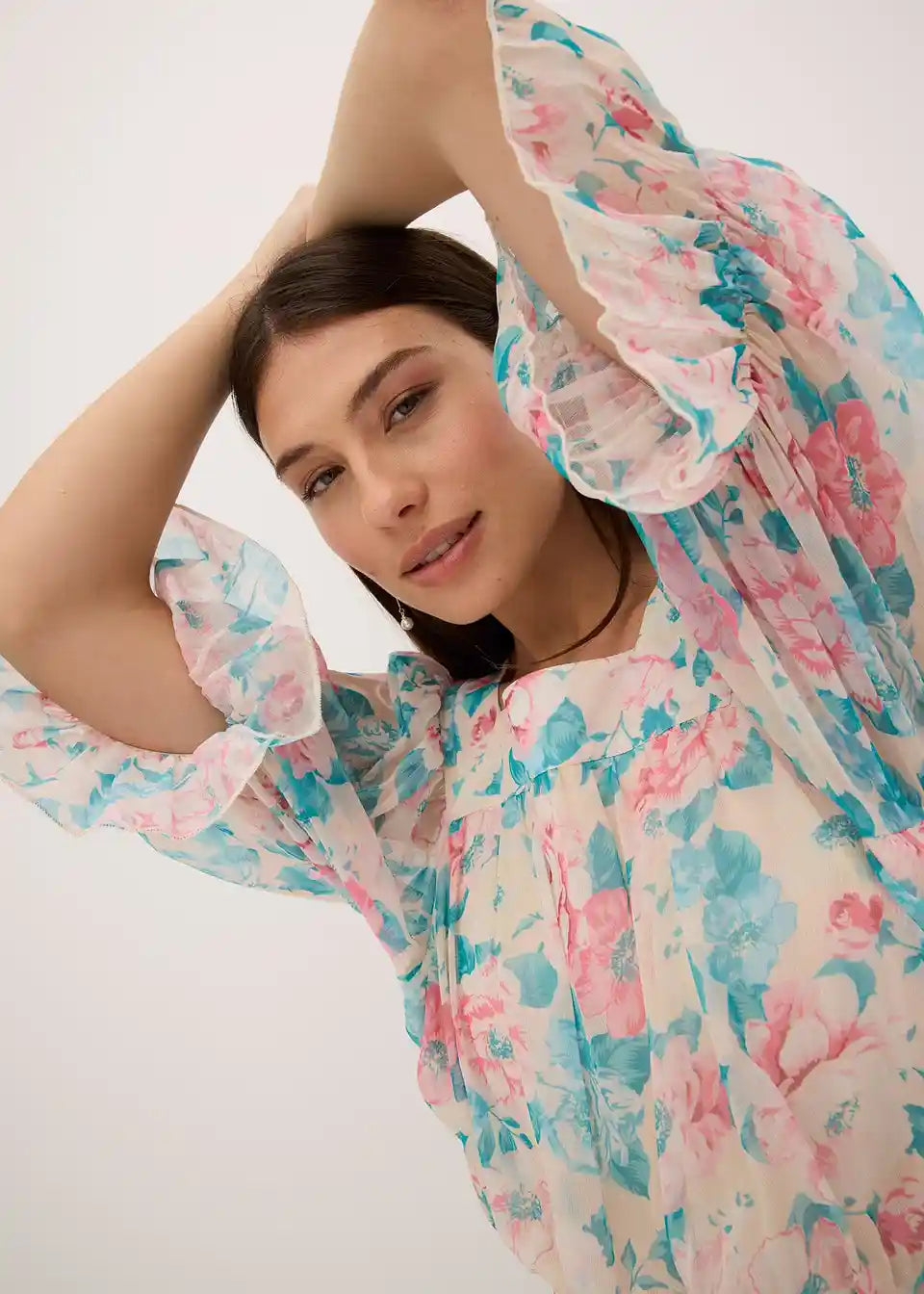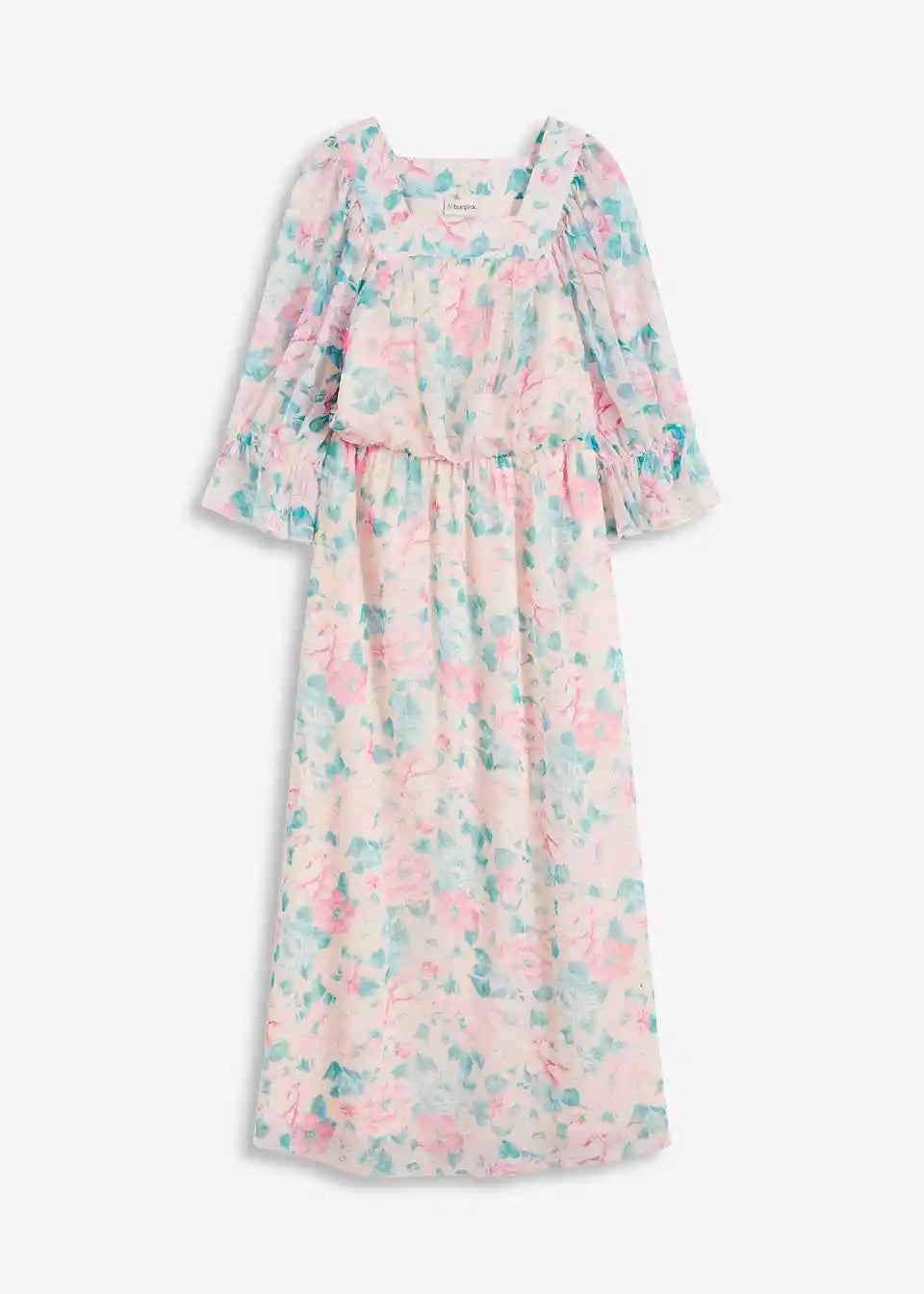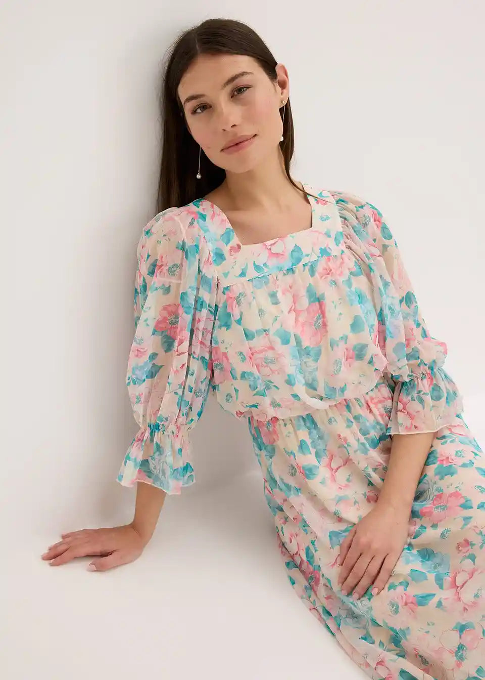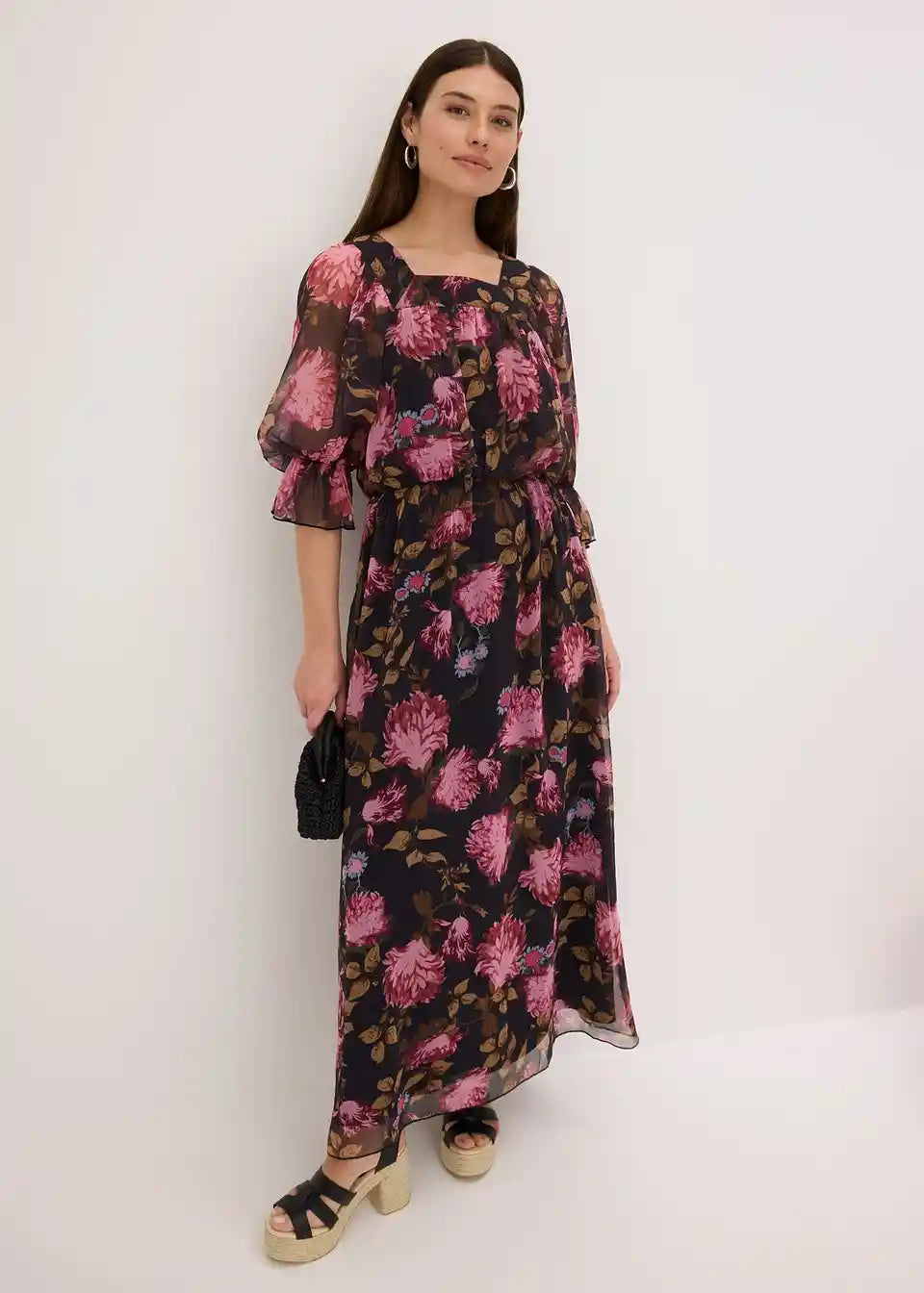 cvetlično potiskana Chiffon-Maksimalna obleka z balon rokavi