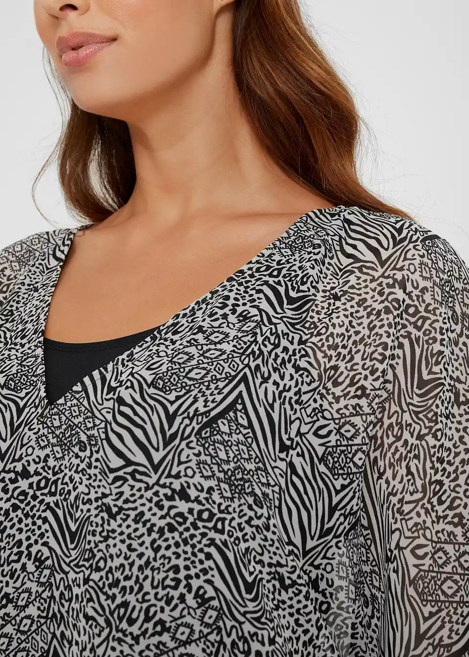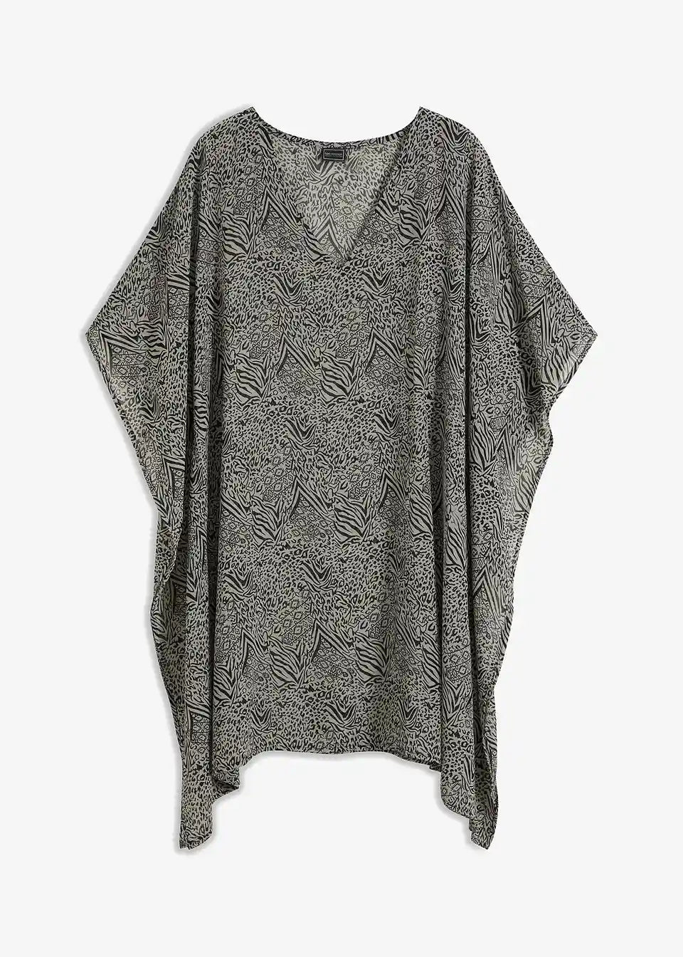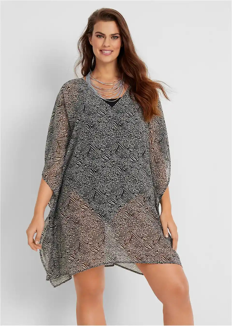 Ta model z V-izrezom obdaja dame med sprehodi po plaži in zagotavlja eleganten videz pri toplih temperaturah. S svojo ohlapno krojenostjo poudari plažna obleka znamke bpc selection ženstveno silhueto. Tanka tkanina se prijetno prilega koži in zagotavlja zračen občutek nošenja. Obleka je prosojna in na dovršen način izpostavi spodaj vidne kopalke.