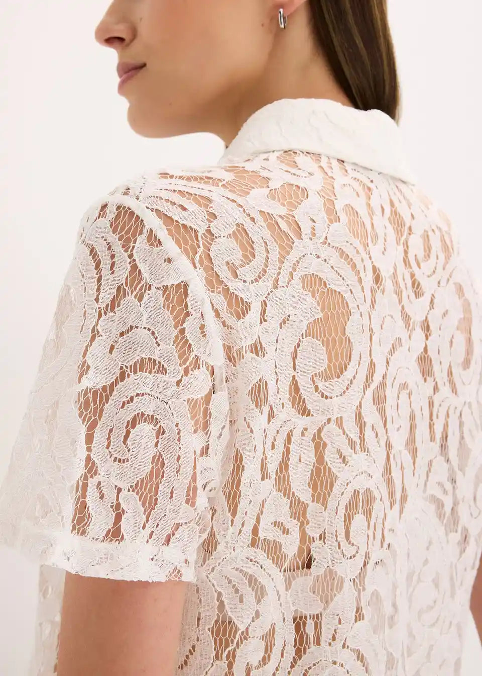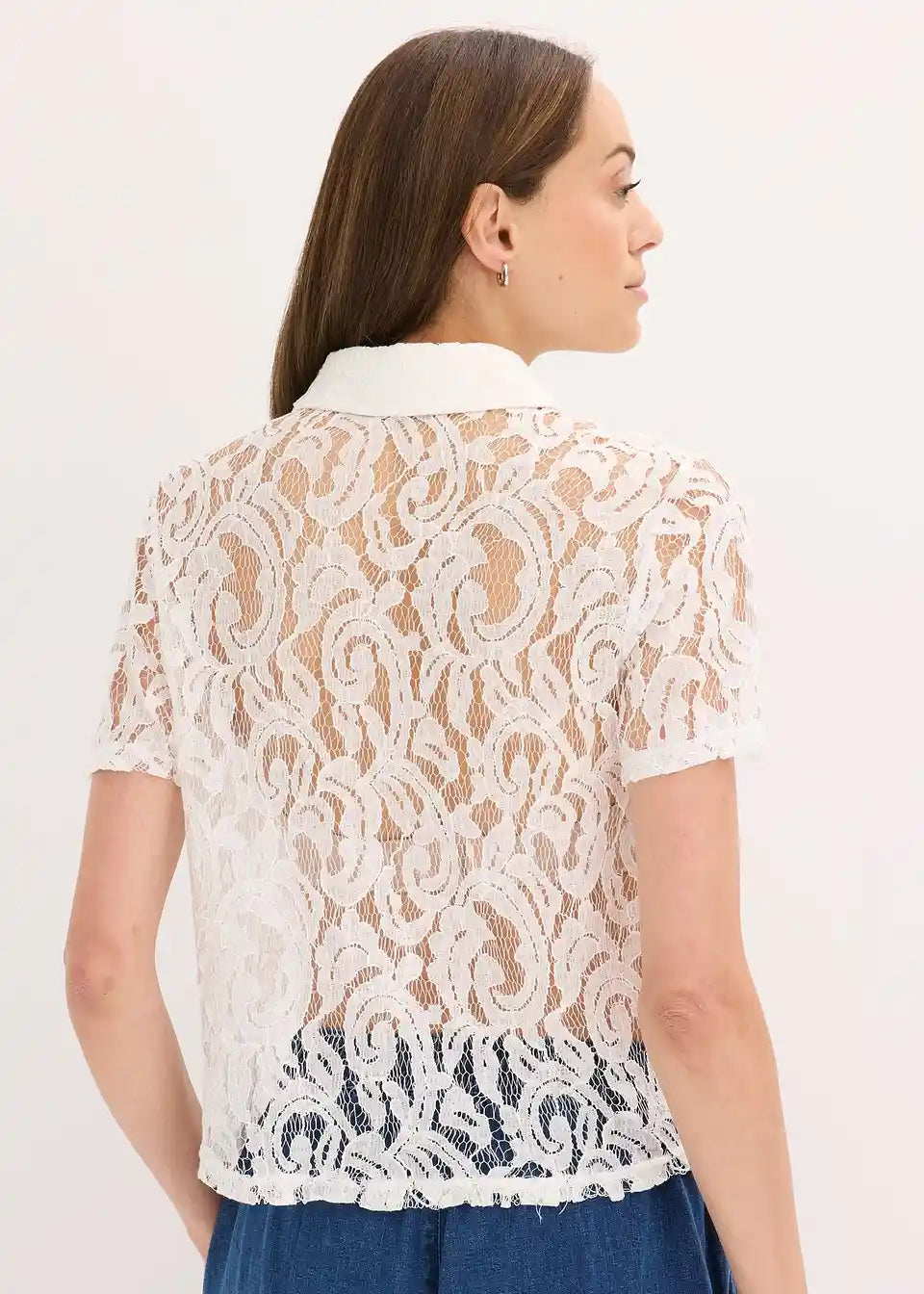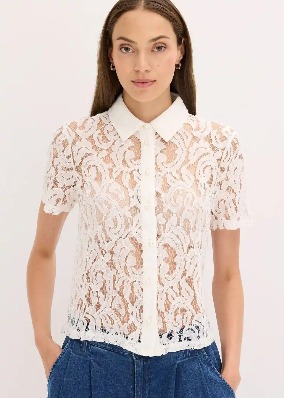 ženska čipkasta bluza s spredaj okrasnimi bisernimi gumbi