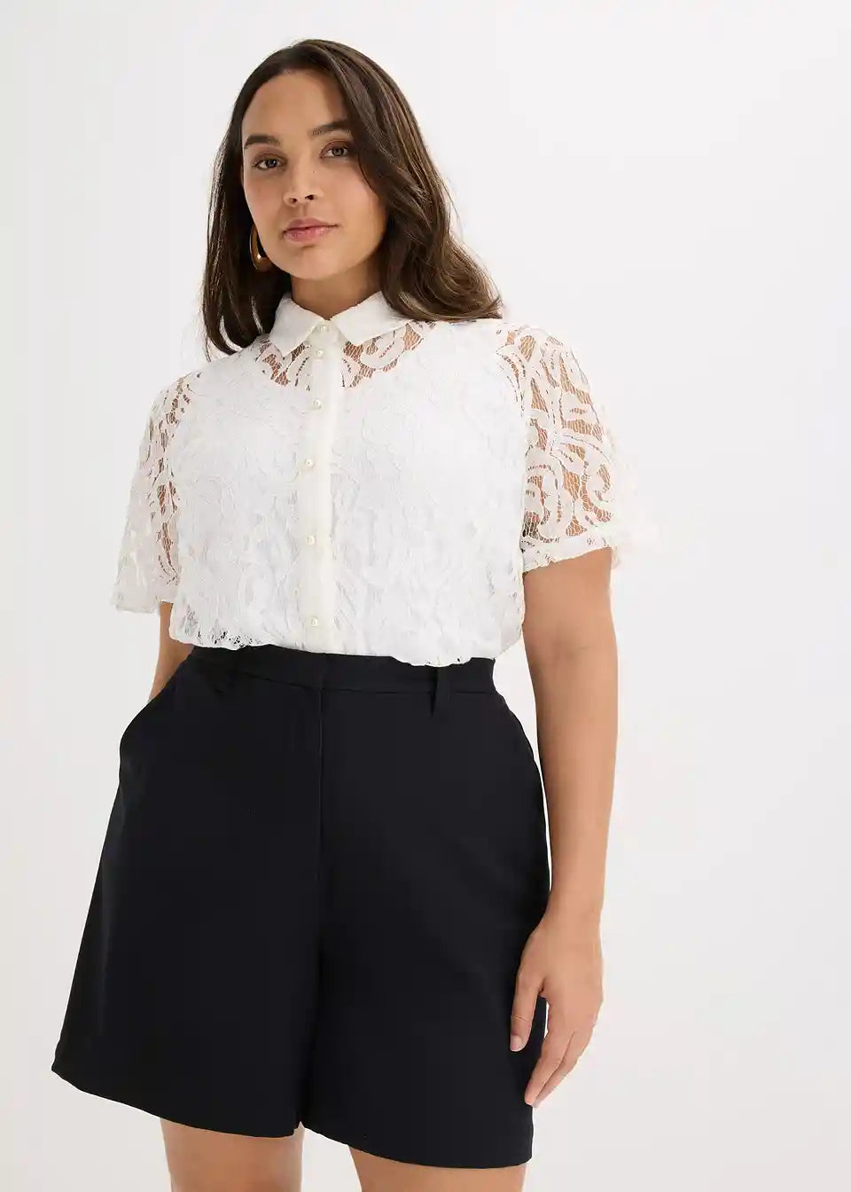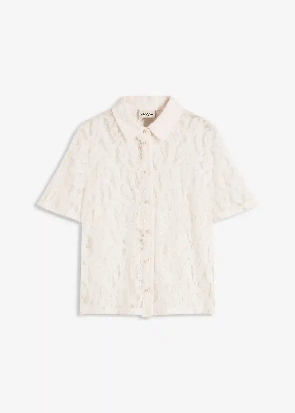ženstvena čipkasta bluza z dekorativnimi bisernimi gumbi spredaj