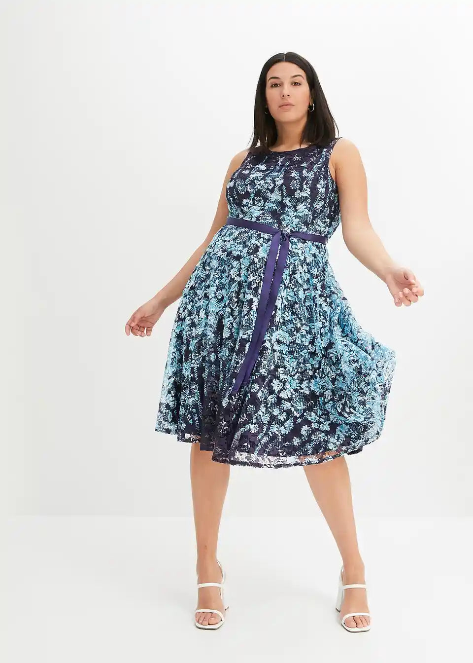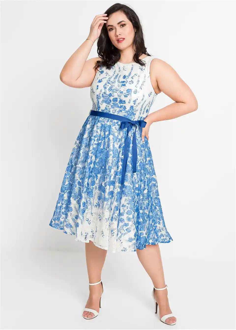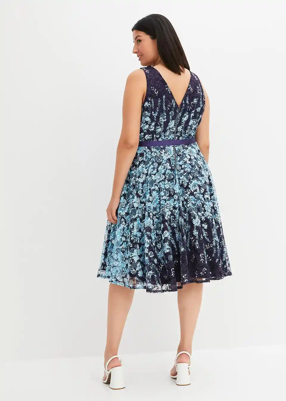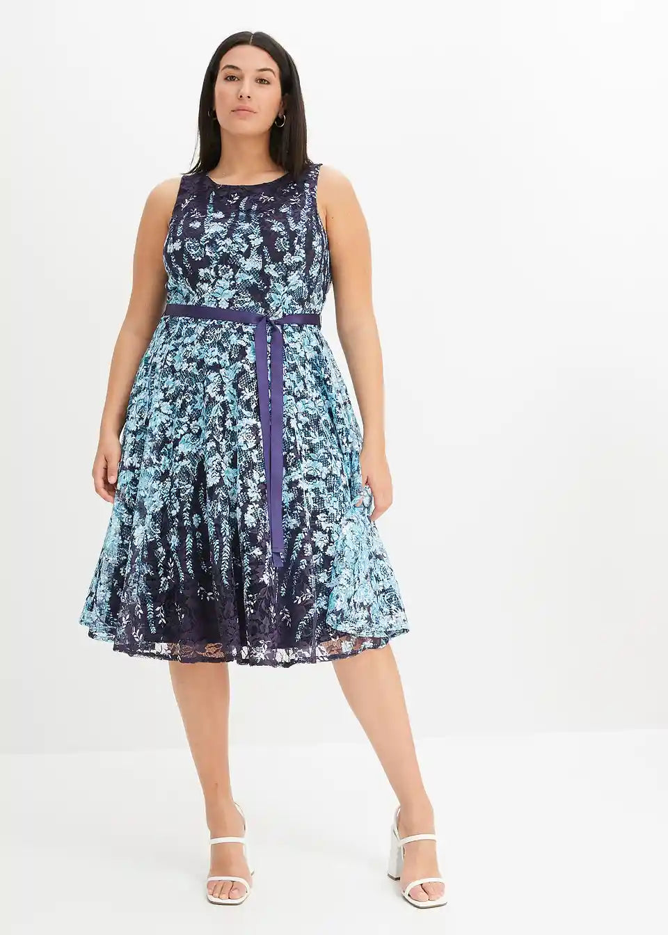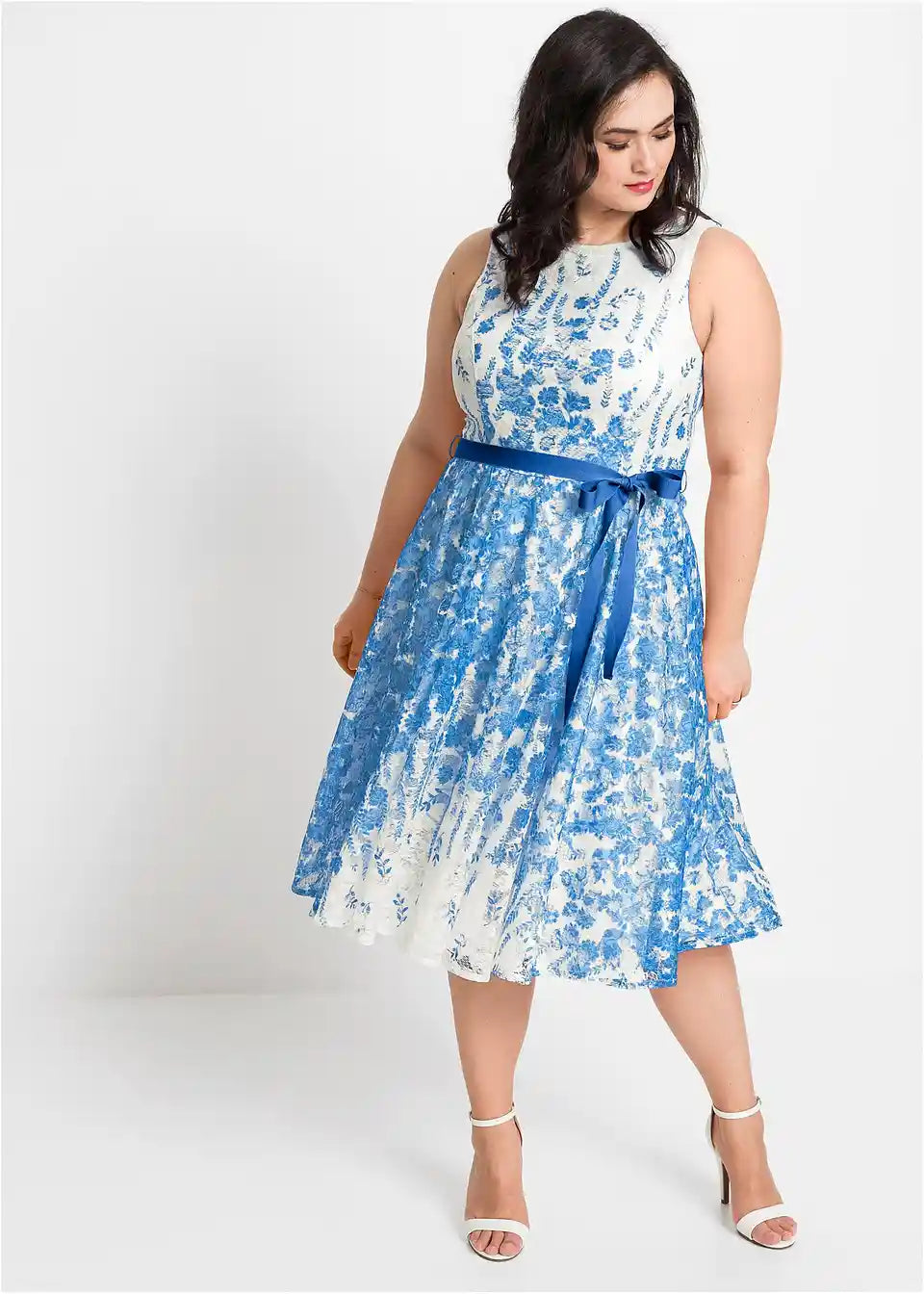 Romantična in ženstvena: Razširjeno midi krilo iz čipke s satenastim trakom v pasu.