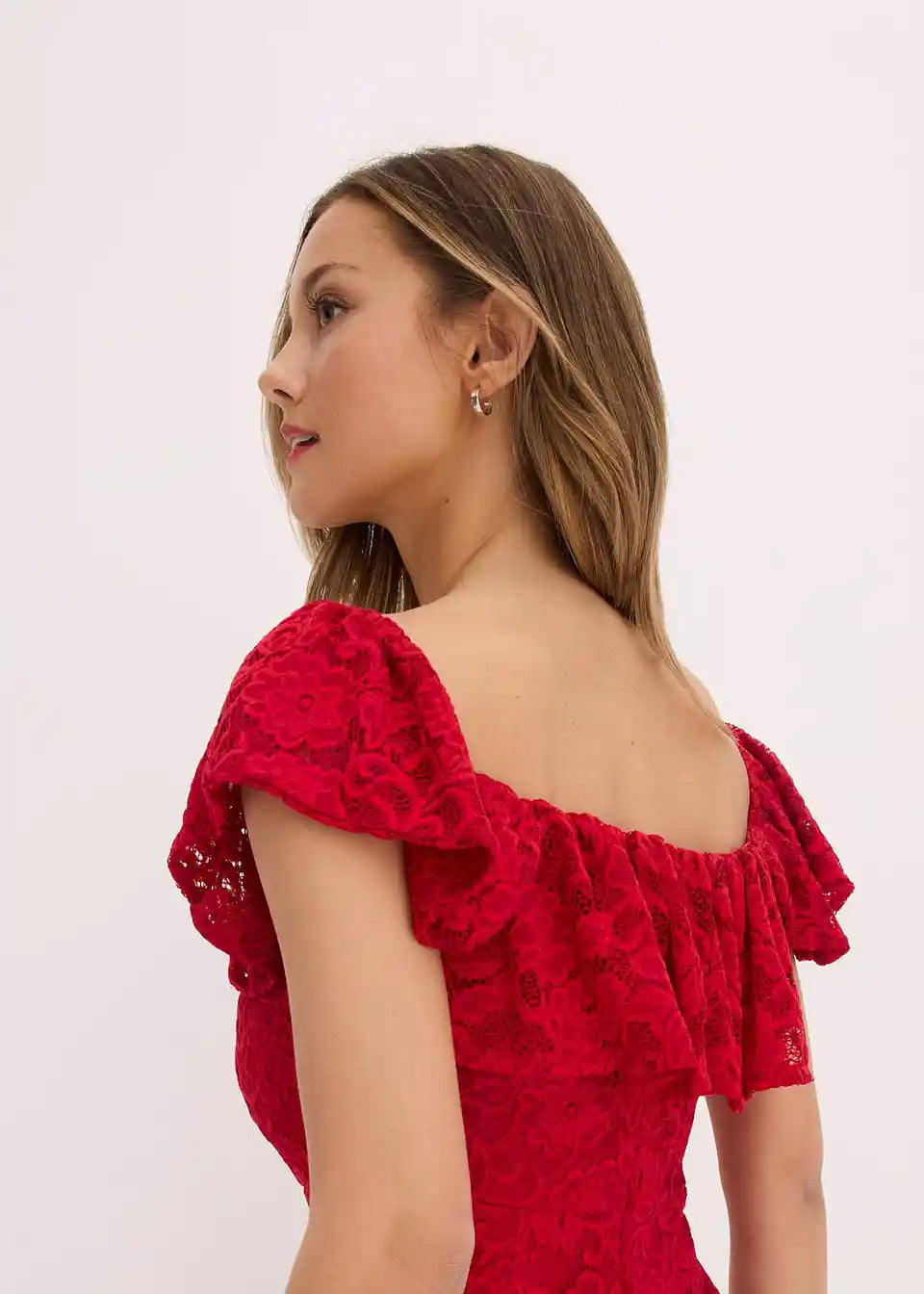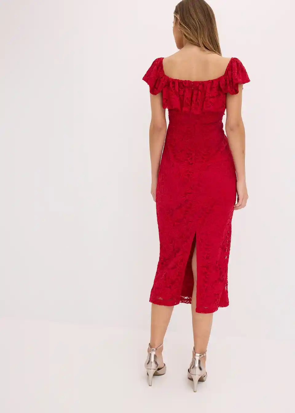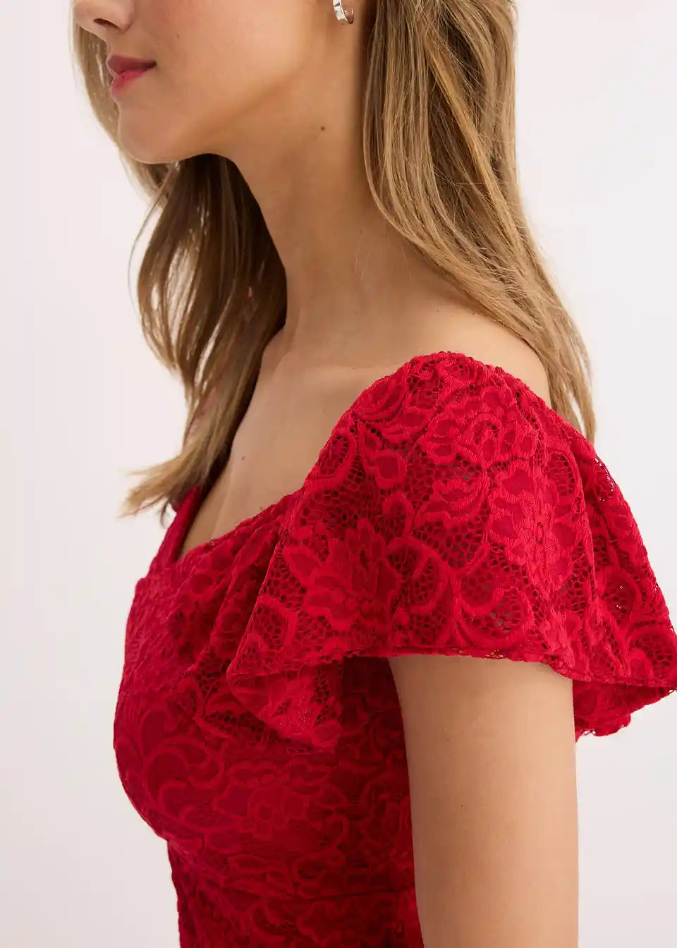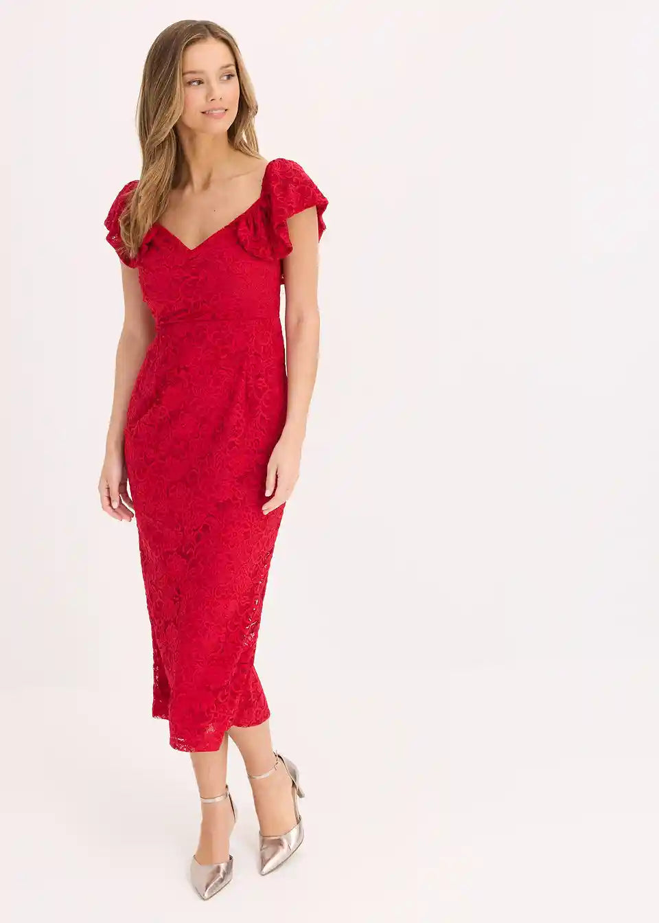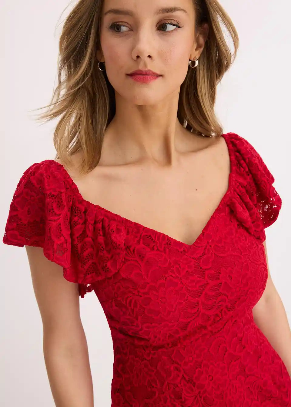 Seksi in ženstvena koktajl obleka v midi dolžini s sanjsko čipko in nabranimi rokavi