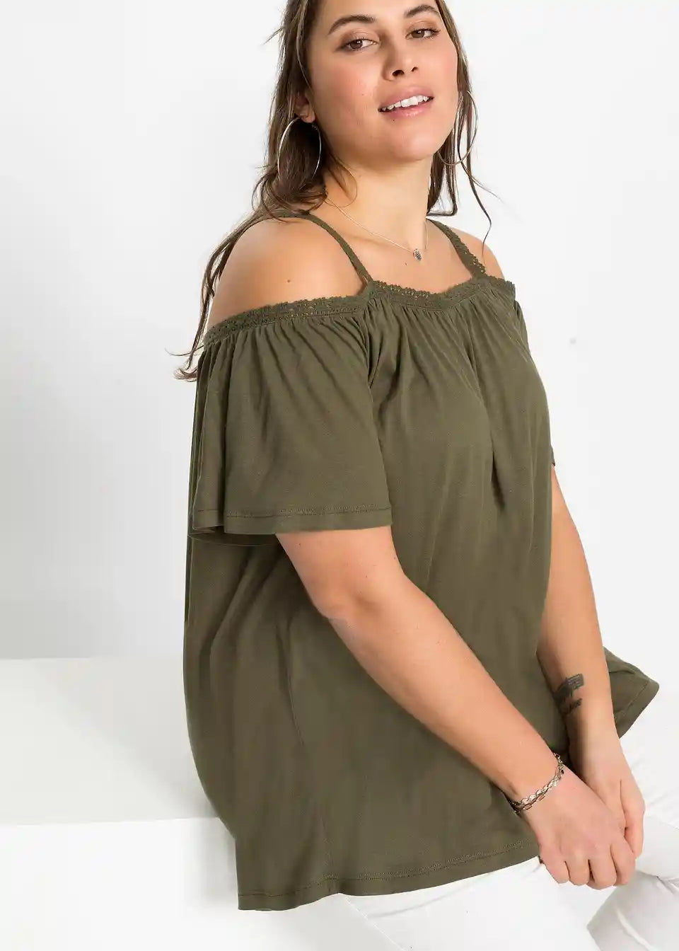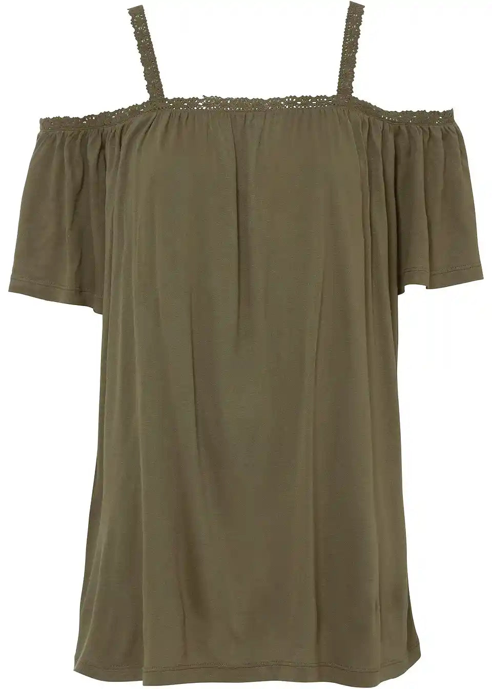 S to modno majico z čipkastim okrasjem boste popolnoma v trendu. Majica izstopa zaradi velikih izrezov na ramenih, njen izrez in ozki trakovi pa so okrašeni z modnim čipkastim okrasjem. Rahlo nabran kroj in ohlapen kroj poskrbita za sproščeno prileganje. Kratkoročna Cold-Shoulder majica se odlično kombinira z oprijetimi kavbojkami ali kratkimi hlačami.