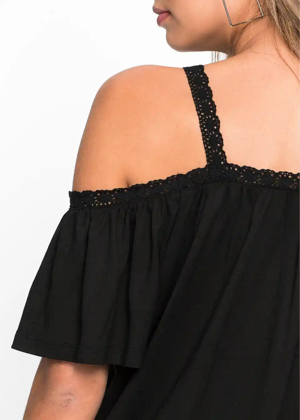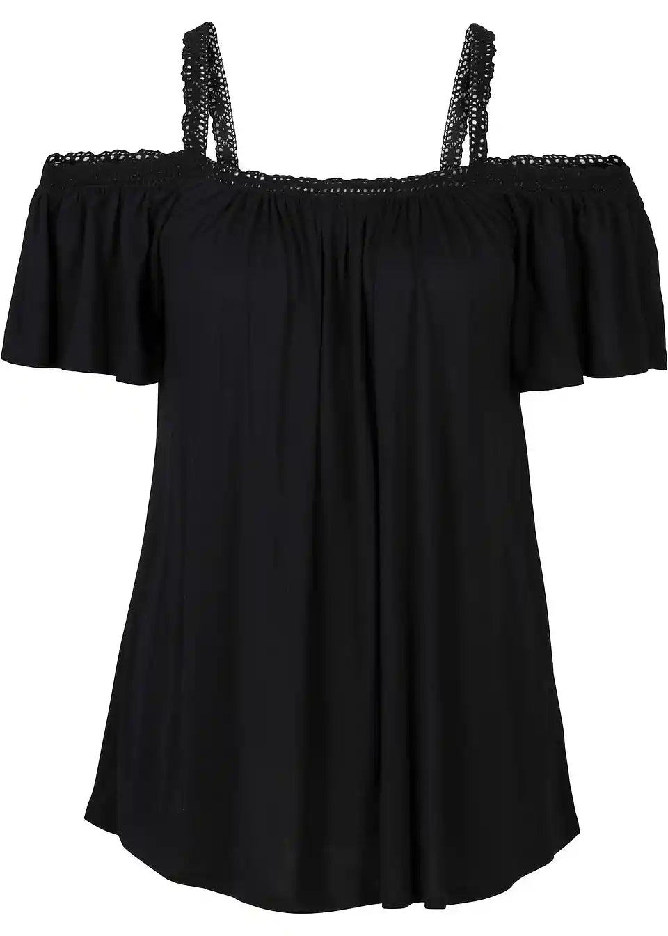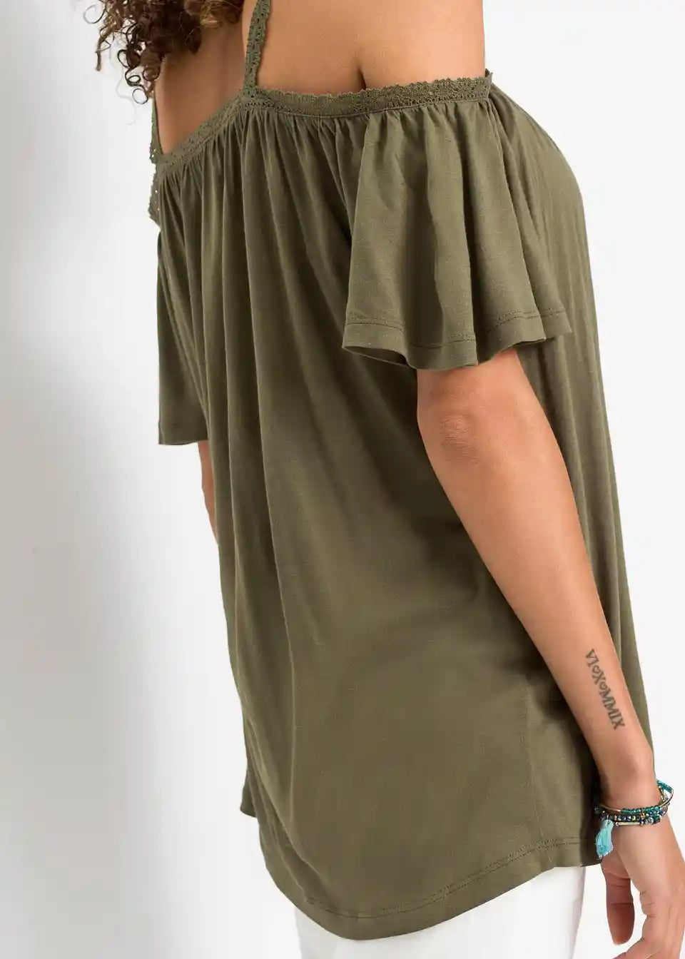 S to stilsko majico z čipkastim robom boste popolnoma v trendu. Majica izstopa zaradi velikih izrezov na ramenih, izrez in ozki trakovi pa so okrašeni z modnim čipkastim robom. Lahkotno nabiranje in sproščen kroj zagotavljata lahkotno prileganje. Kratkoročna Cold-Shoulder-Majica se odlično nosi s skinny kavbojkami ali kratkimi hlačami.