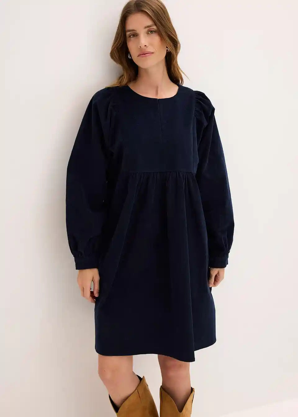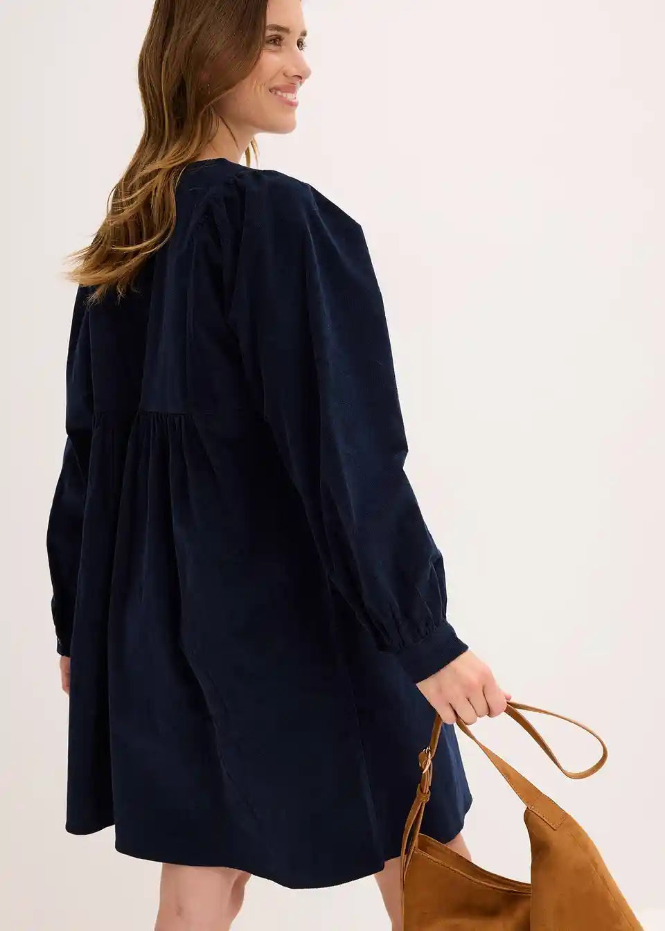 Obleka v široko padajočem kroju iz žameta z voluminoznimi rokavi
