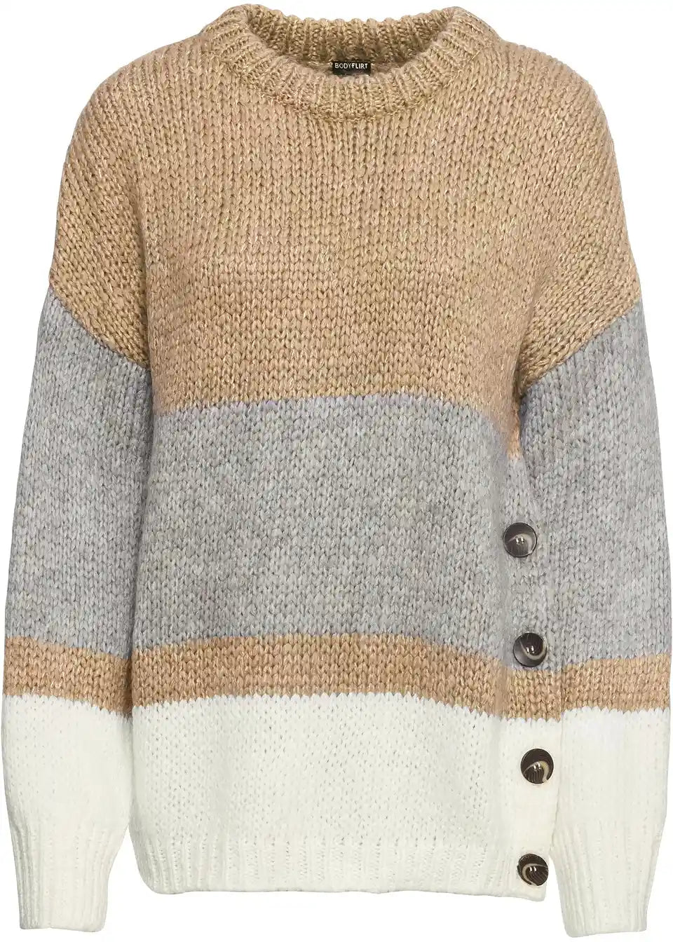 Črtast oversize pulover s gumbi znamke Bodyflirt. Pulover ima okrogel izrez in rebrast zaključek na izrezu, rokavih in robu. Optična dolžina pri vel. 36/38 približno 68 cm.