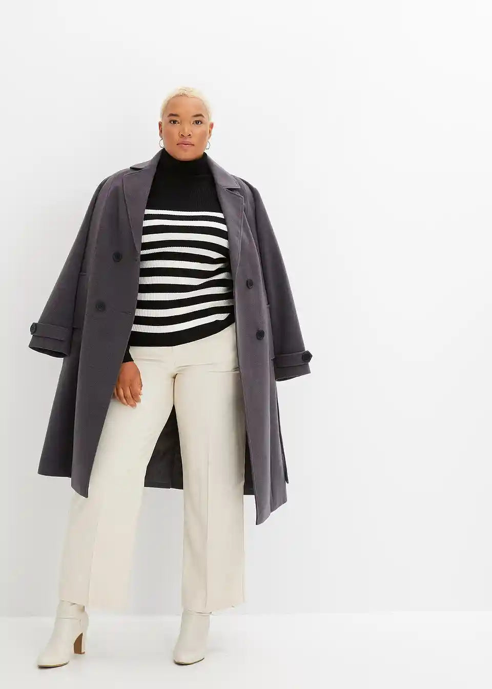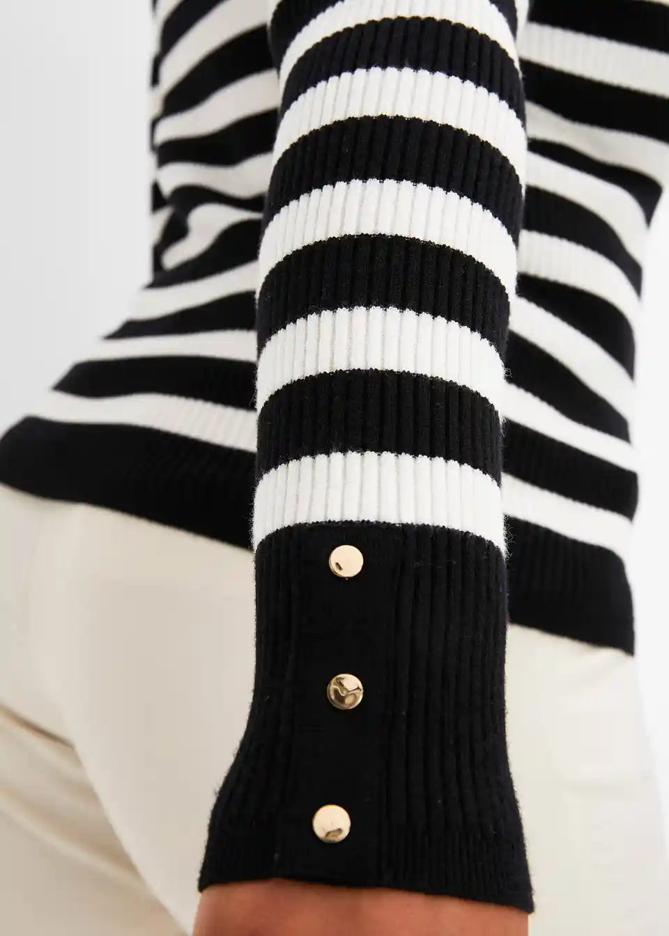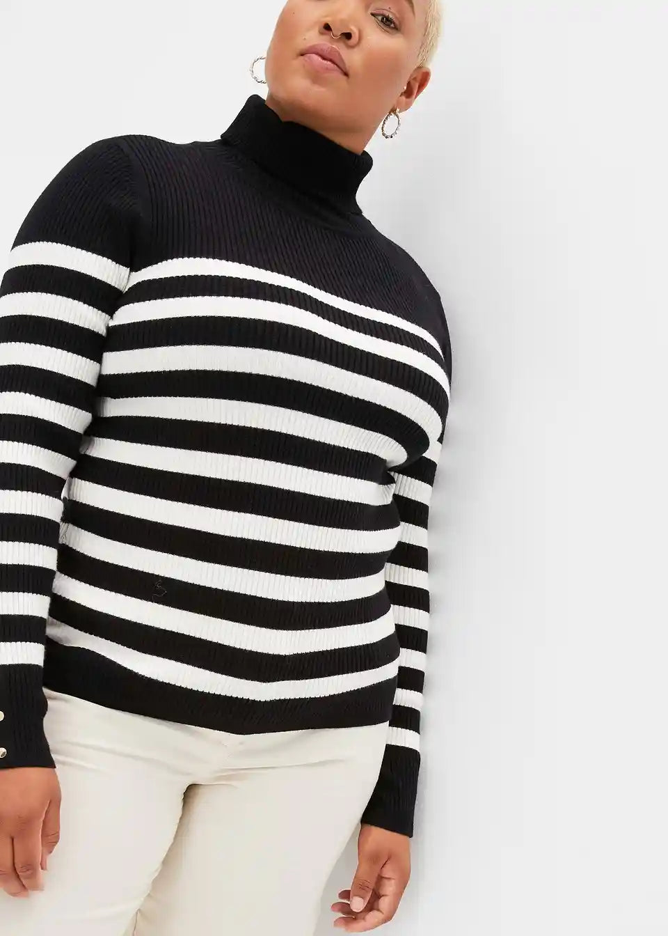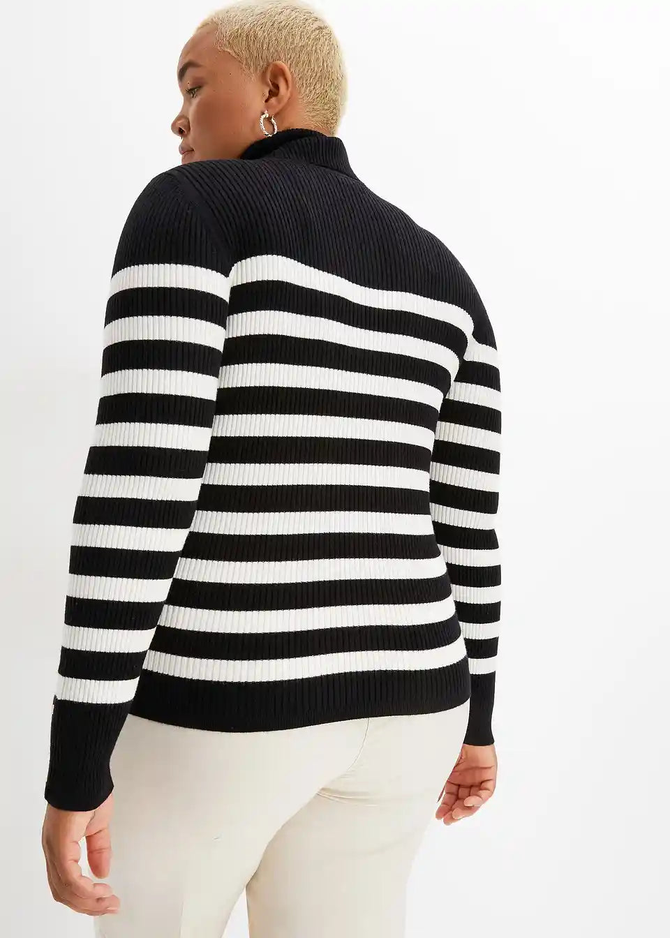 pulover z visokim ovratnikom in črtami, ki poudarja postavo