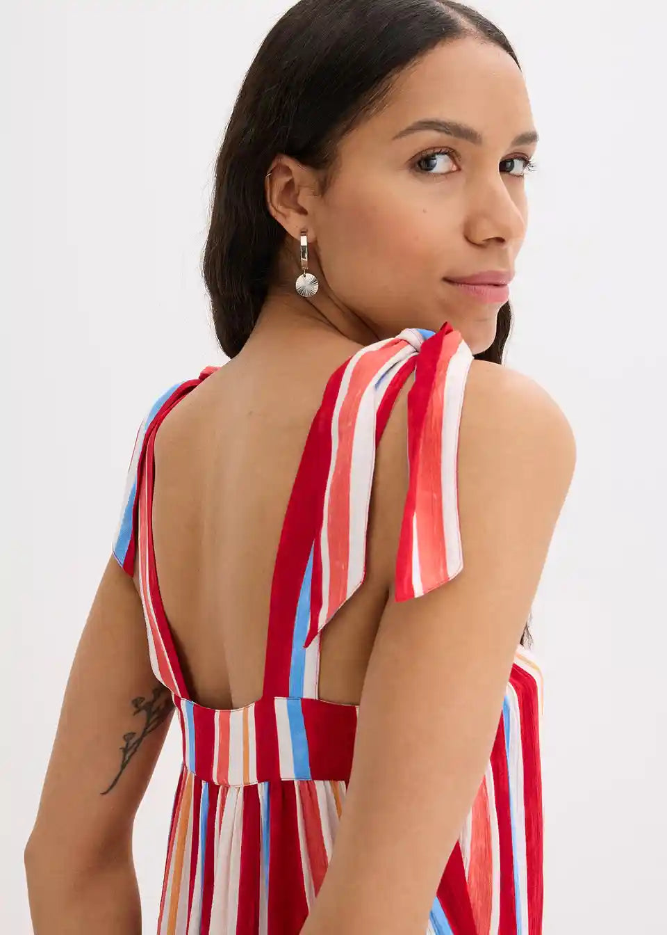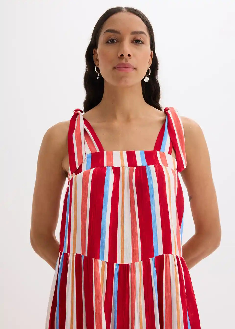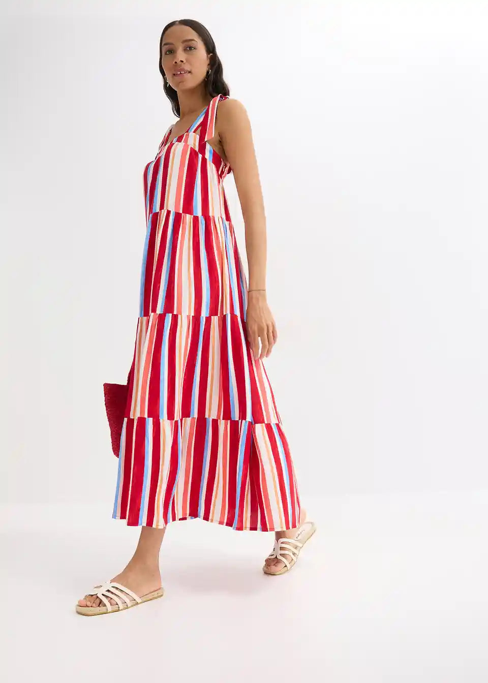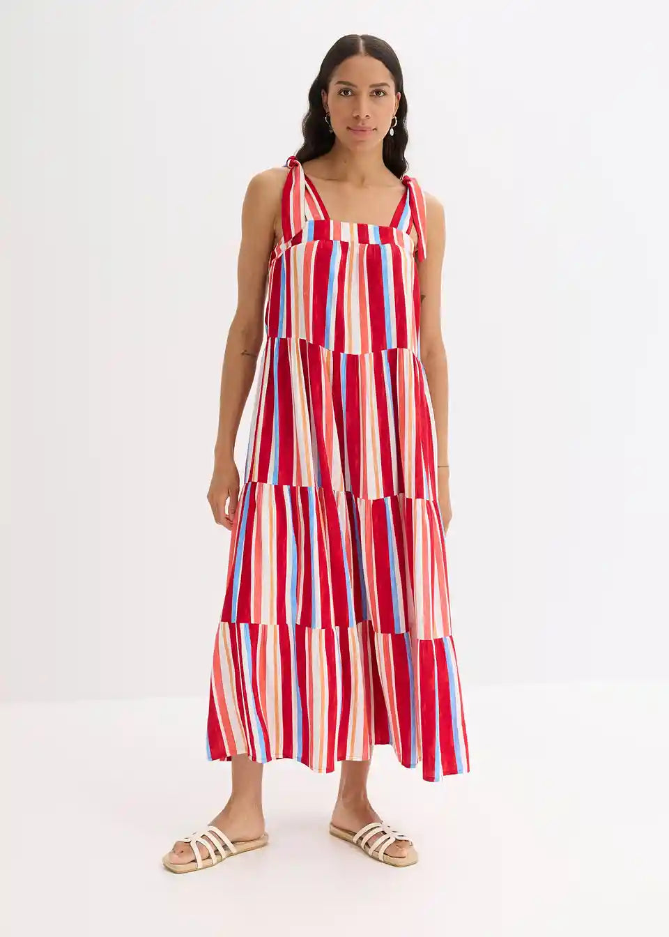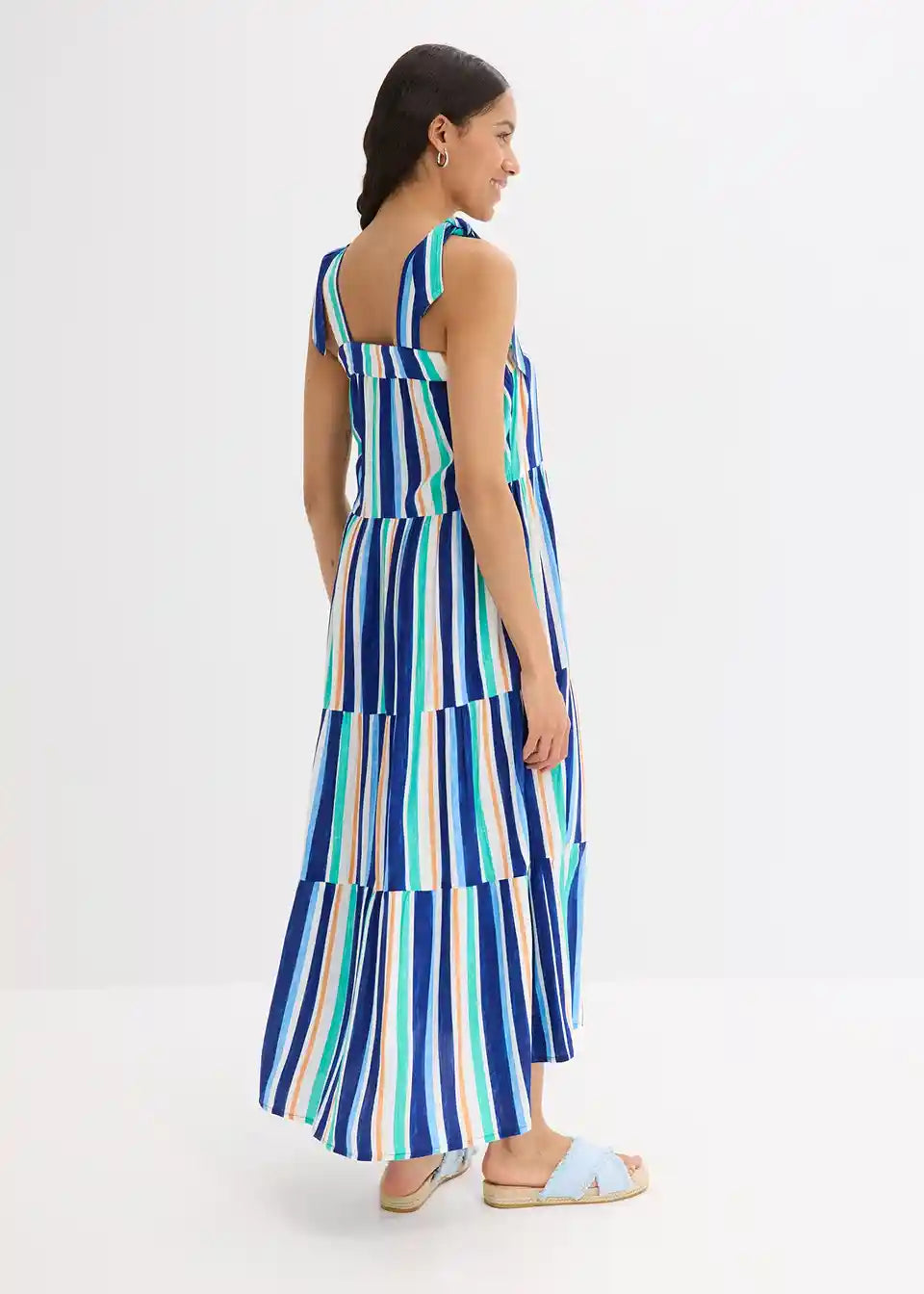 črtasta obleka z naramnicami v maksi dolžini iz strukturirane viskoze z zavezovanjem naramnic