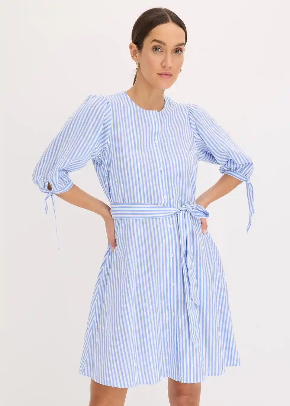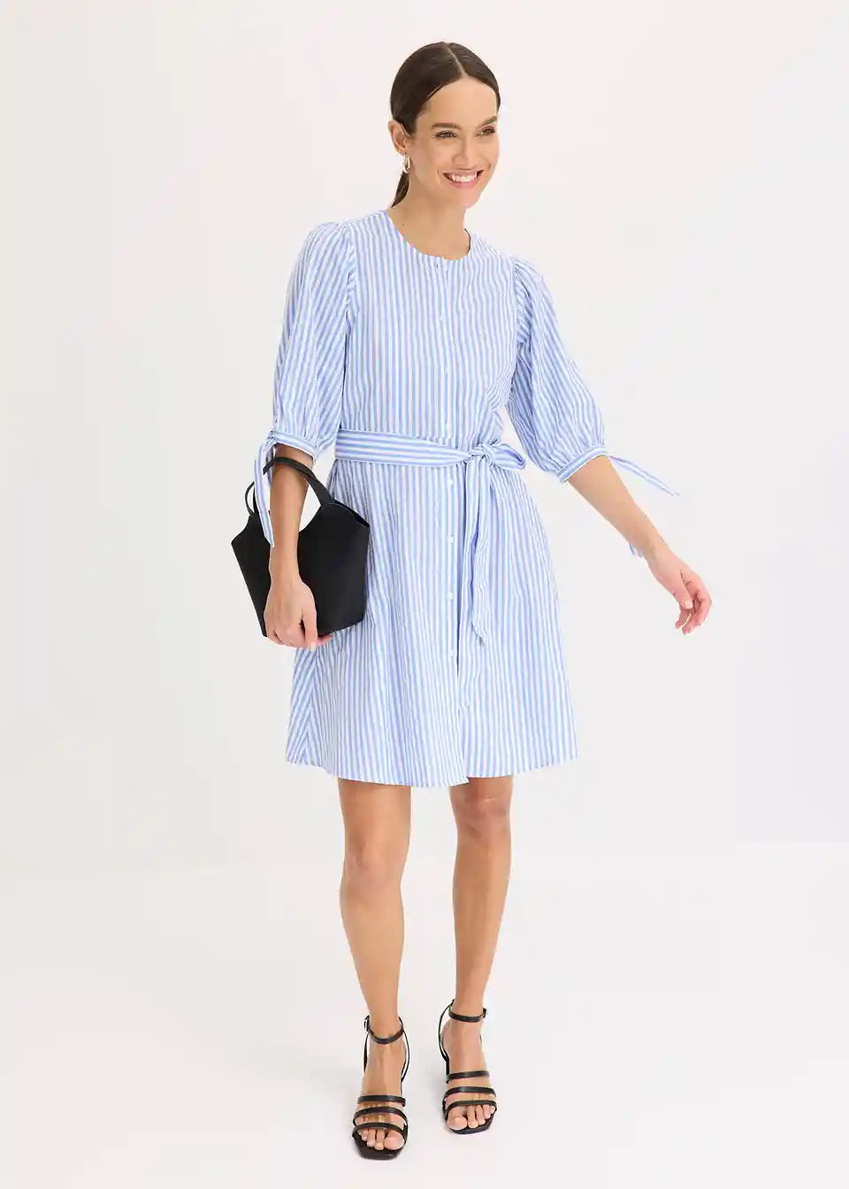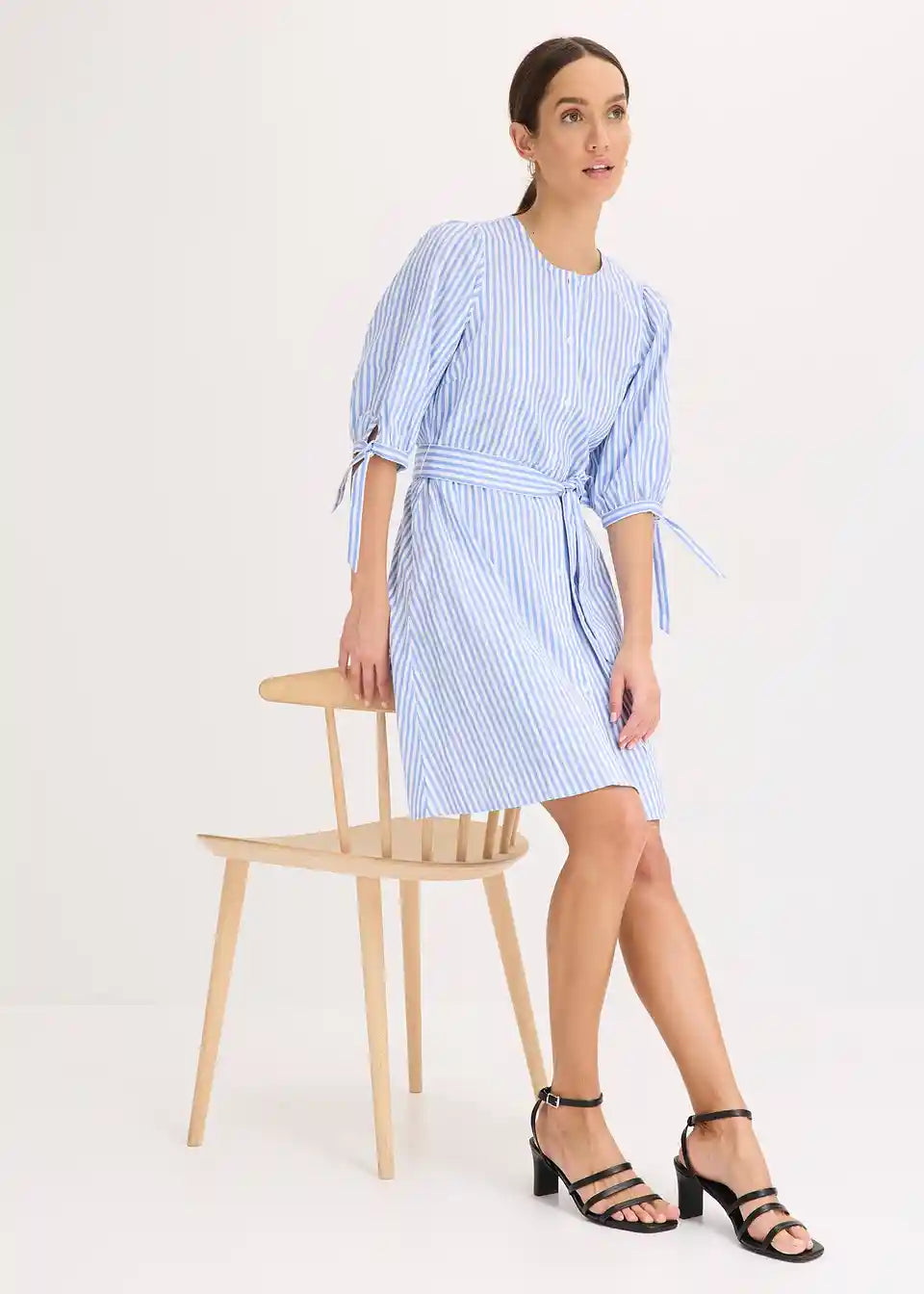 moderna srajčna obleka z napihnjenimi rokavi in zavezovanjem v pasu
