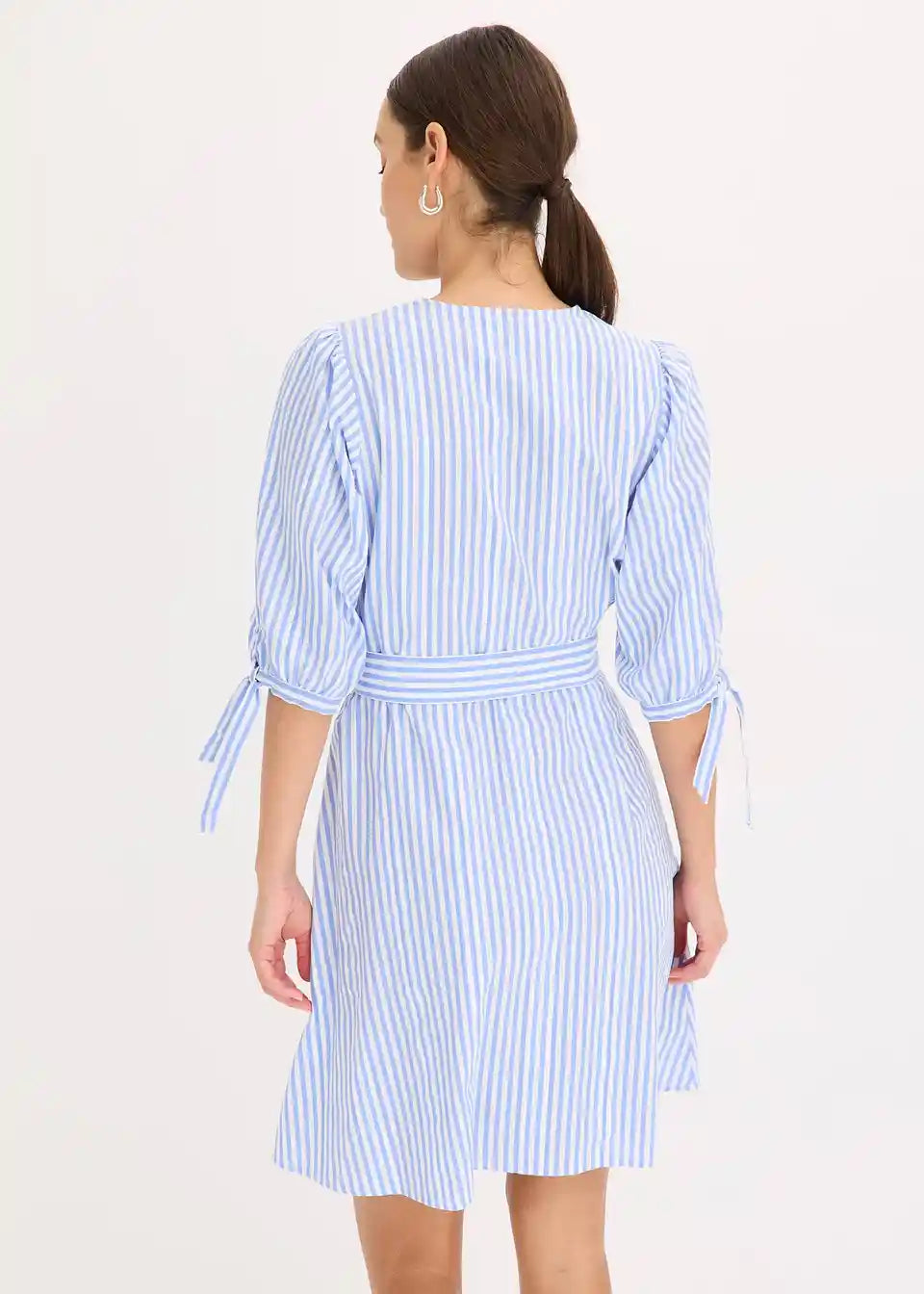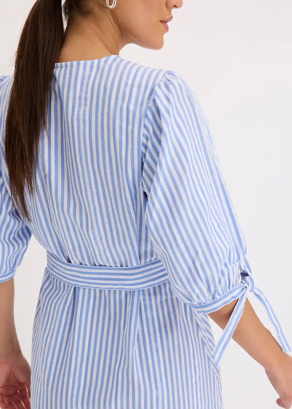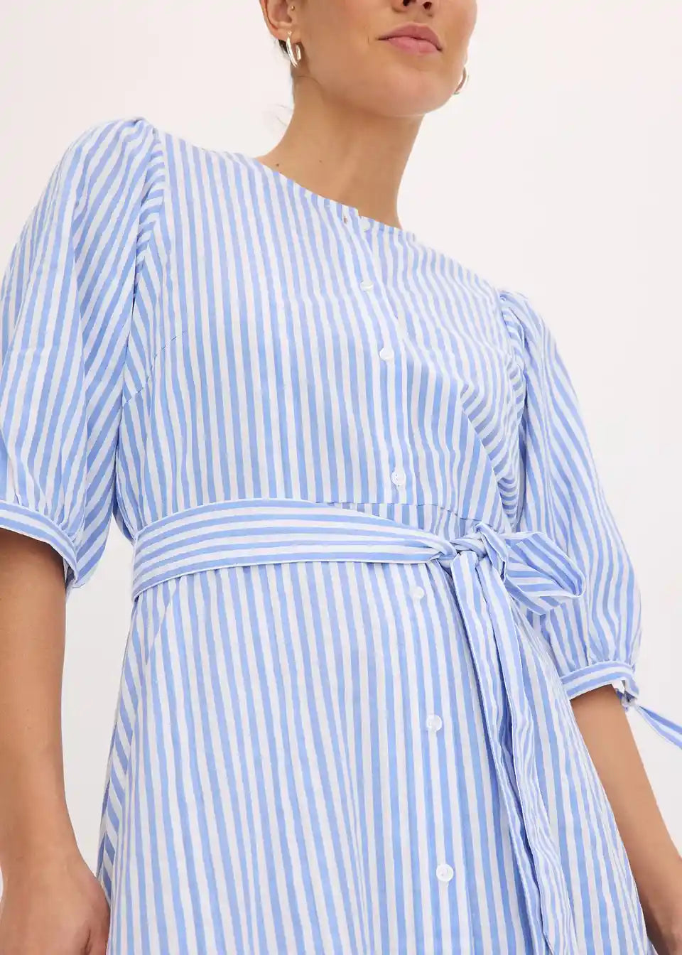 moderna srajčna obleka z napihnjenimi rokavi in zavezovanjem v pasu