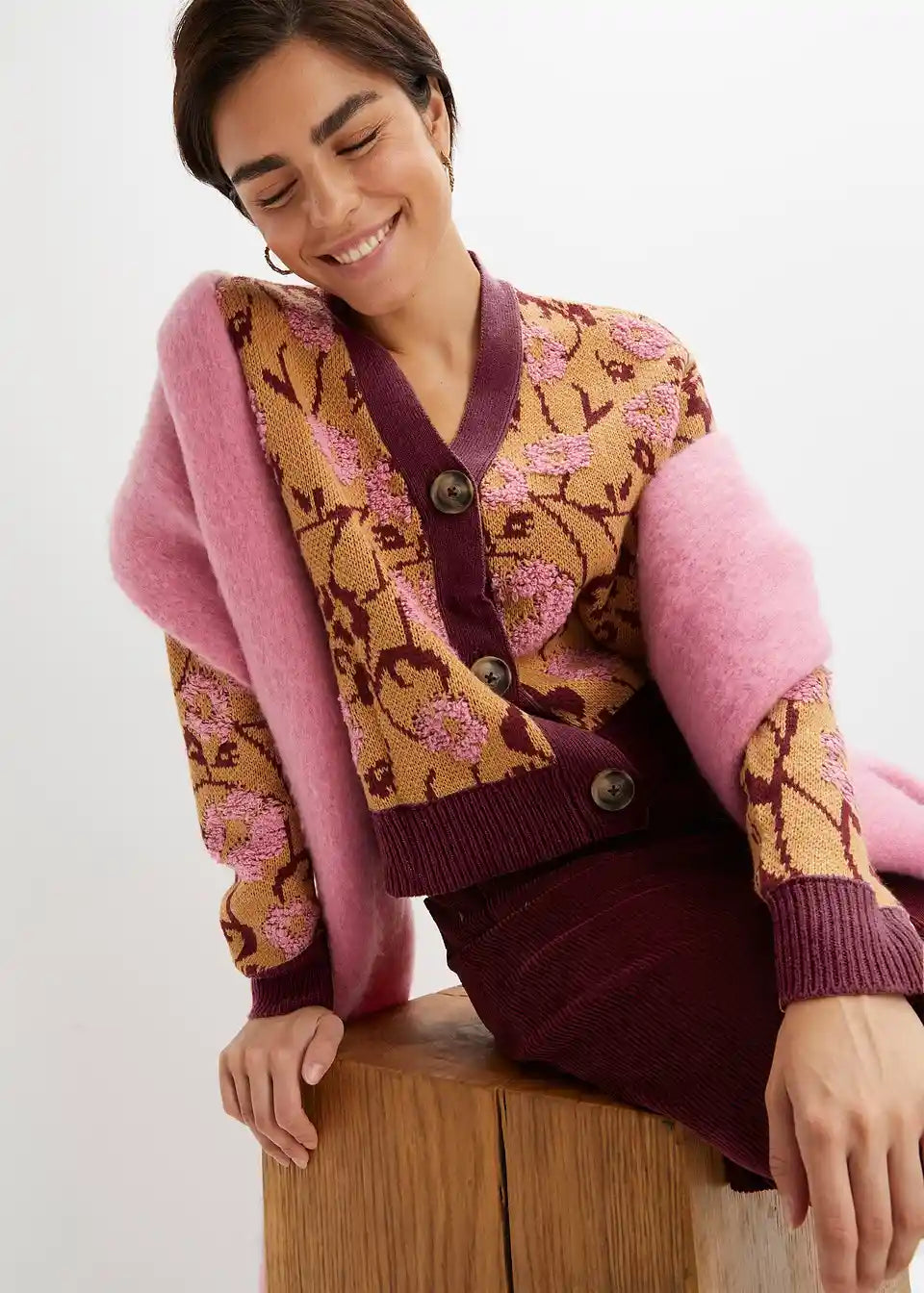 Cvetlični pleteni jopič z gumbi in V-izrezom