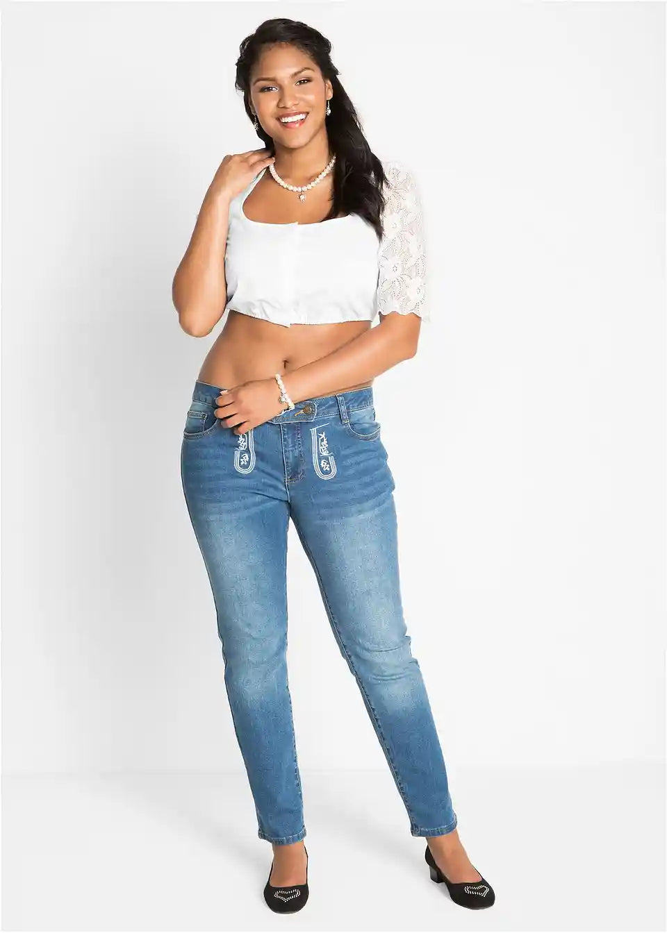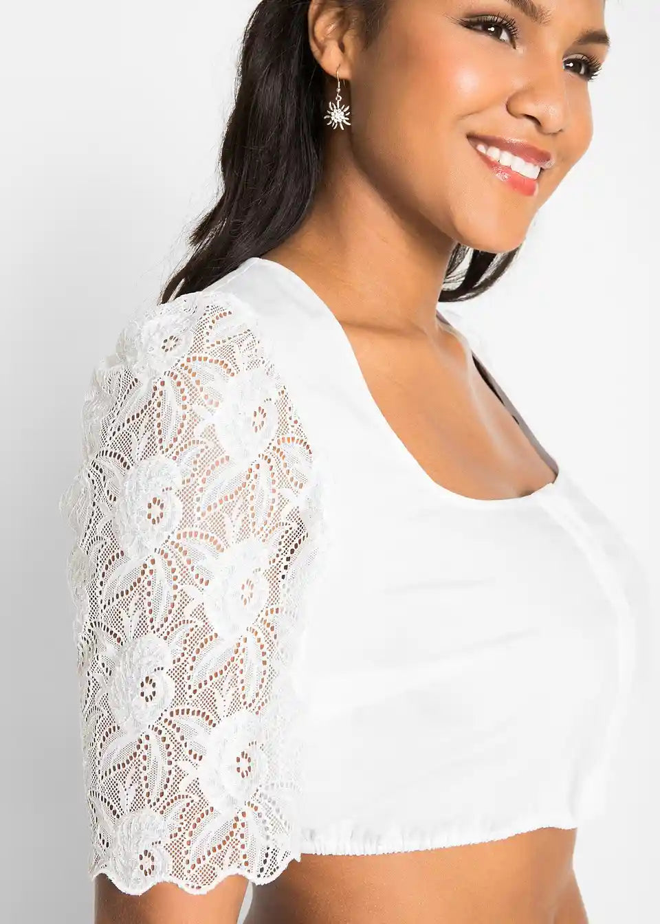Lepa dirndl bluza s čipkastimi rokavi je idealen dodatek k tradicionalnim oblačilom. Zaradi svoje kratke oblike je bluza od bpc odlična za nošenje pod dirndlom. Na sprednji strani se bluza zapenja z zakrito gumbnico. Prozorni rokavi iz nežne čipke modelu dajejo tradicionalni čar. Poleg tega vključuje širok štirikoten izrez, ki lepo poudari dekolte. Kratka spodnja bluza je čudovita kombinacija z dirndl obleko s predpasnikom.