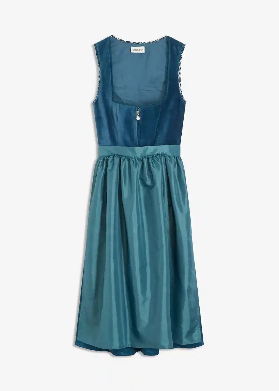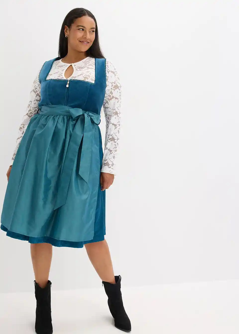 tradicionalni dirndl z visokokakovostnim žametnim steznikom in sijočo predpasnico. Krilo je opremljeno s prijetno bombažno podlogo.