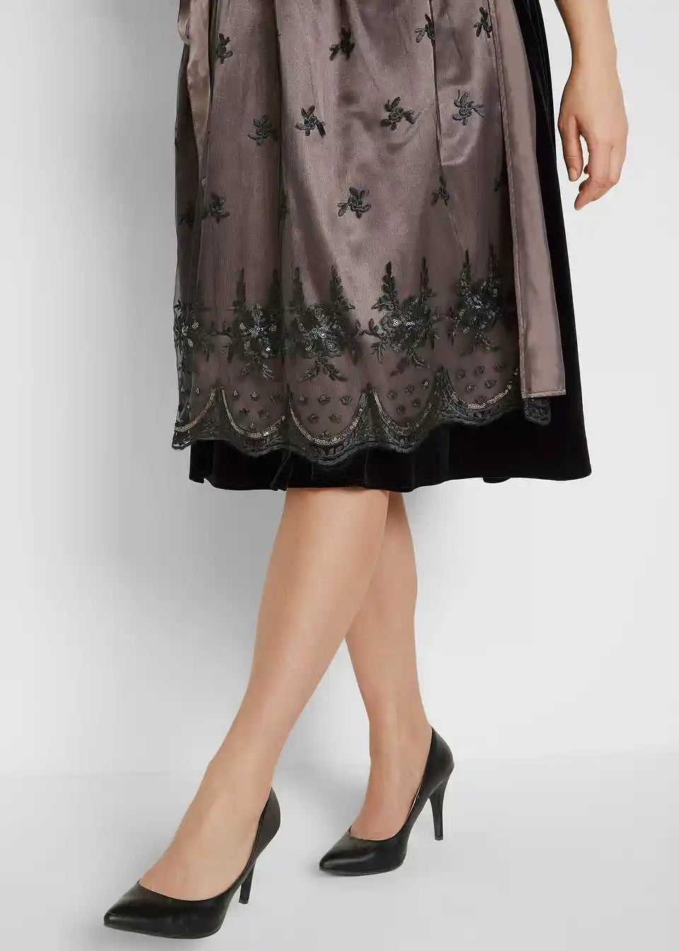 Posebnosti kroja:za poudarjen dekolte, z izrazito poudarjenim pasom, za zakrito zadnjico in boke ter udobje na stegnih