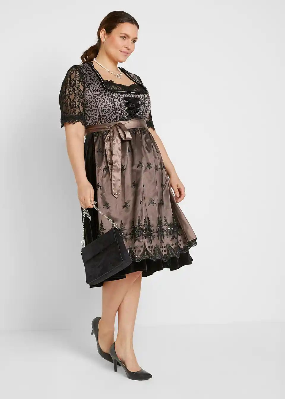 Dirndl z leopardjim vzorcem in stranskim žepom v krilu ponuja odlično možnost za shranjevanje malenkosti.