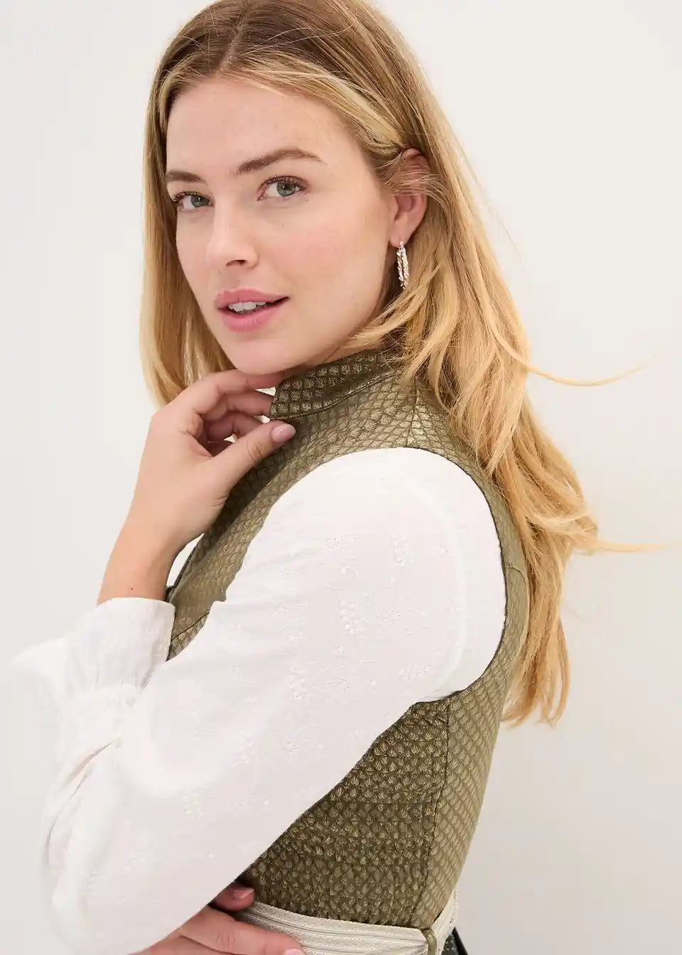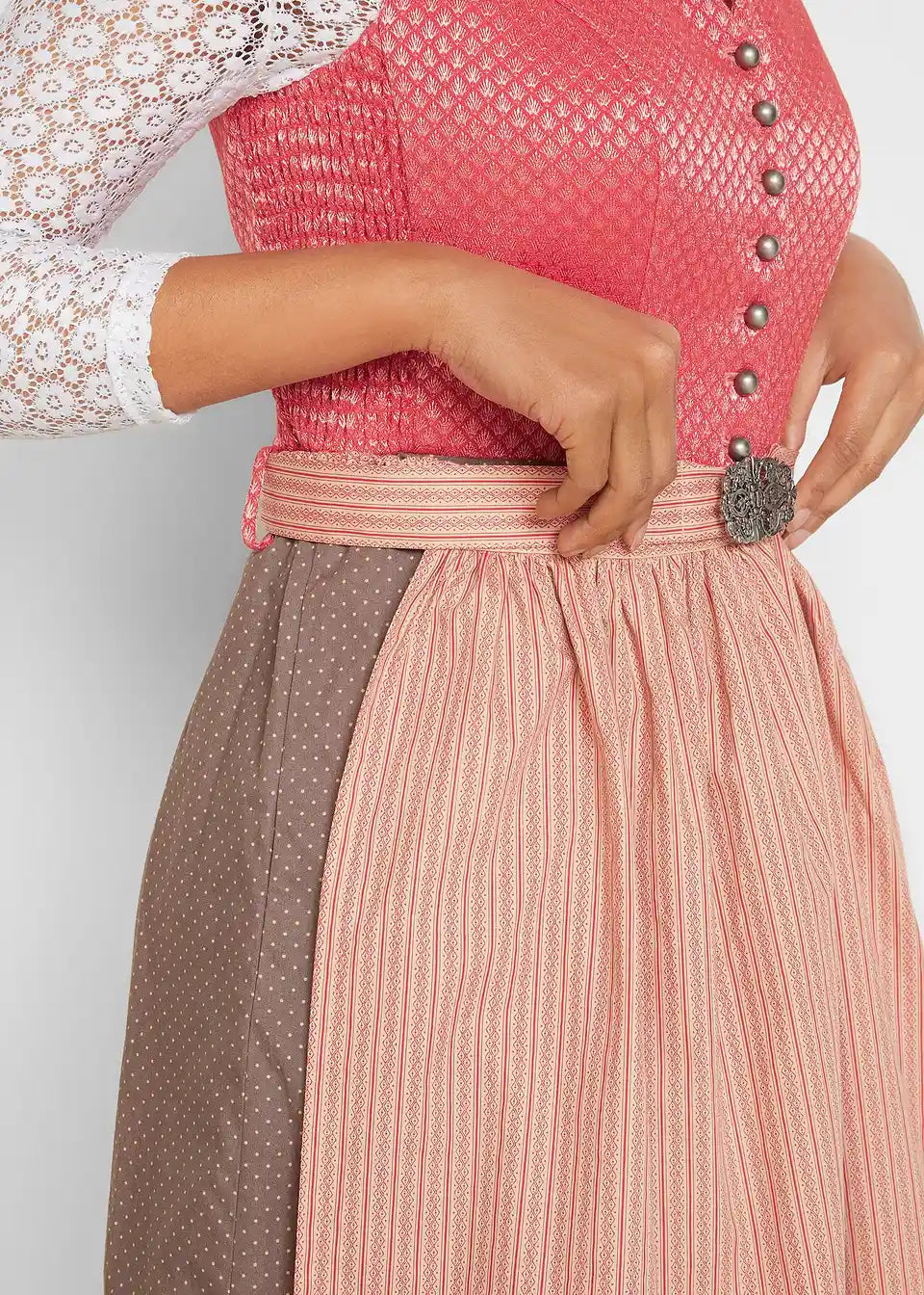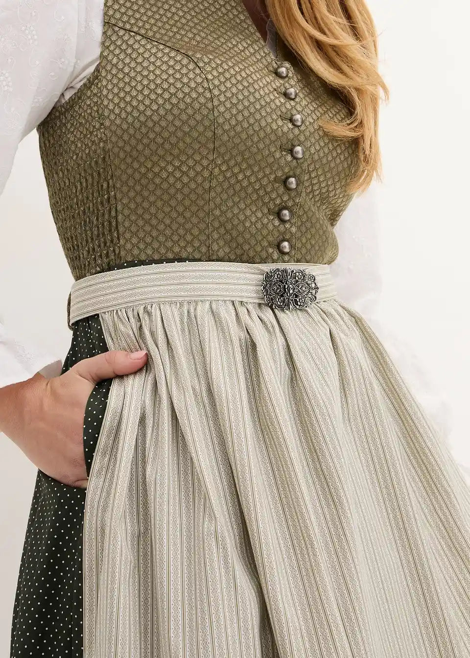 Dirndl z visoko kakovostnim žakardnim steznikom in elastiko na pasu za praktično udobje, predpasnik z dekorativno kovinsko sponko