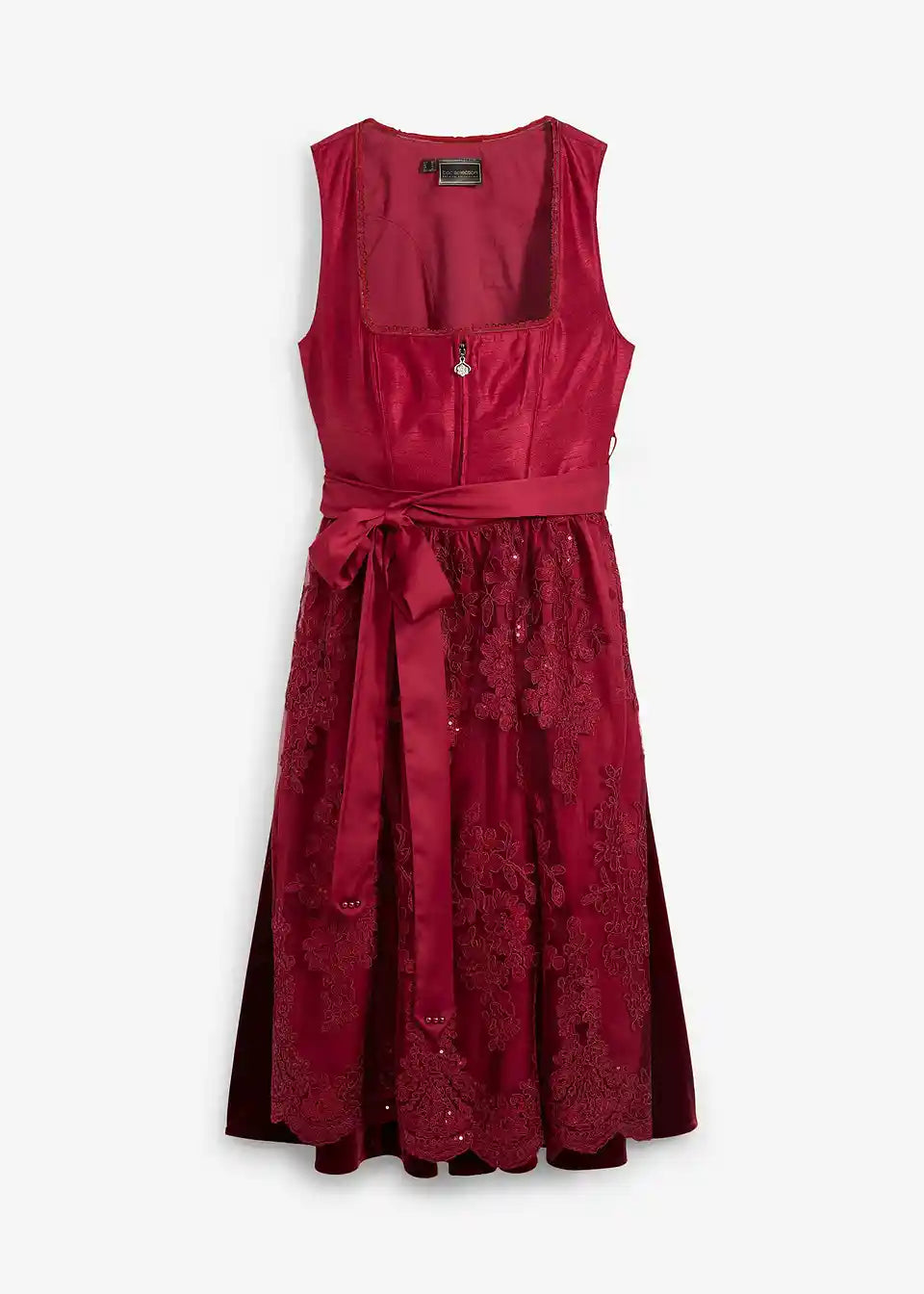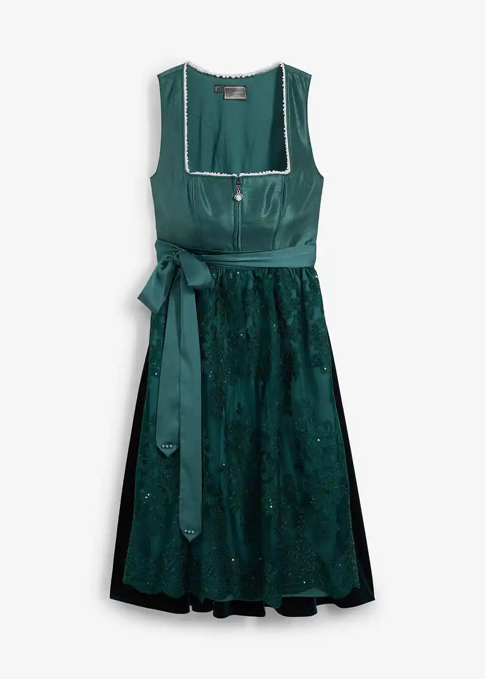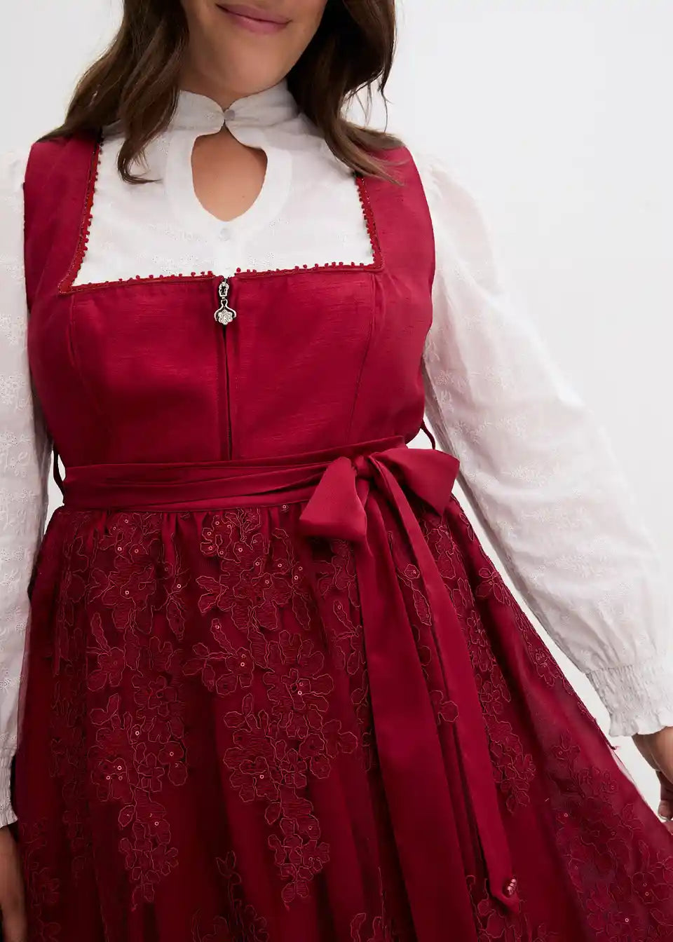 elegantni dirndl z životcem v videzu divje svile, biseri na izrezu, bleščeče žametno krilo in elegantno vezen predpasnik