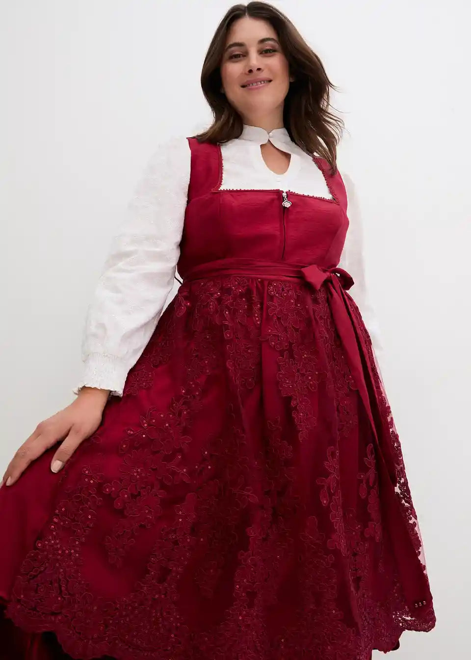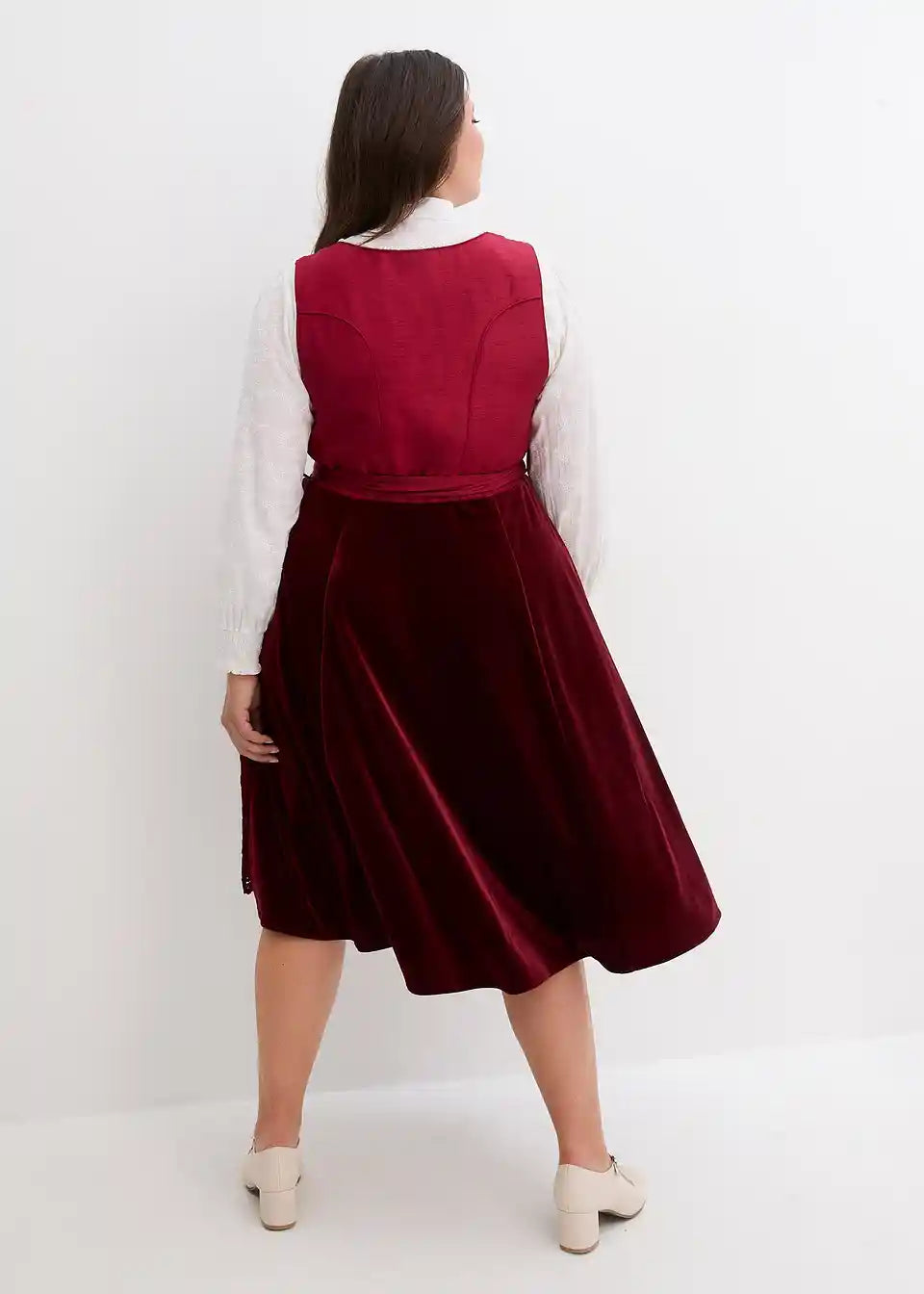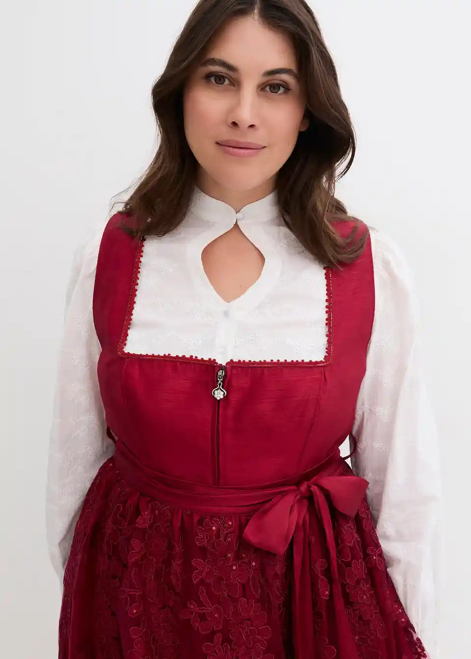 elegantni dirndl z životcem v videzu divje svile, biseri na izrezu, bleščeče žametno krilo in elegantno vezen predpasnik
