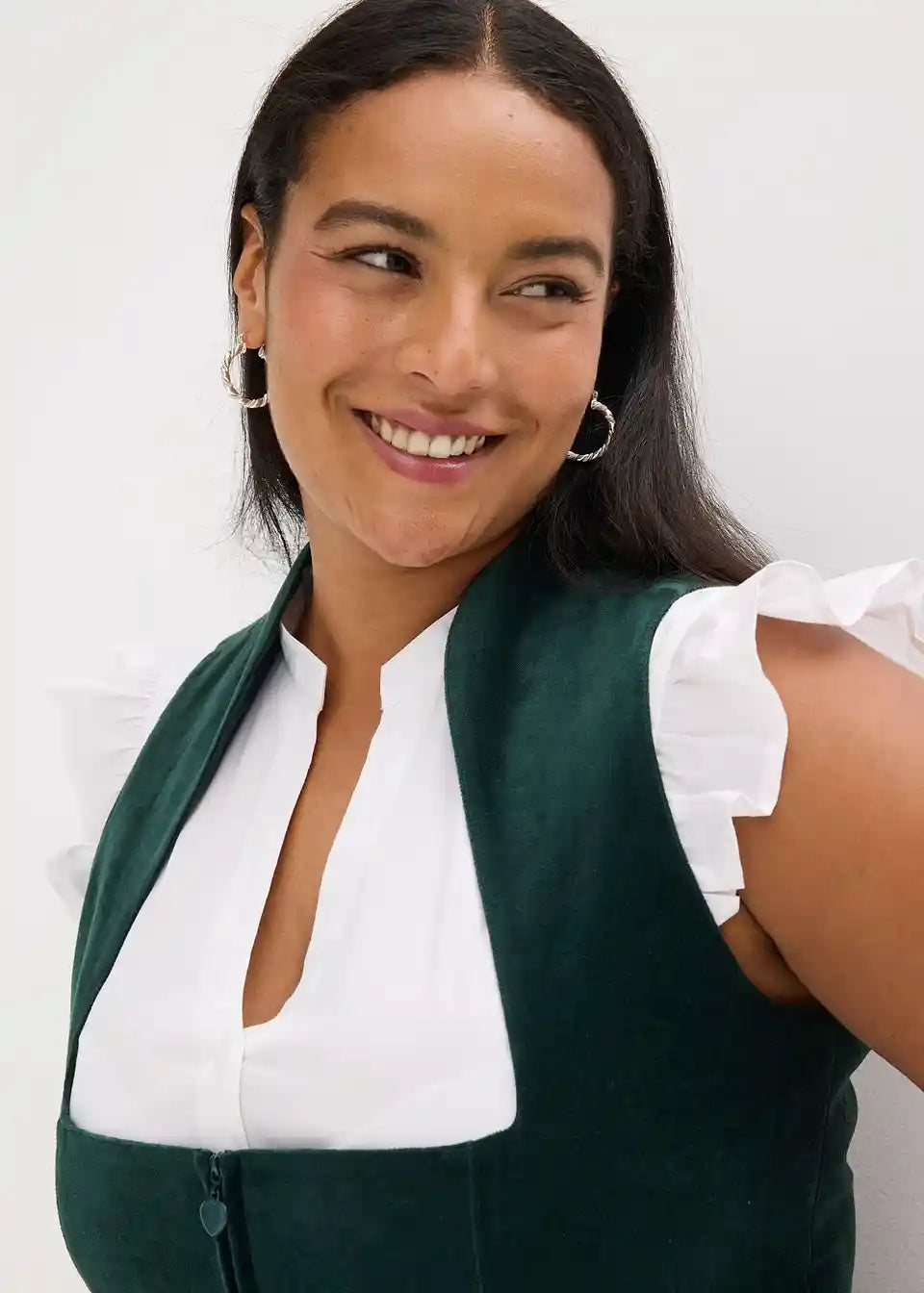 Tradicionalni dirndl z visokokakovostnim žametnim steznikom in spreminjajočim se predpasnikom. Krilo ima prijetno bombažno podlogo.