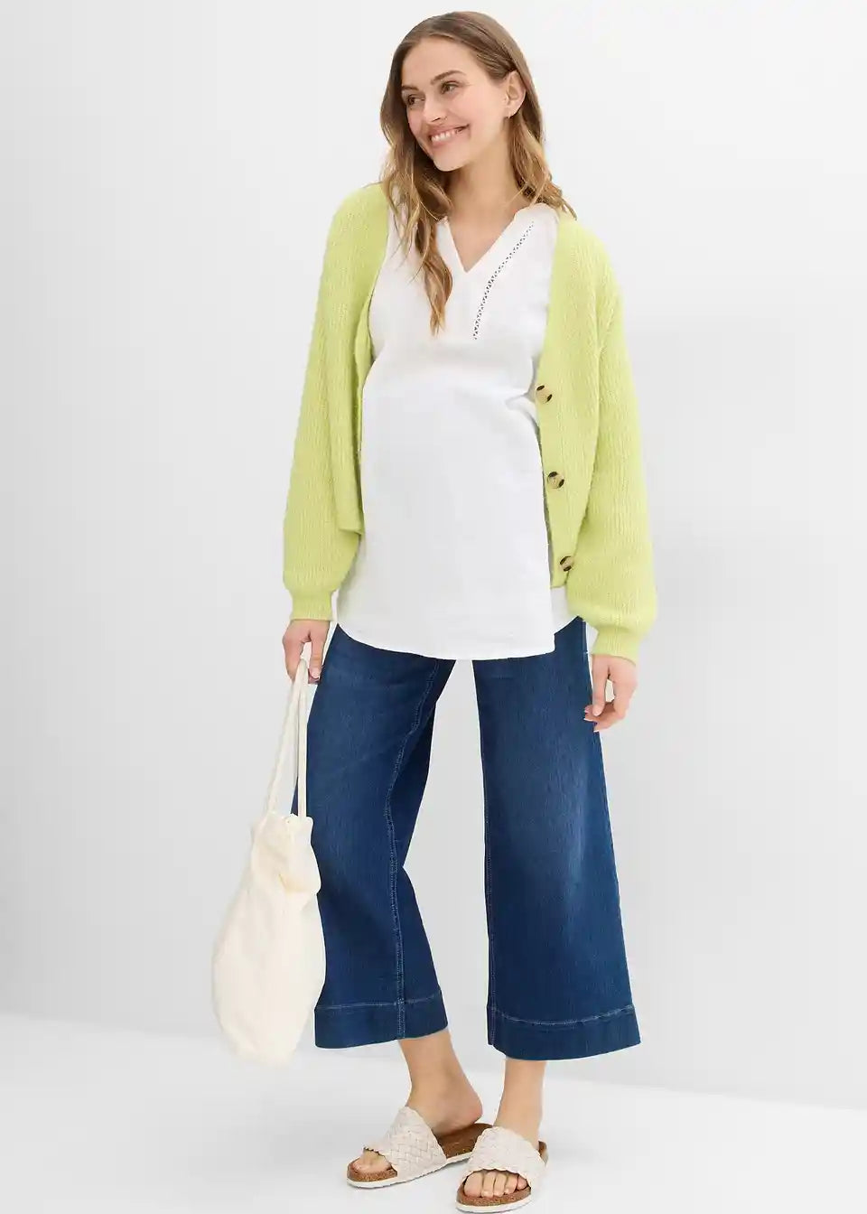 5-žepne kavbojke do gležnjev iz mehkega raztegljivega denima za odlično udobje pri nošenju. Elastičen, nizek pas s skritim in nastavljivim gumijastim trakom omogoča prilagajanje obsegu glede na mesec nosečnosti. Sproščen kroj od bokov do stegen, hlačnice se zaključijo z dekorativnim zavihkom. Širok, všit pas iz bombažnega jerseya z raztegljivim materialom za optimalno prileganje trebuščku.