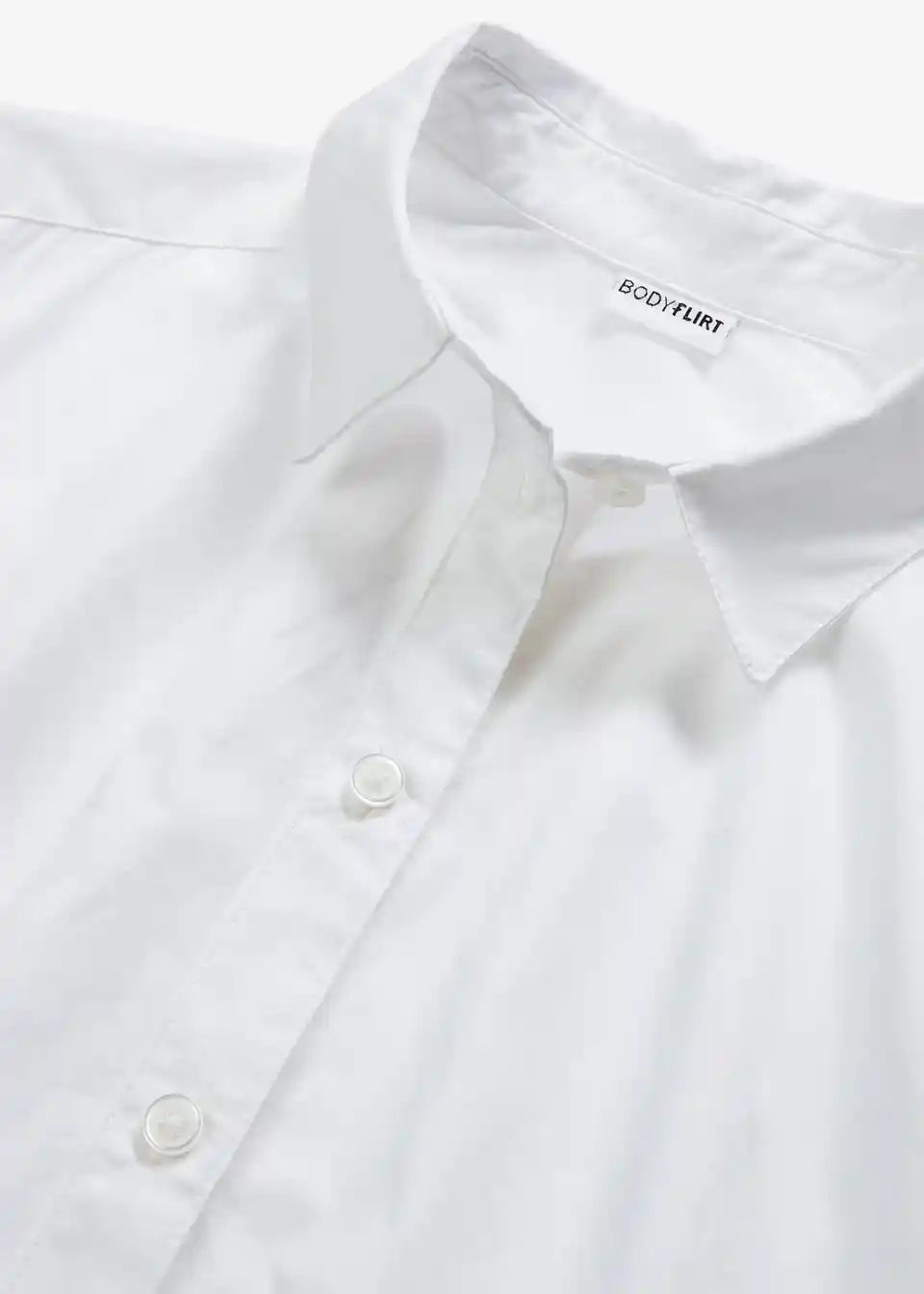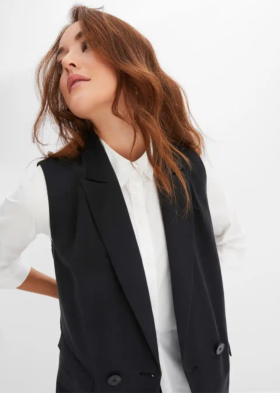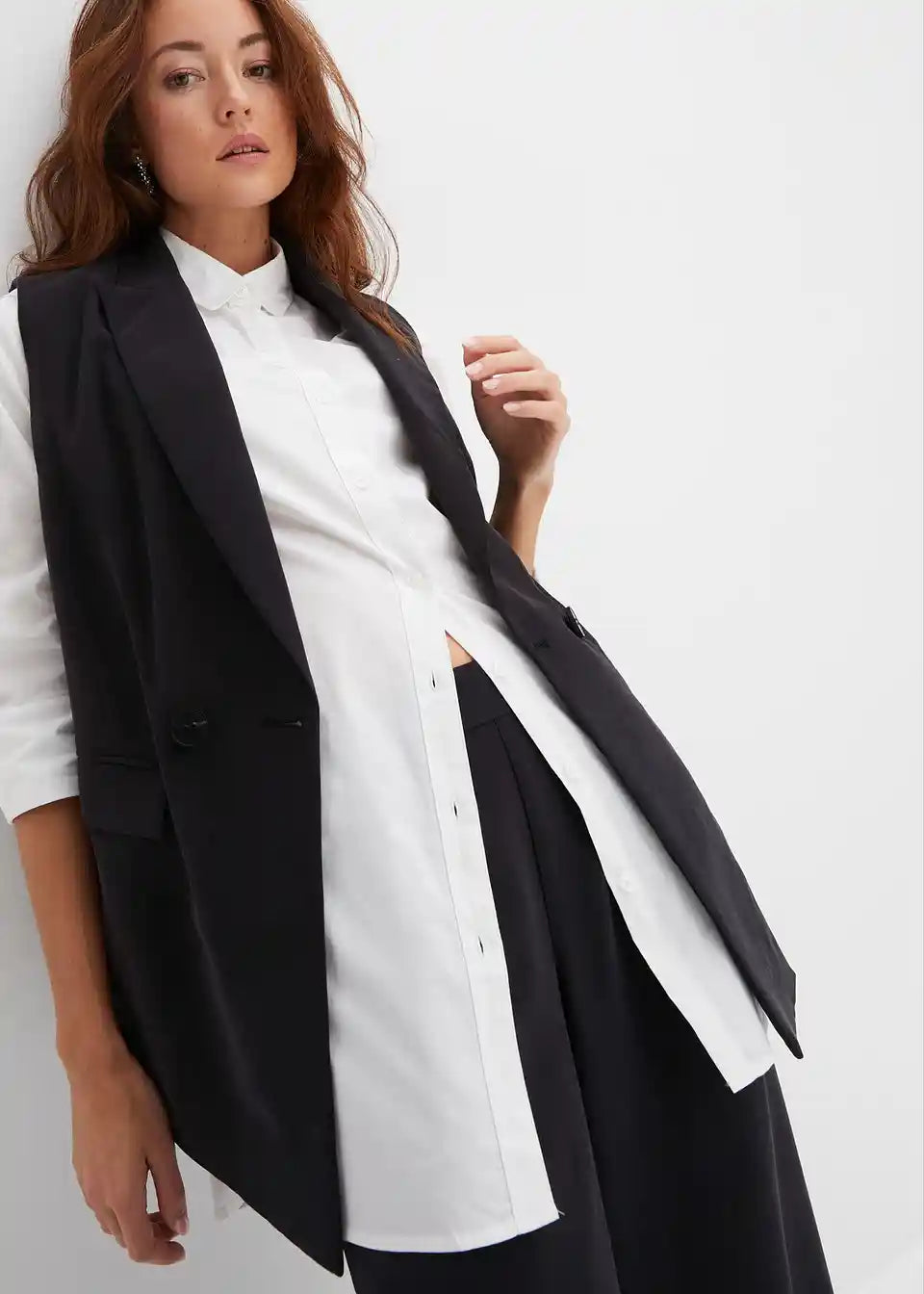 Dolga bluza z zaobljenim robom, prišitim gumbnim zapenjanjem in klasičnim stoječim ovratnikom. Dolžina v št. 38 približno 80 cm.