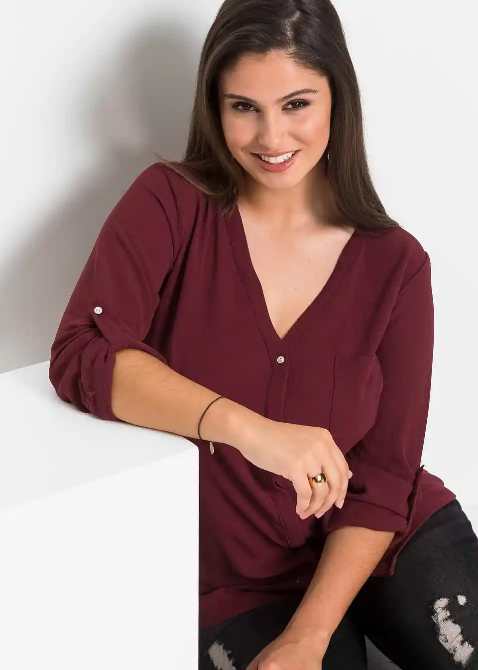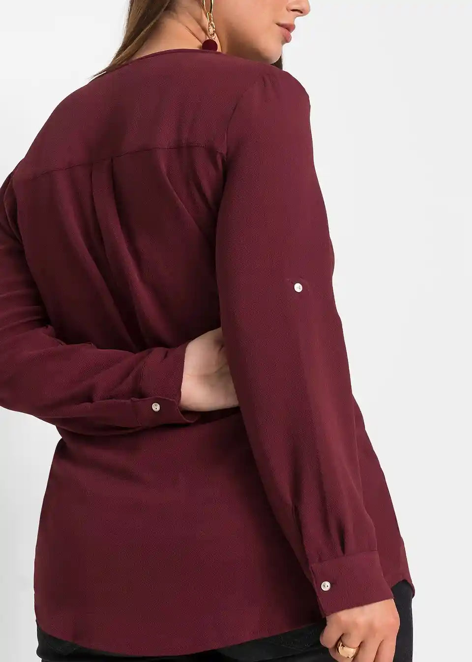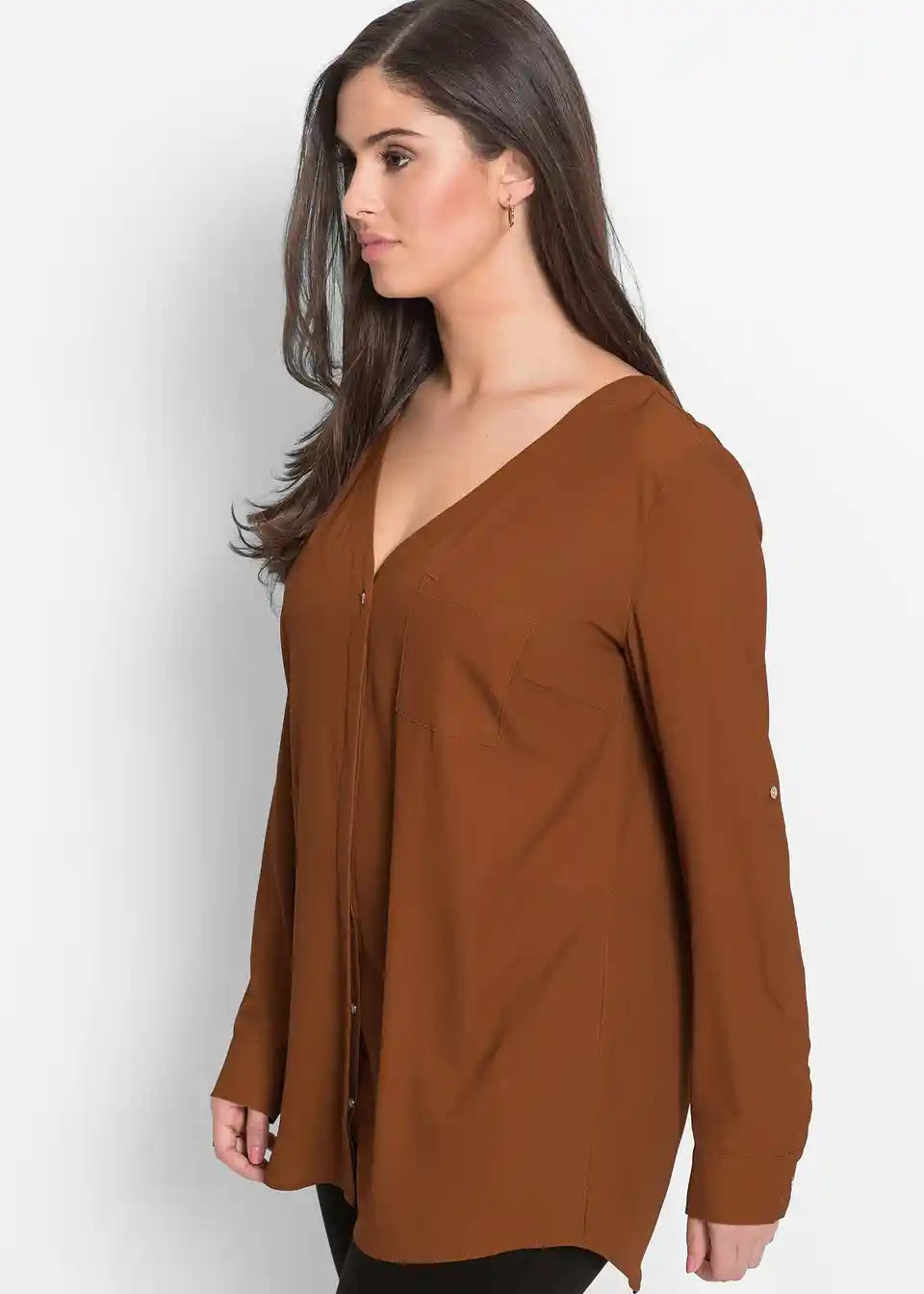 Lahkotna in rahlo prosojna bluza z dolgimi rokavi in globokim V-izrezom iz krep materiala. Z zapenjanjem na skrite gumbe, rokavi se lahko zavihajo in pritrdijo s paščkom in gumbom. Dolžina pri vel. 38 je približno 74 cm.