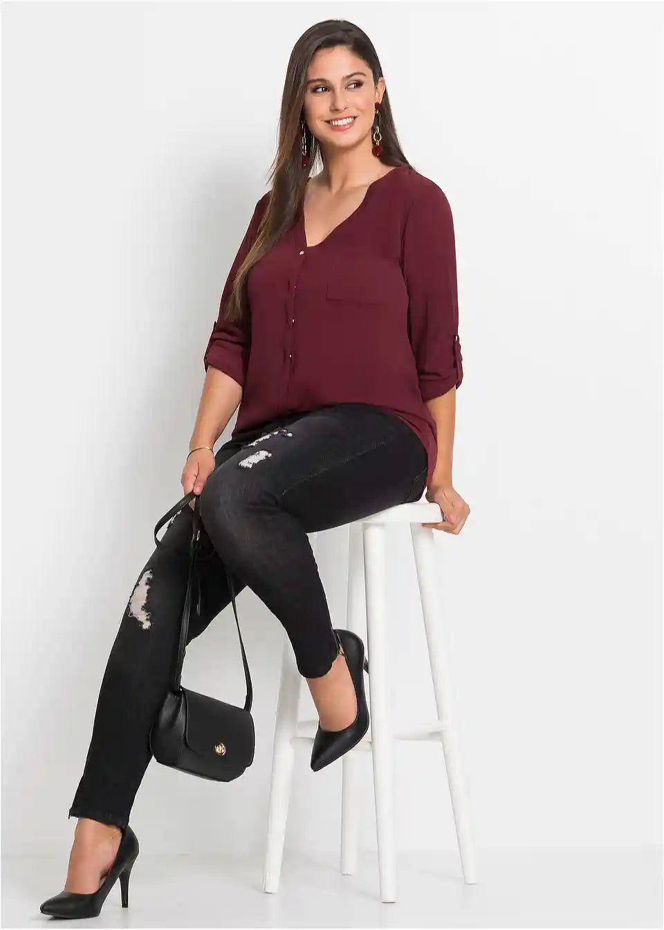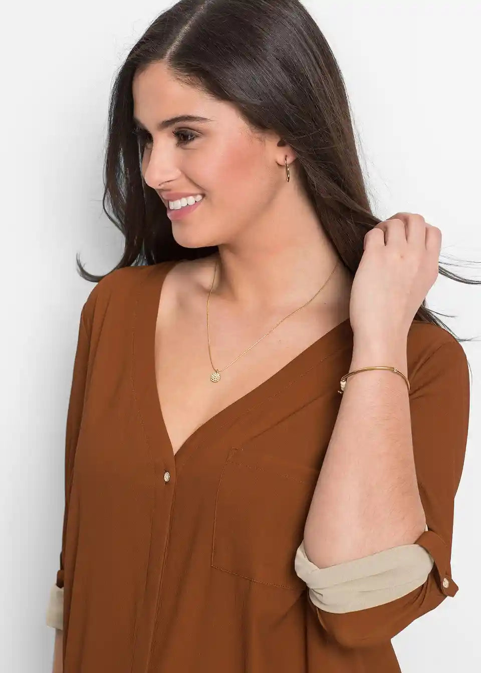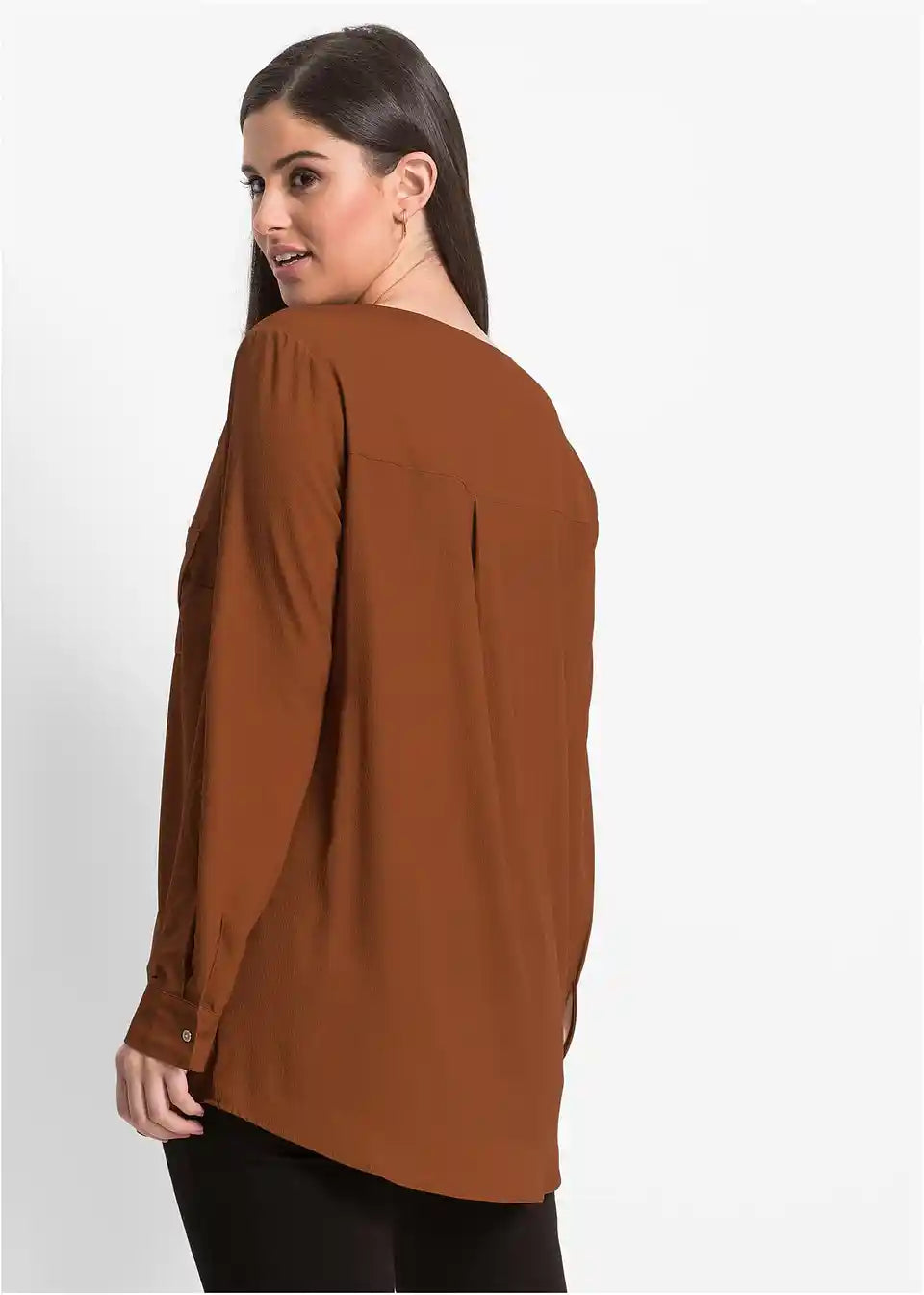 Lahkotna in rahlo prosojna bluza z dolgimi rokavi in globokim V-izrezom iz krep materiala. Z zapenjanjem na skrite gumbe, rokavi se lahko zavihajo in pritrdijo s paščkom in gumbom. Dolžina pri vel. 38 je približno 74 cm.