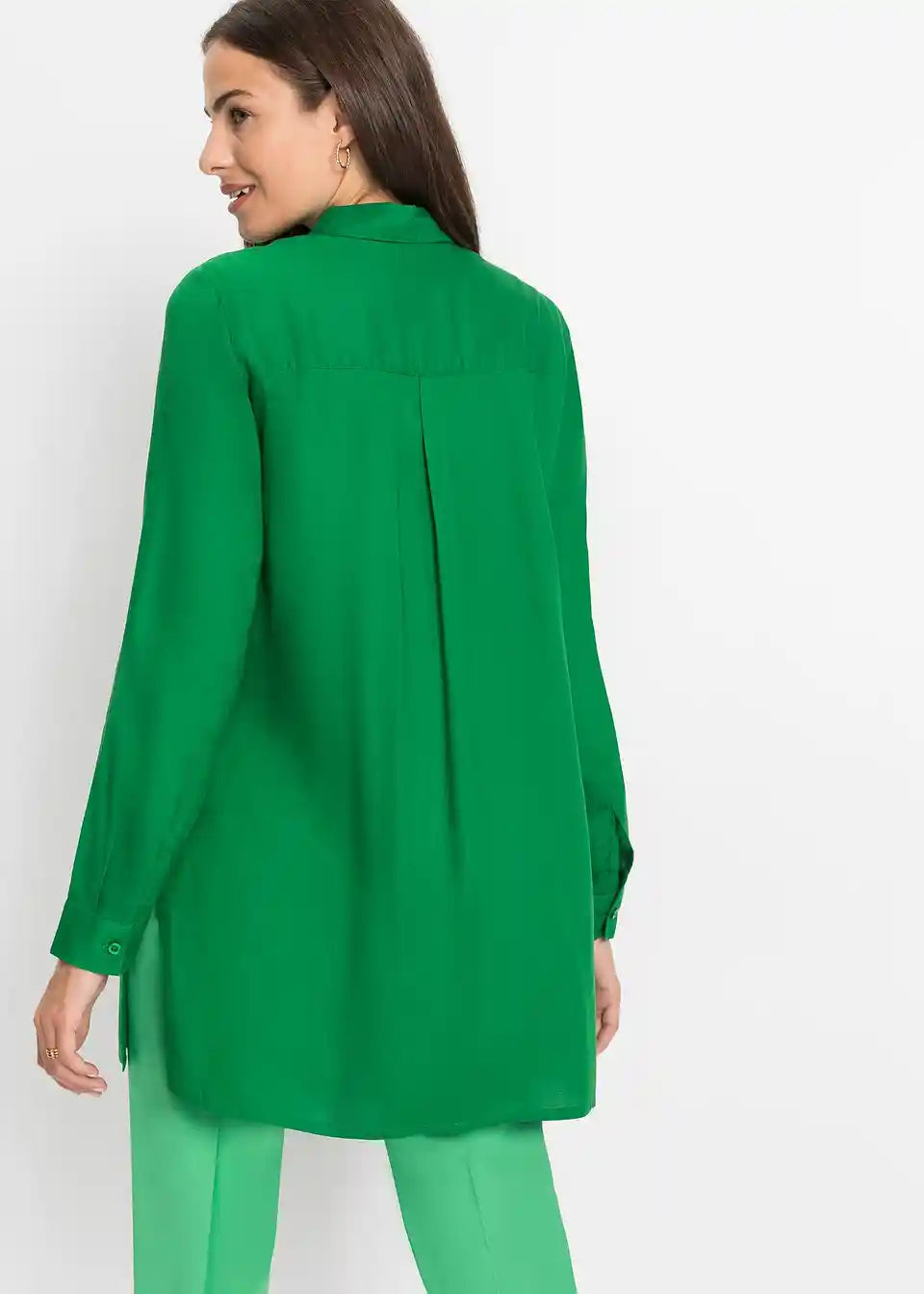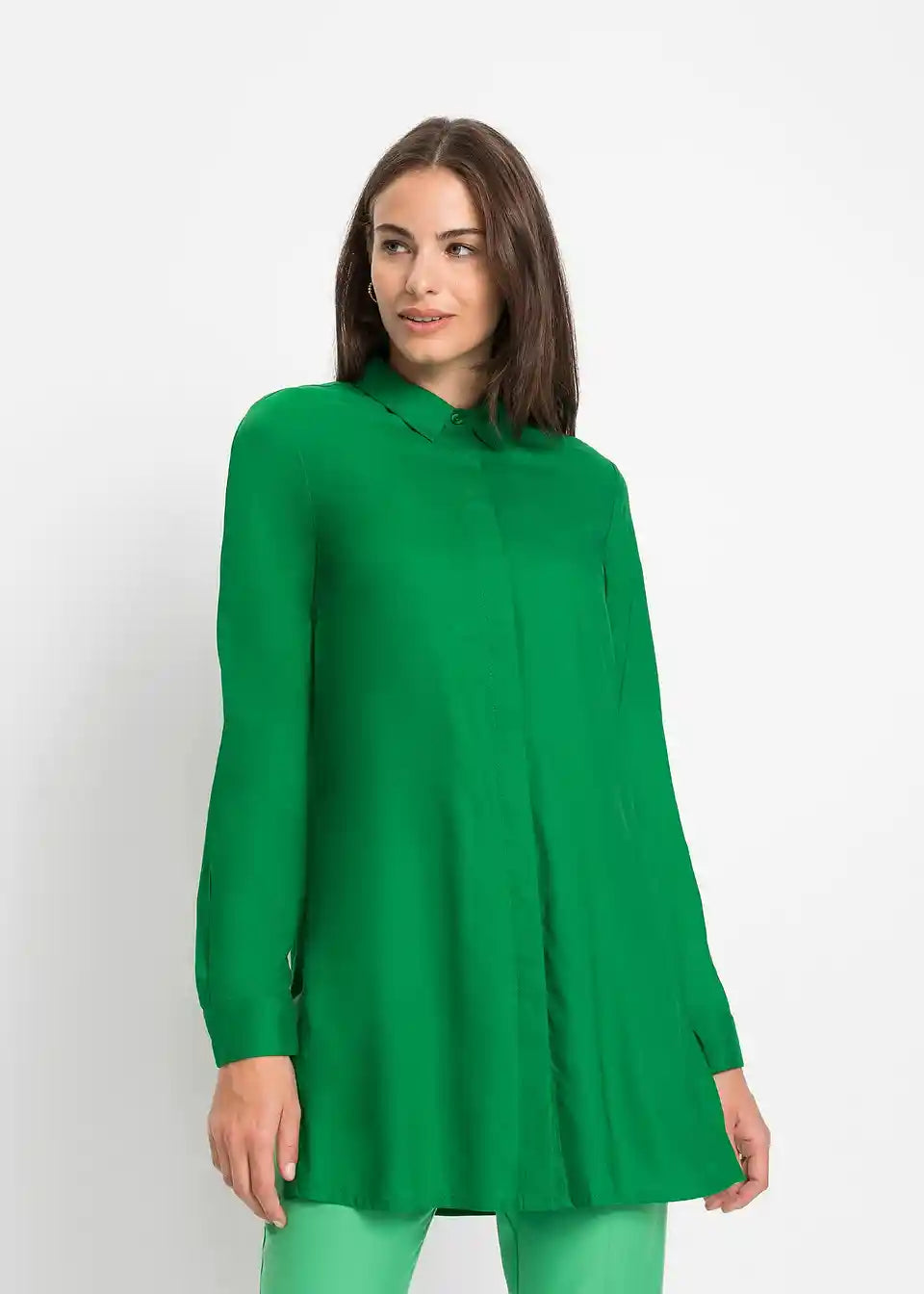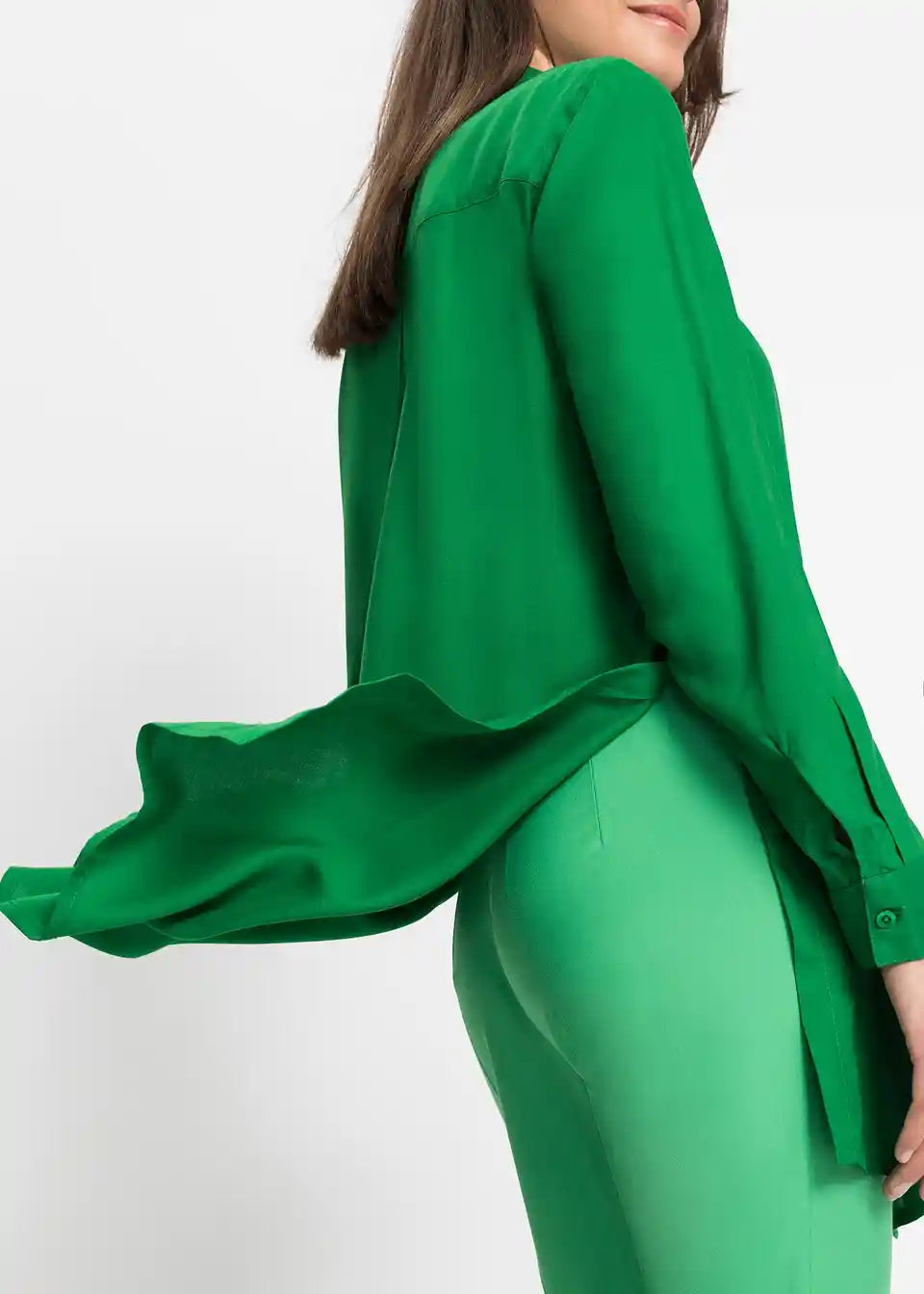 Modna dolga bluza z atraktivnim detajlom preklopa in skrito gumbnico.