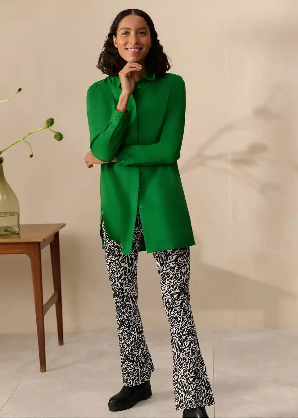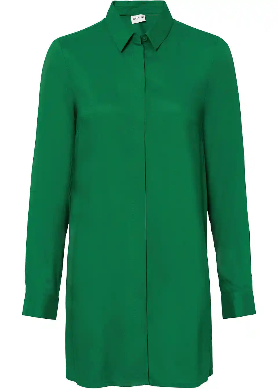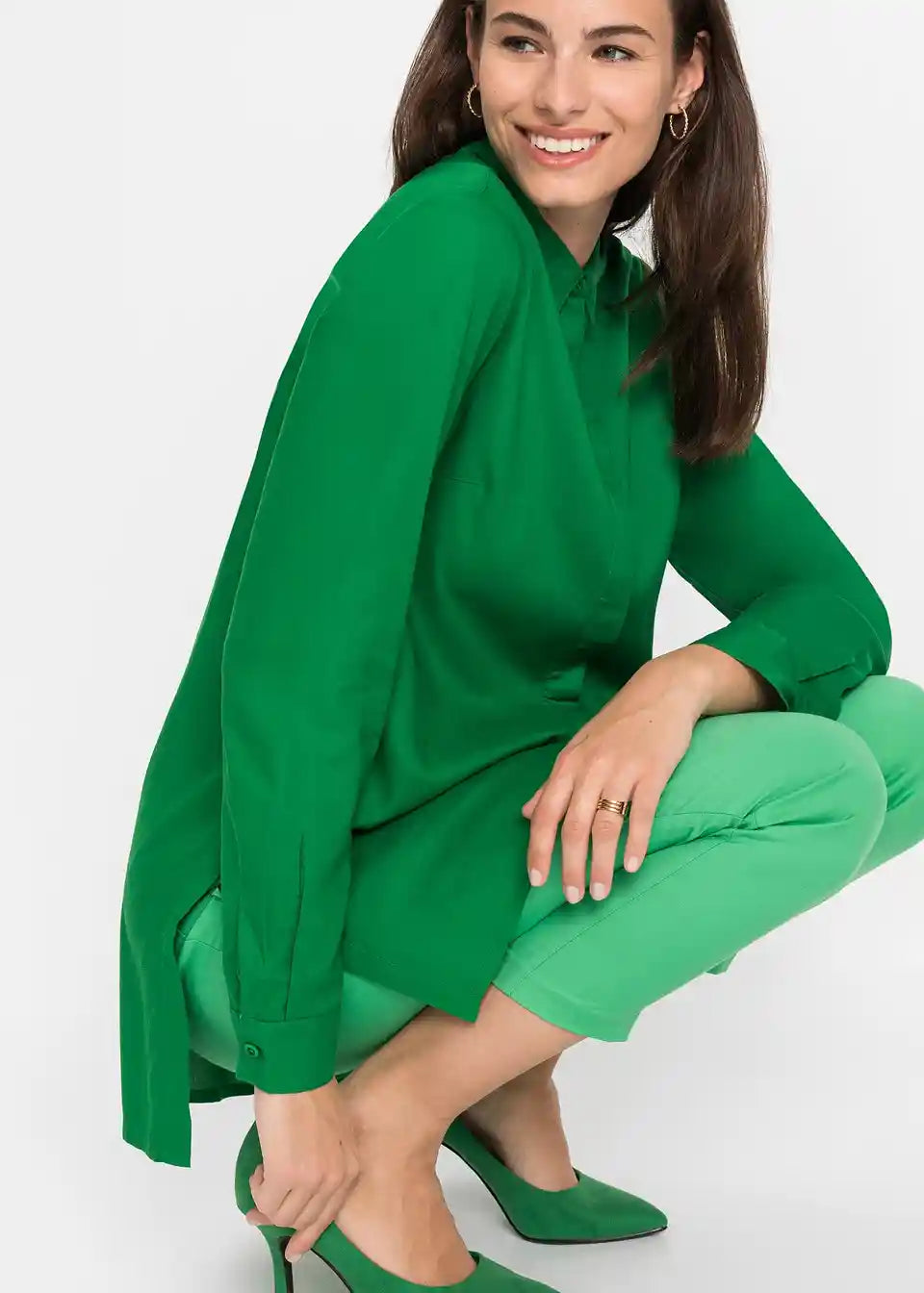 Modna dolga bluza z atraktivnim detajlom preklopa in skrito gumbnico.