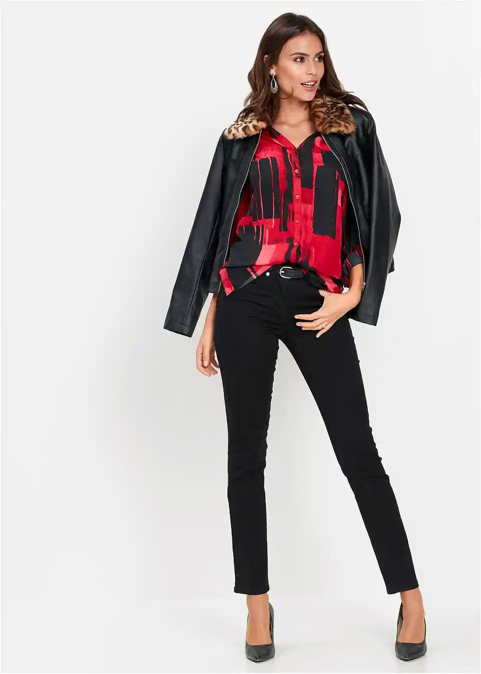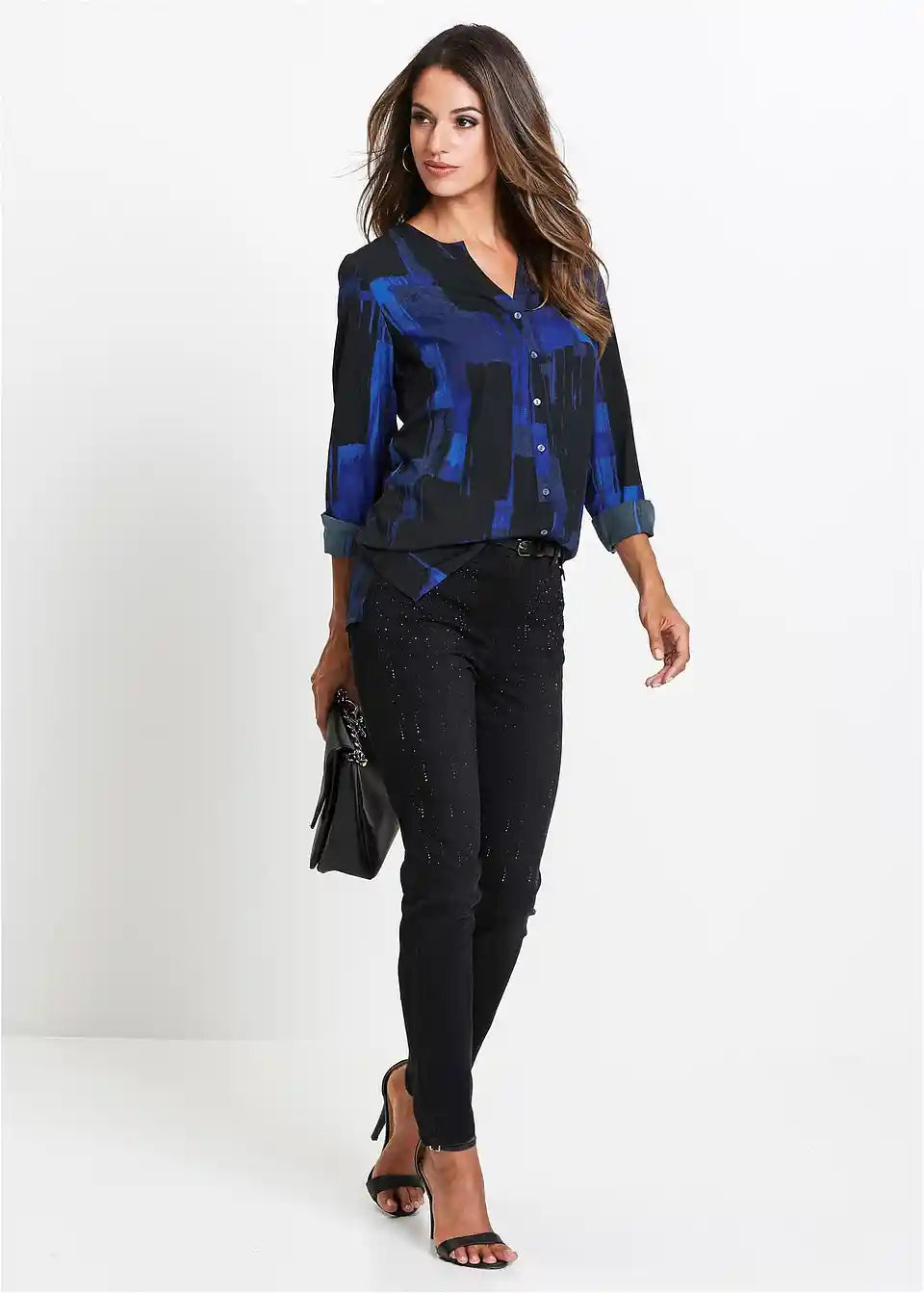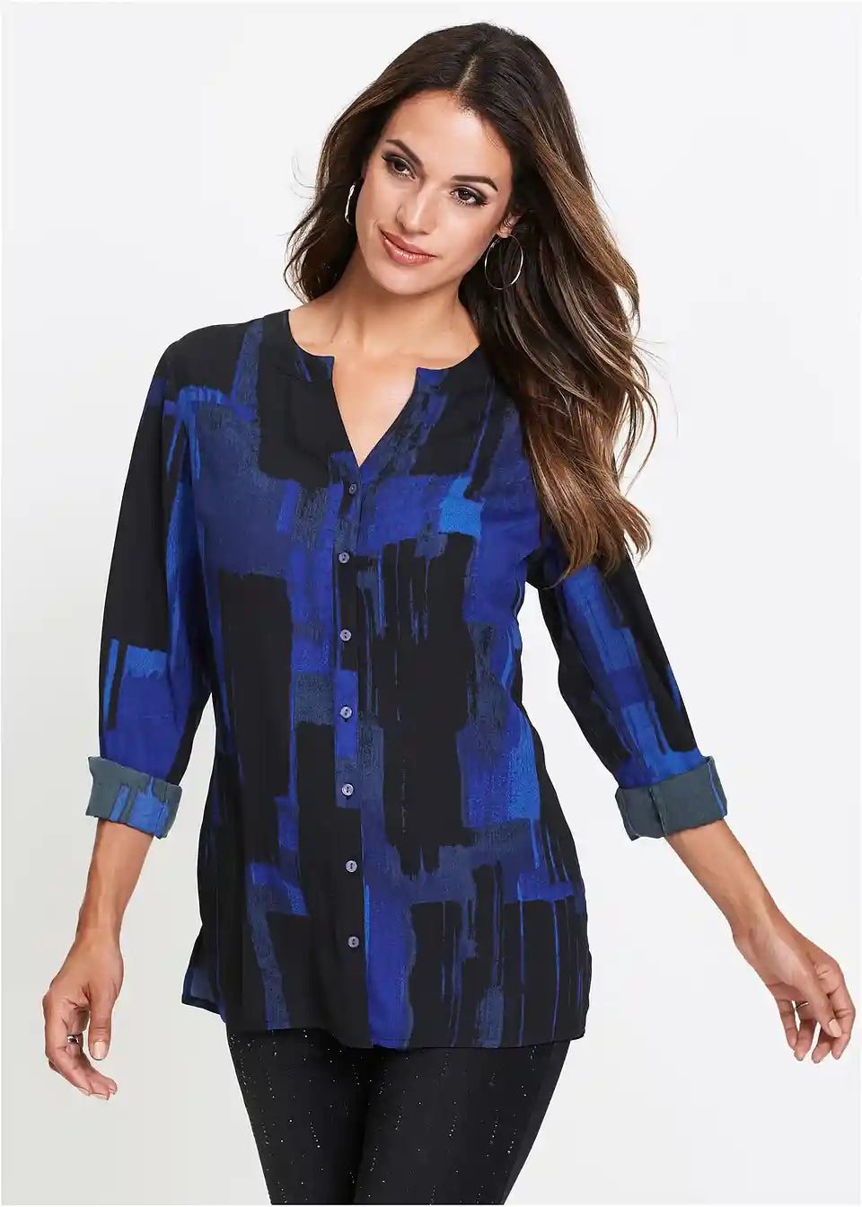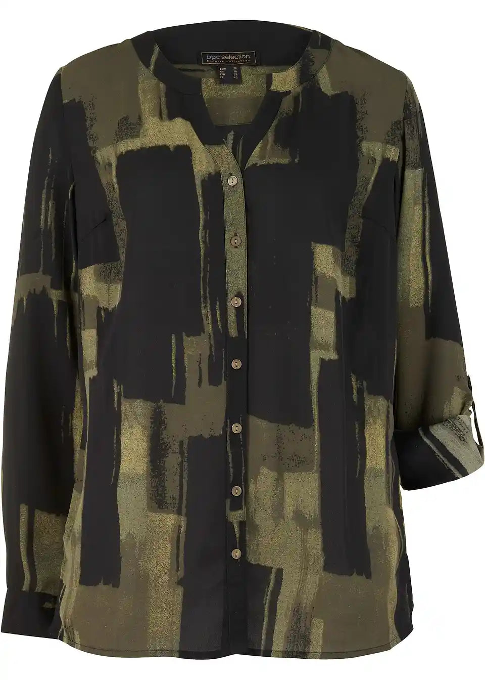V trendovskem vzorcu, z majhnim stoječim ovratnikom in sprednjim zapenjanjem na gumbe, dolgimi rokavi z možnostjo zavihanja, majhnimi stranskimi razporki, dolžina približno 69 cm (št. 36) do približno 78 cm (št. 54), primerna za strojno pranje,
