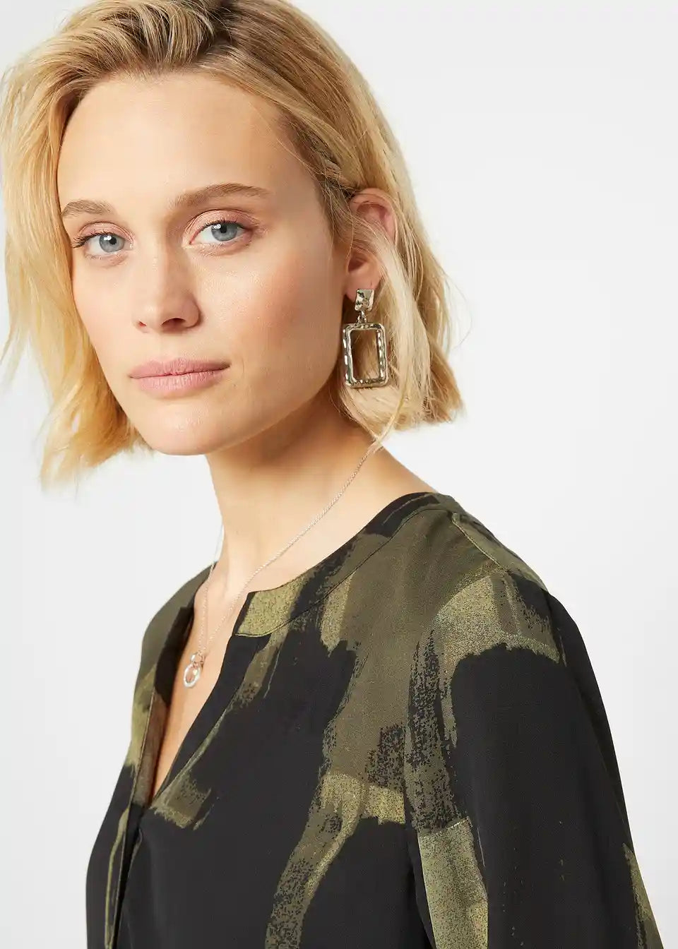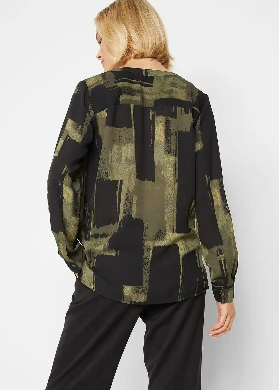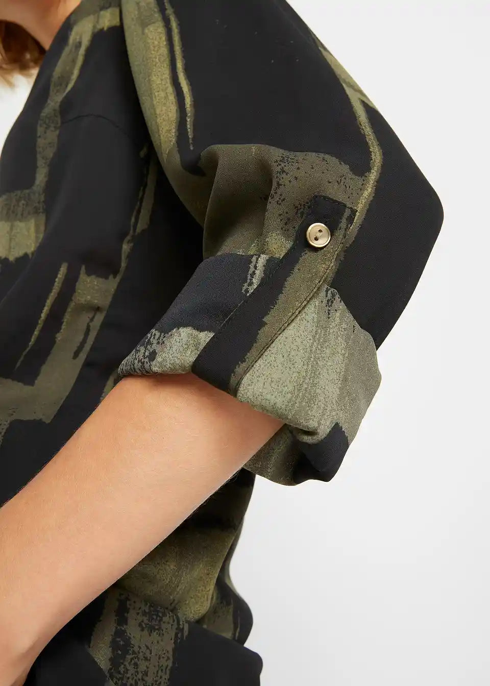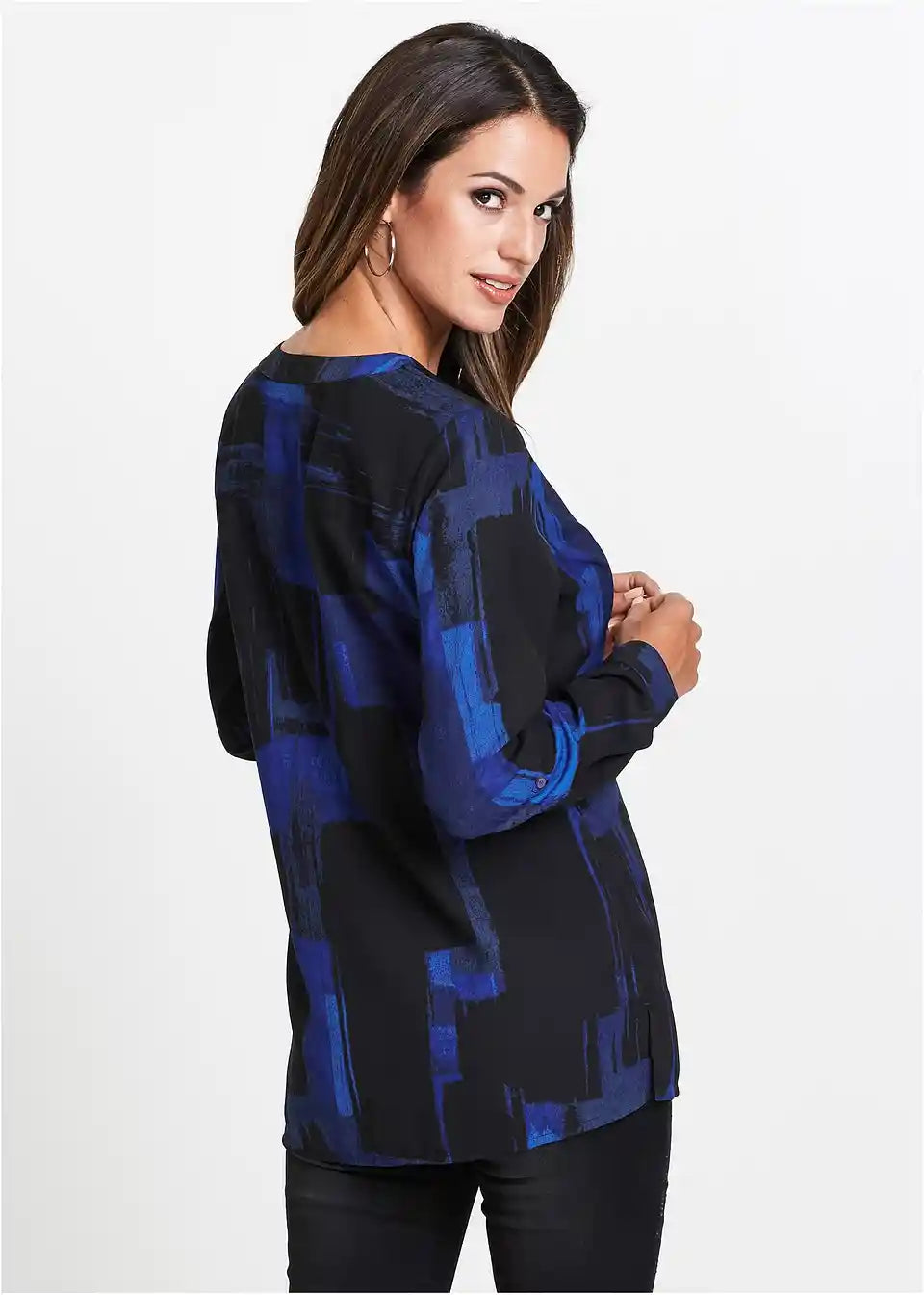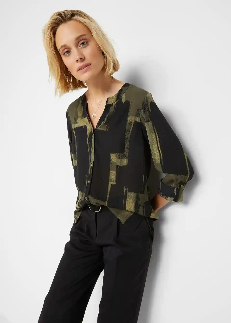 V trendovskem vzorcu, z majhnim stoječim ovratnikom in sprednjim zapenjanjem na gumbe, dolgimi rokavi z možnostjo zavihanja, majhnimi stranskimi razporki, dolžina približno 69 cm (št. 36) do približno 78 cm (št. 54), primerna za strojno pranje,