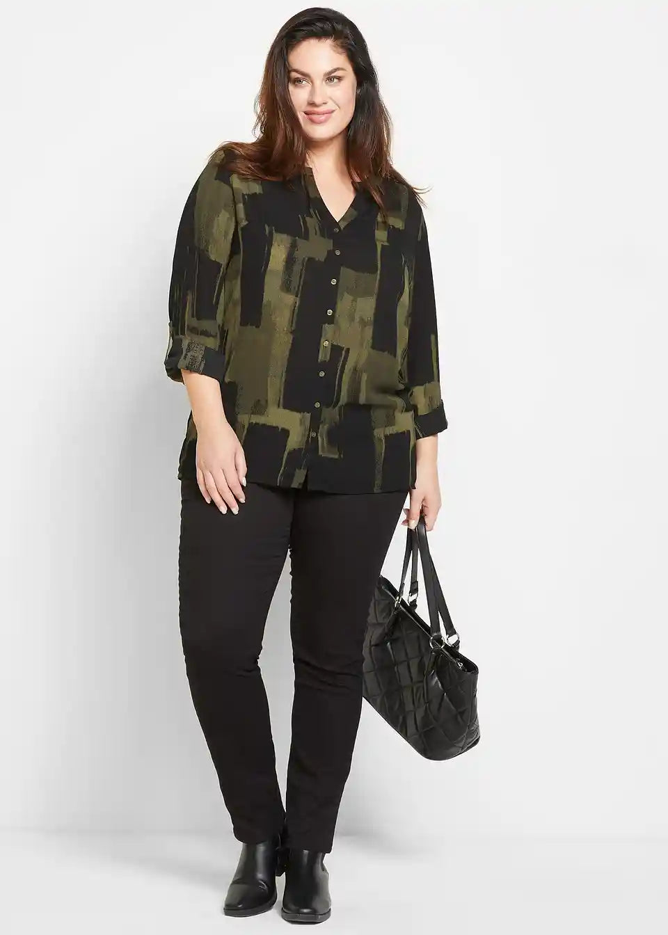 V trendovskem vzorcu, z majhnim stoječim ovratnikom in sprednjo zapenjanjem, dolgimi rokavi s funkcijo zavihanja, majhnimi stranskimi razporki, dolžina od pribl. 69 cm (velikost 36) do pribl. 78 cm (velikost 54), pralna v pralnem stroju,