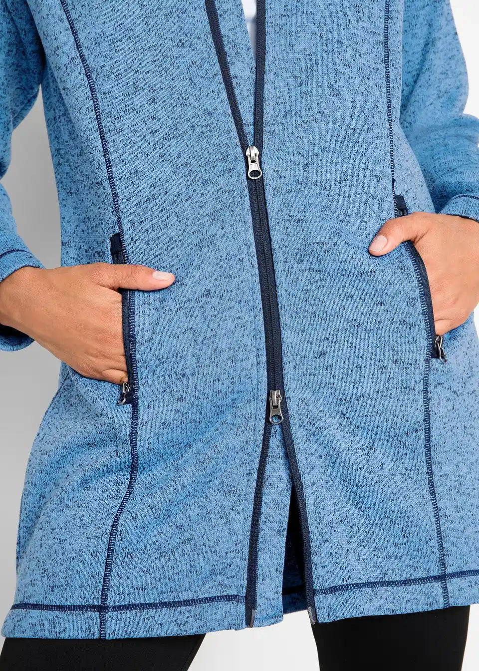 Udoben pleten jopič s kapuco in dvosmerno zadrgo