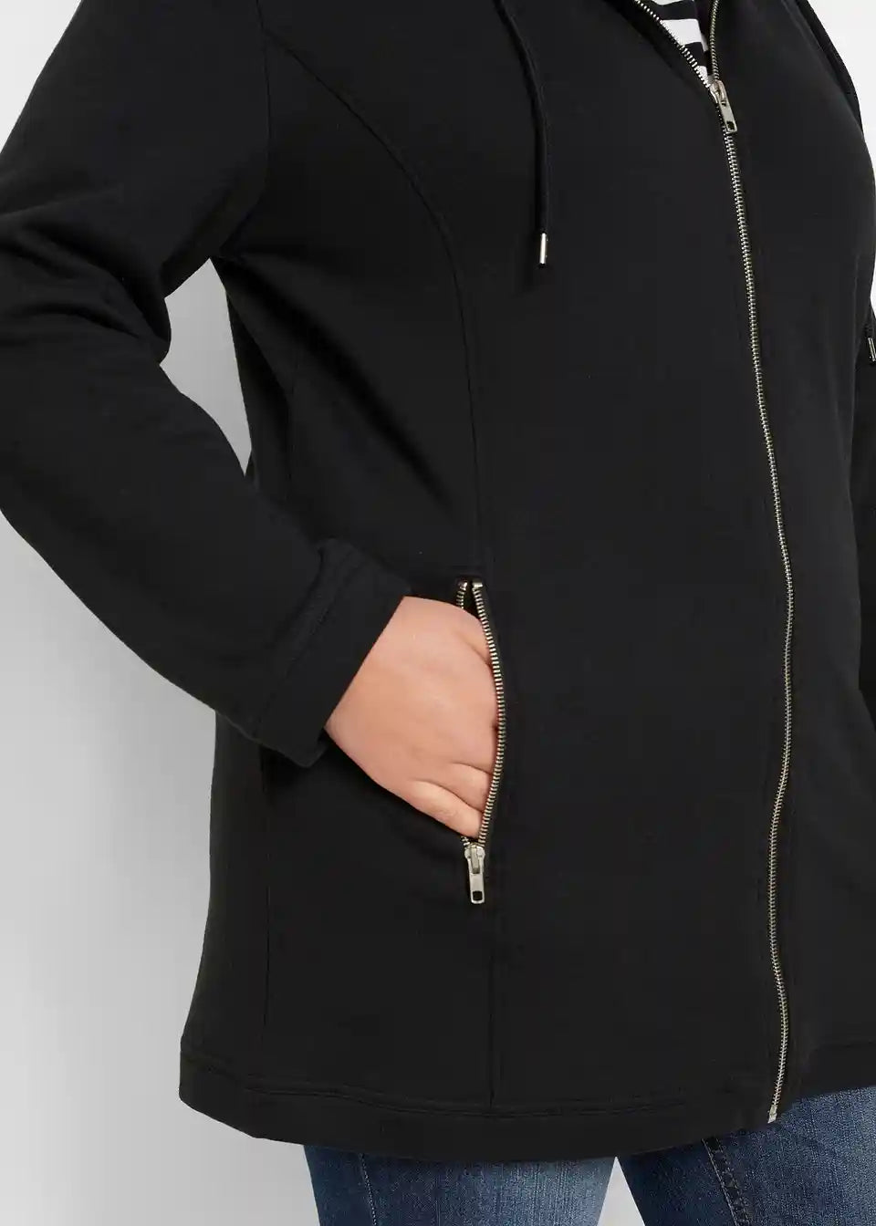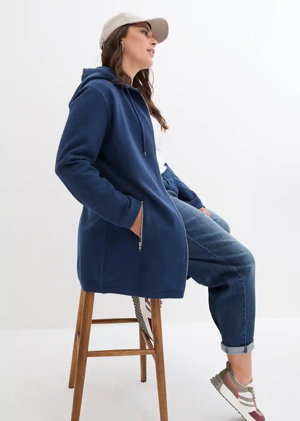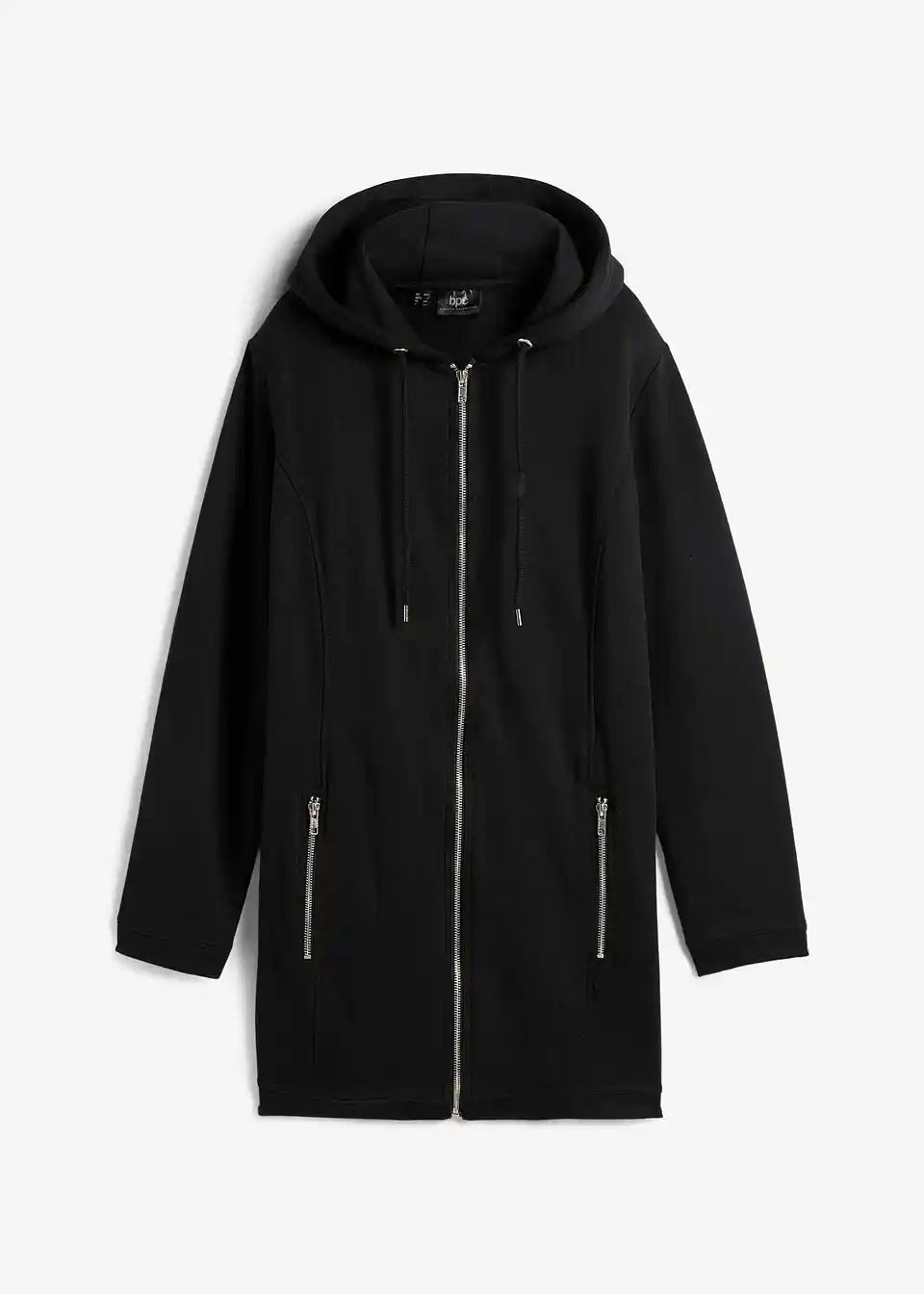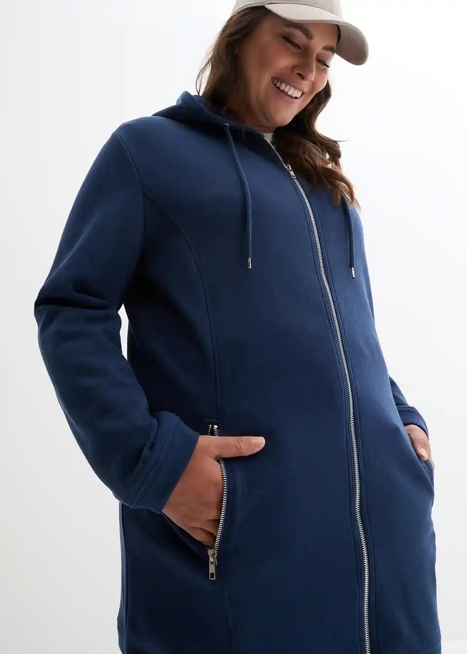 Udobna dolga jopica iz trenirke s kapuco in poševnimi žepi