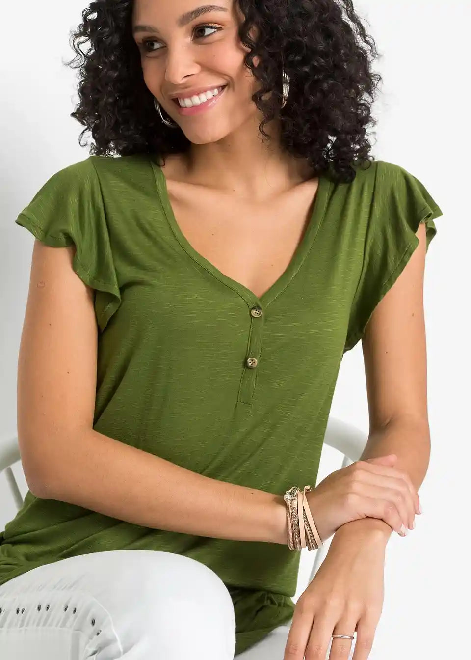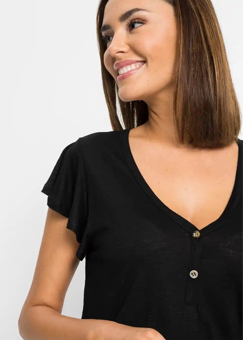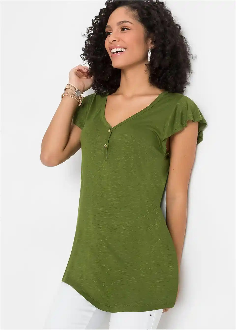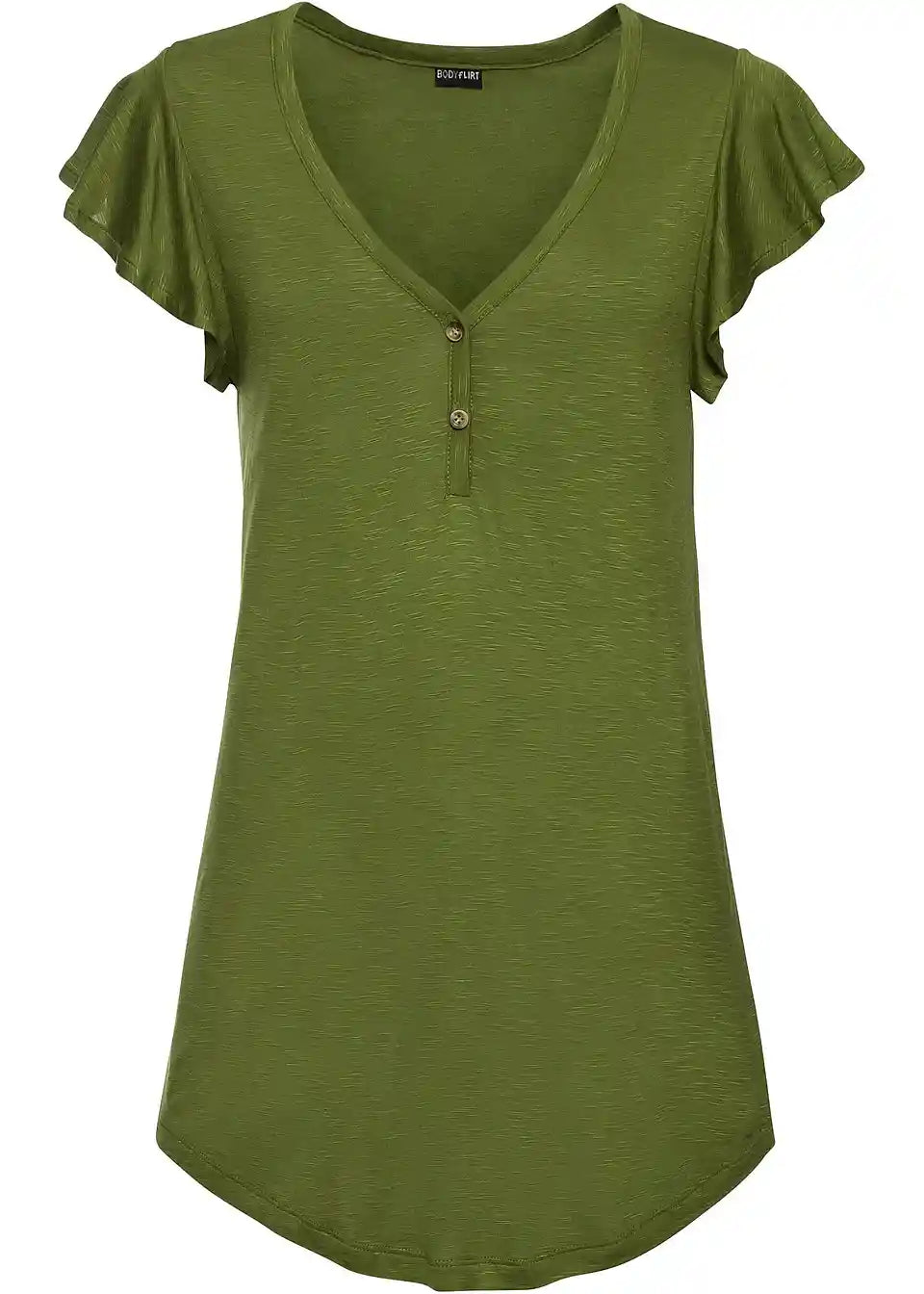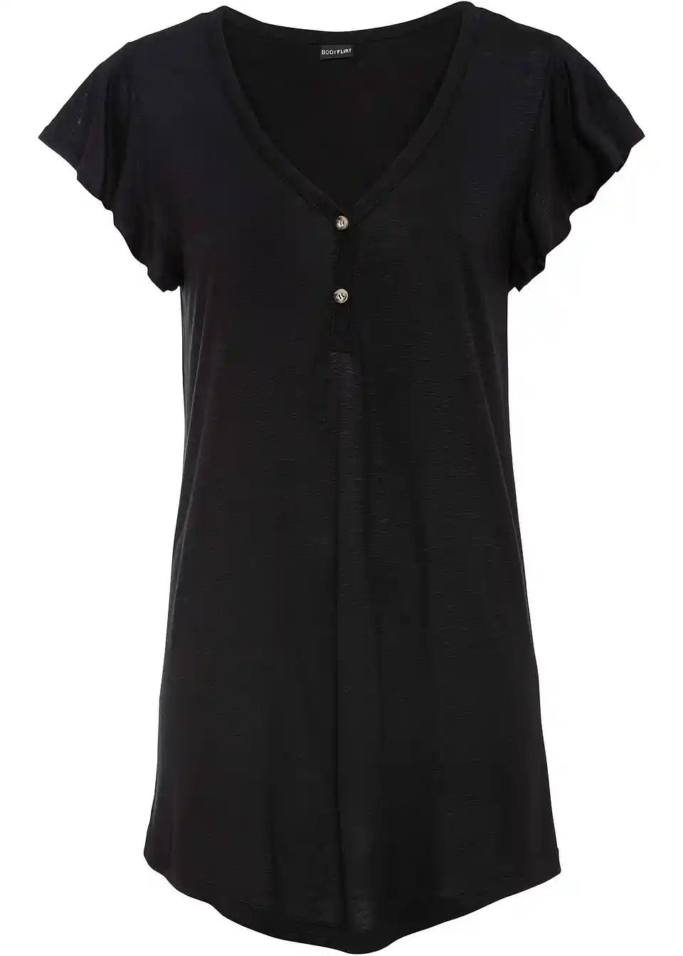 Ta dolga majica s gumbi je udobna za nošenje v toplih dneh. Zaradi dolge oblike deluje zgornji del posebej laskavo. Majhni krilni rokavi in podrobnosti z gumbi na V-izrezu dajejo majici BODYFLIRT njen ženstven slog. Mehko padajoča tkanina ima rahlo melanž videz. V kombinaciji s hlačami širšega kroja je poletna oprava popolna.
