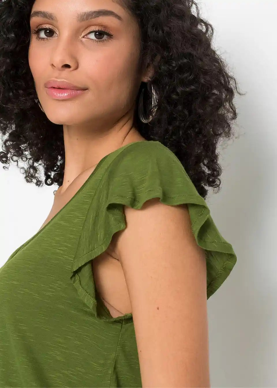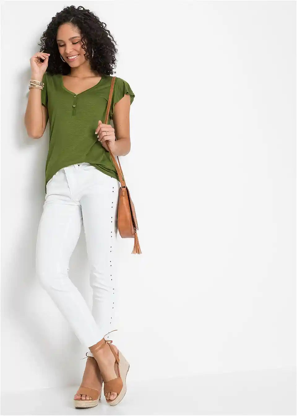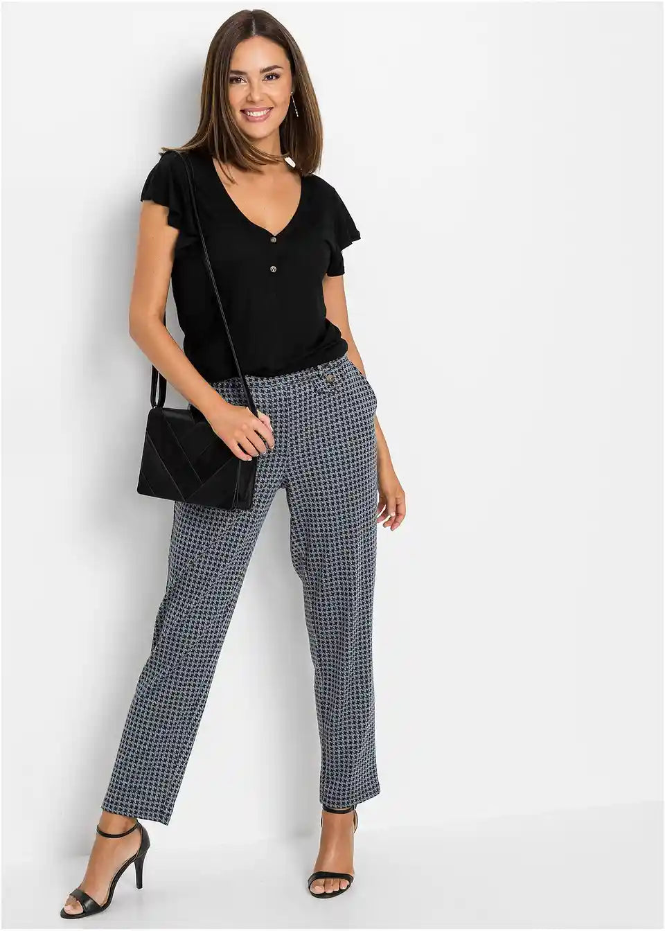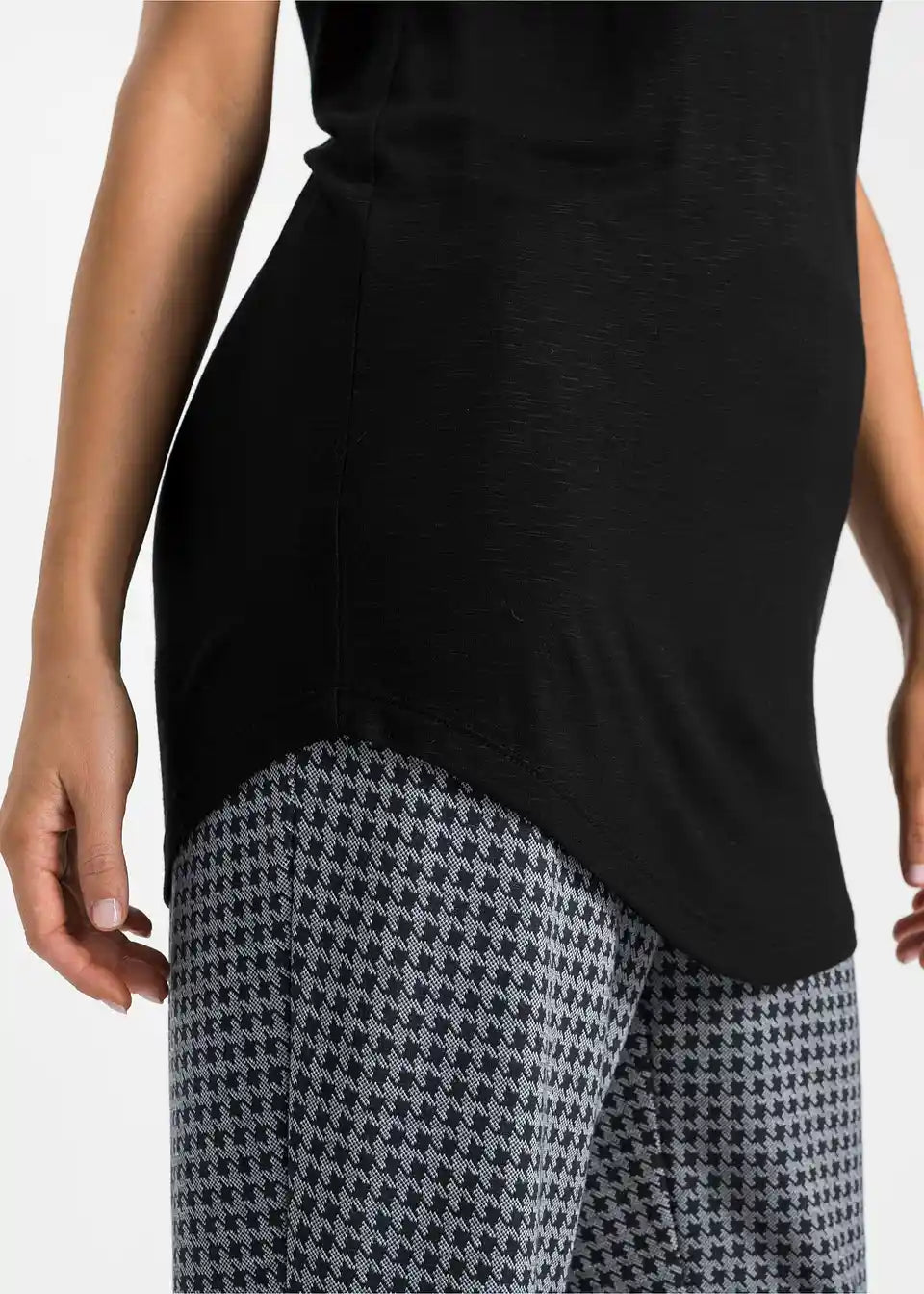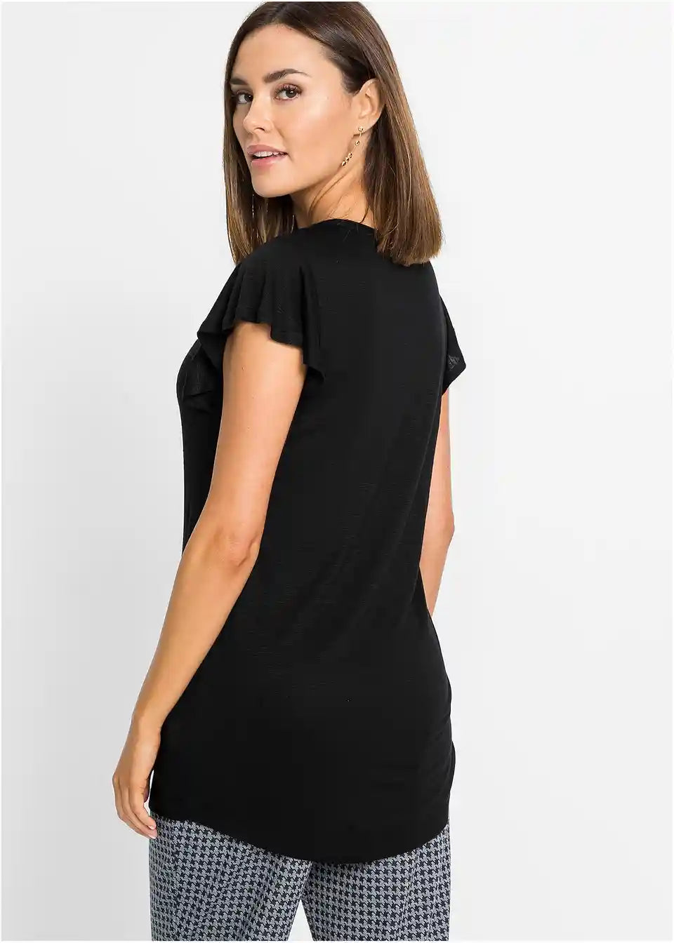 Ta dolga majica s gumbi je udobna za nošenje v toplih dneh. Zaradi dolge oblike deluje zgornji del posebej laskavo. Majhni krilni rokavi in podrobnosti z gumbi na V-izrezu dajejo majici BODYFLIRT njen ženstven slog. Mehko padajoča tkanina ima rahlo melanž videz. V kombinaciji s hlačami širšega kroja je poletna oprava popolna.
