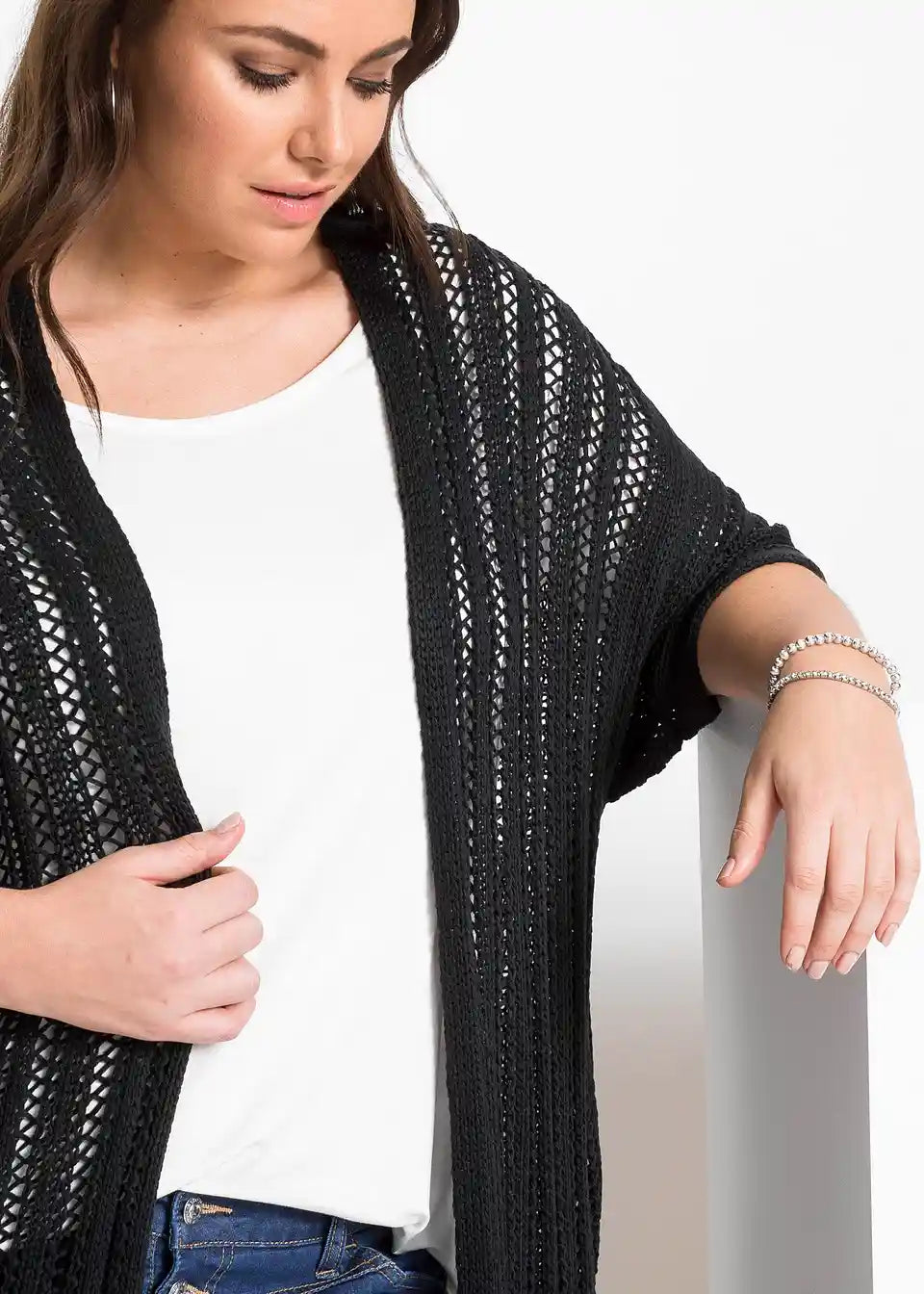 Dolga pletena jopa z luknjičastim vzorcem