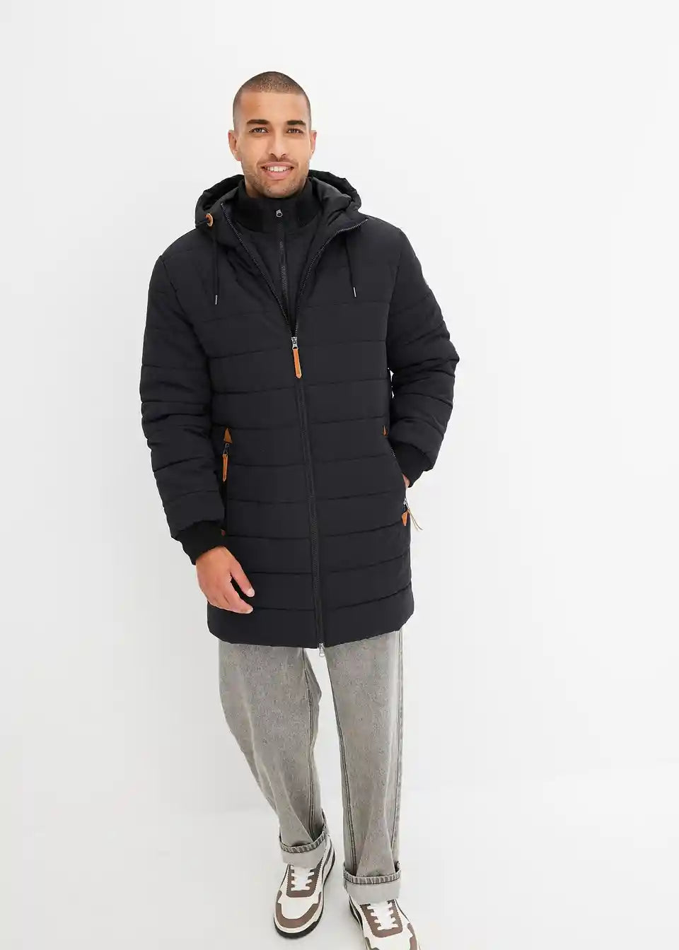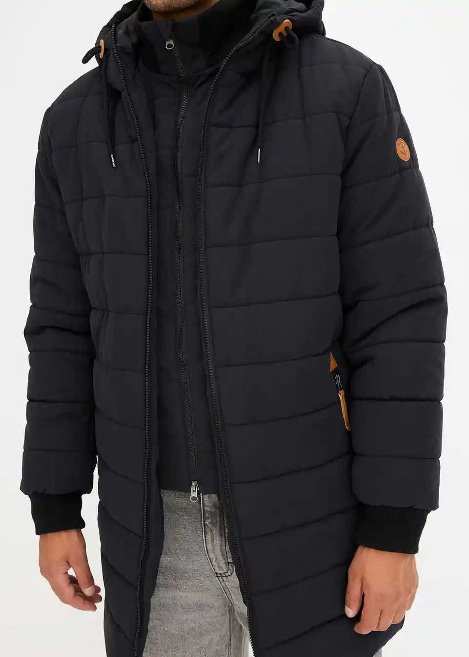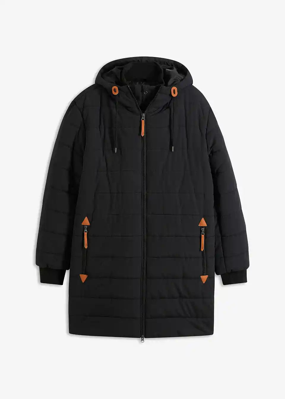Dolga prešita jakna s kapuco in zaščito pred vetrom